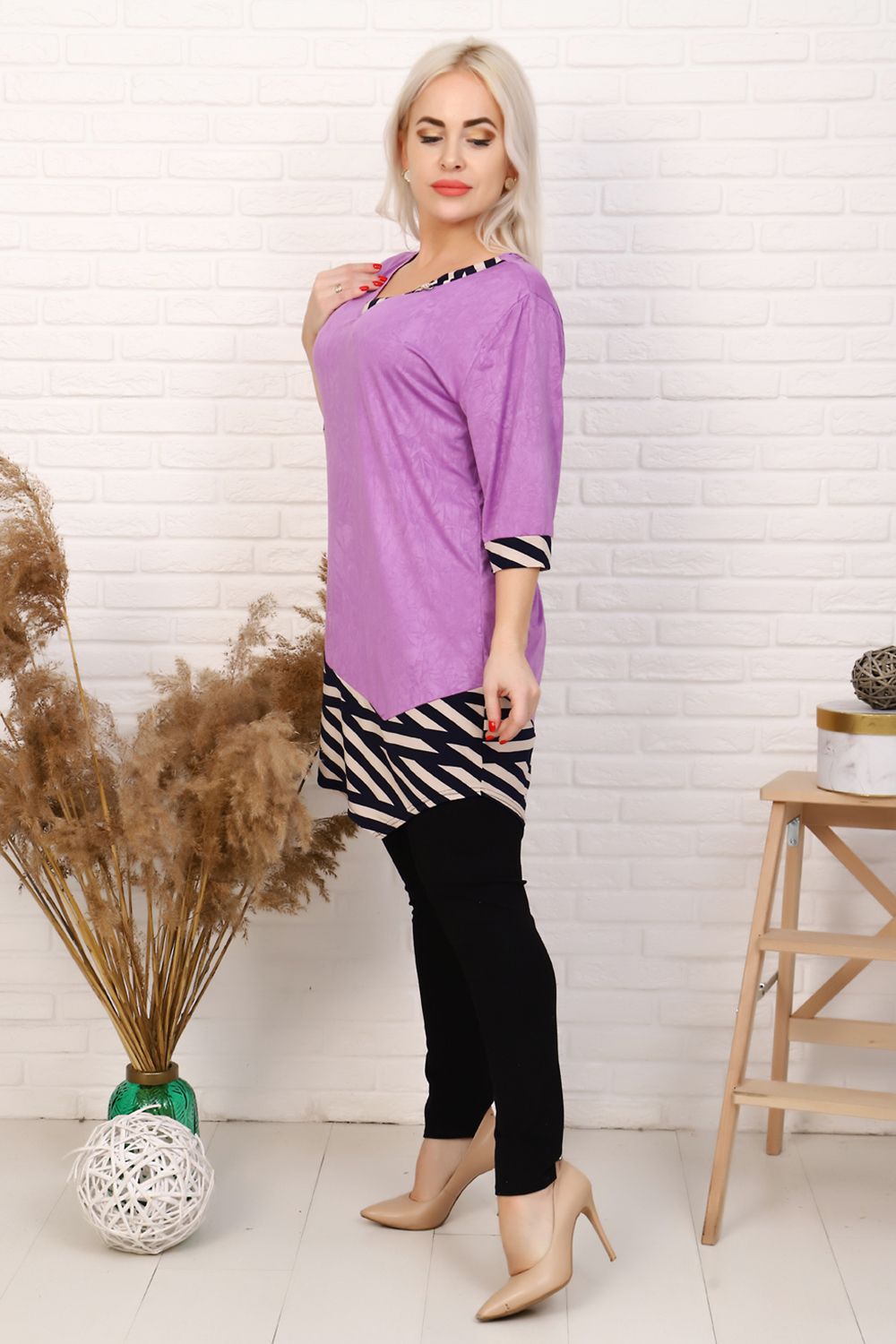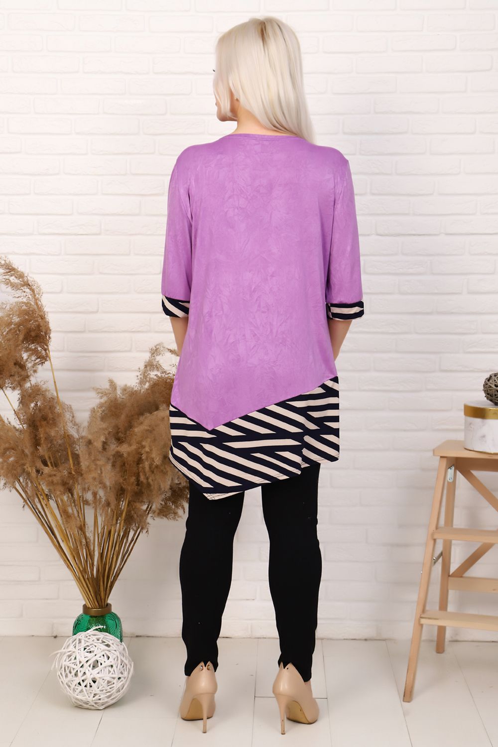Туника из масла свободного кроя, 3/4 рукав на манжете, V-образная горловина украшена брошью, низ изделия со скошенными углами
