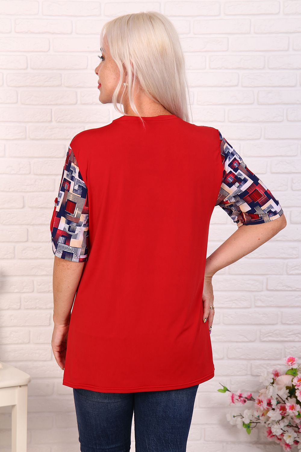 Повседневная комбинированная туника. Рукав короткий подобран на паты, вырез округлый отделан кантиком.