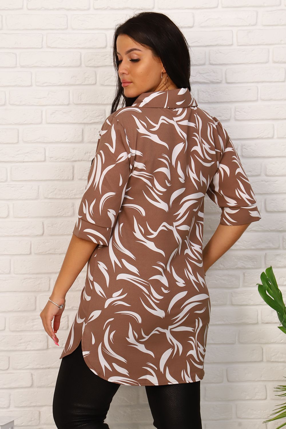 Легкая туника прямого покроя, рукава 34 на манжете. Воротник отложной, на полочке планка, украшенная декоративными пуговицами.