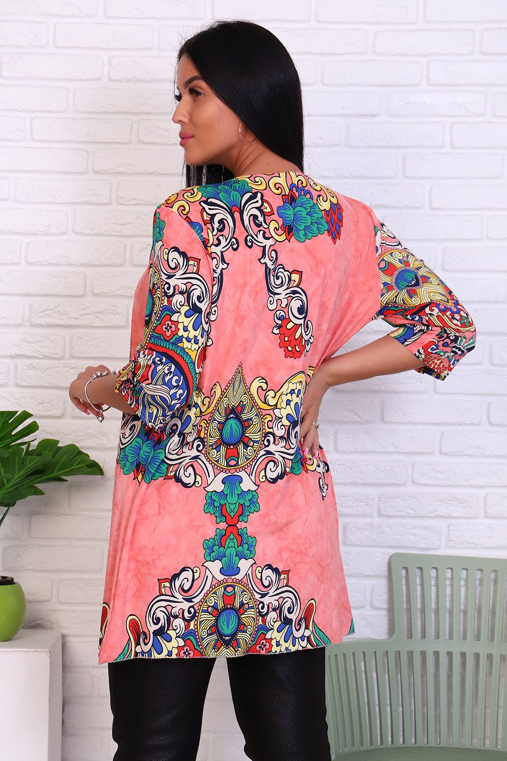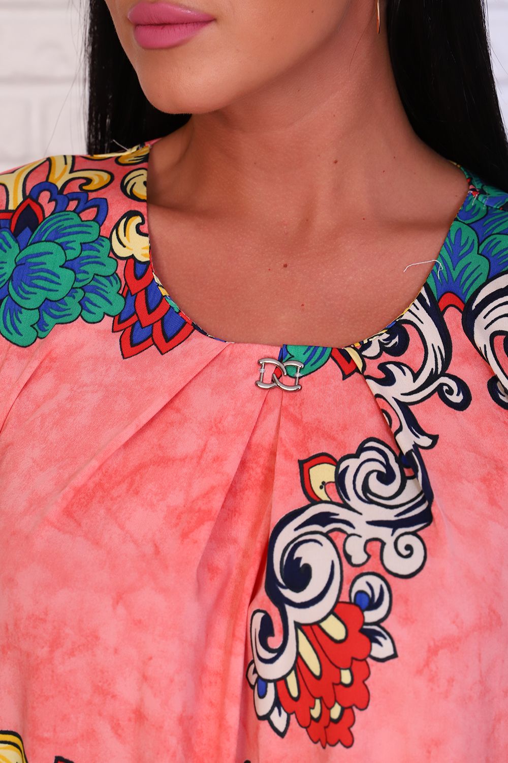 Женская туника свободного кроя. Округлая горловина. На передней полочке складки с декоративной брошкой, что делает тунику более свободной и привлекательной. Рукав 3/4 на патах. Низ изделия отделан кудрявкой. Данная модель будет радовать своим комфортом каждый день.
