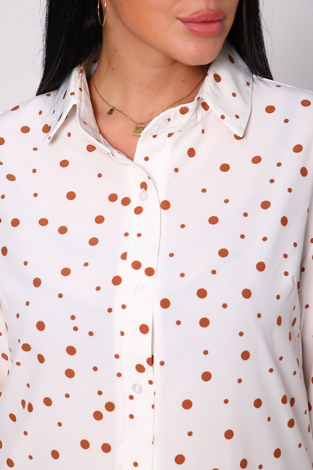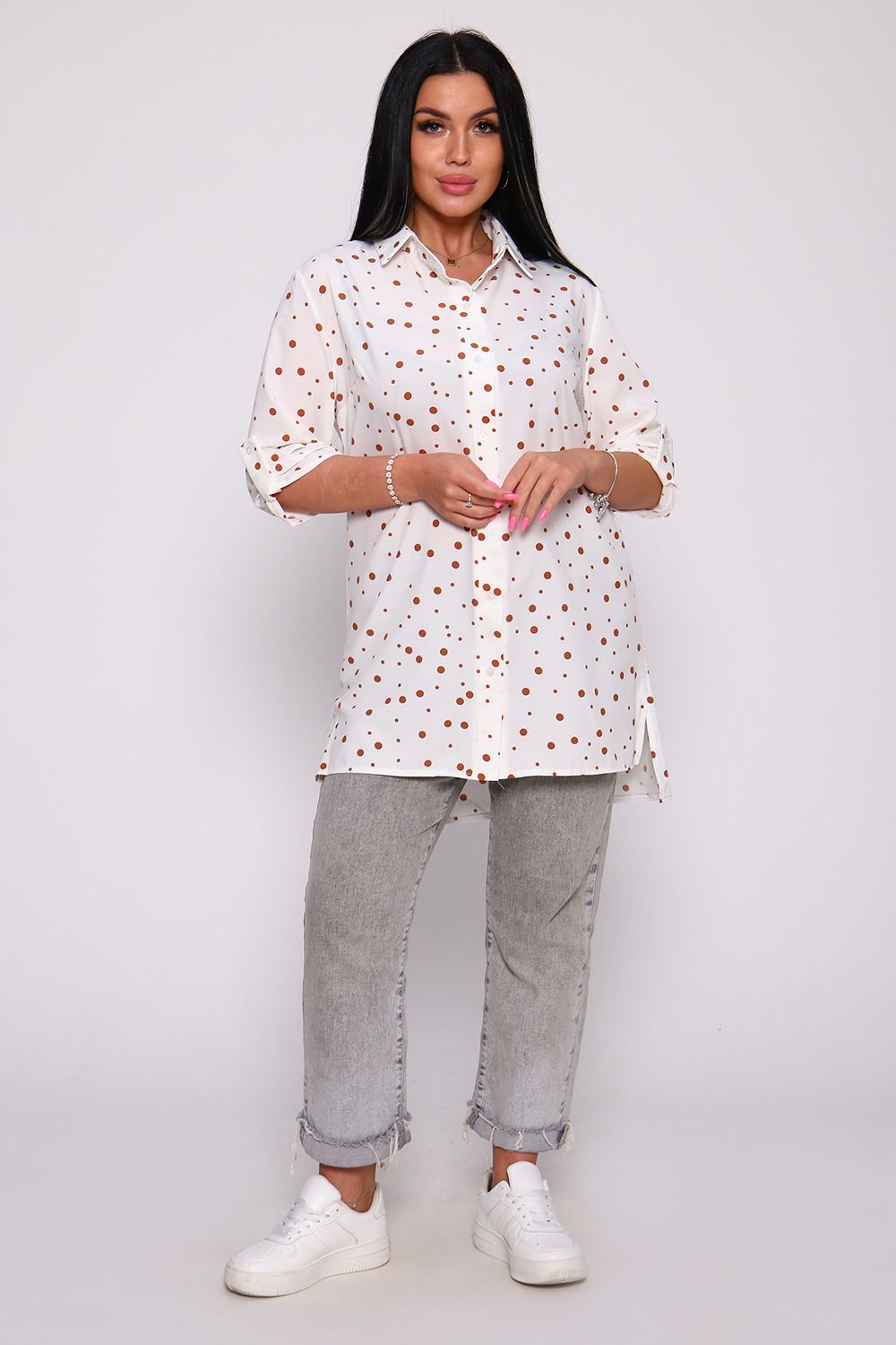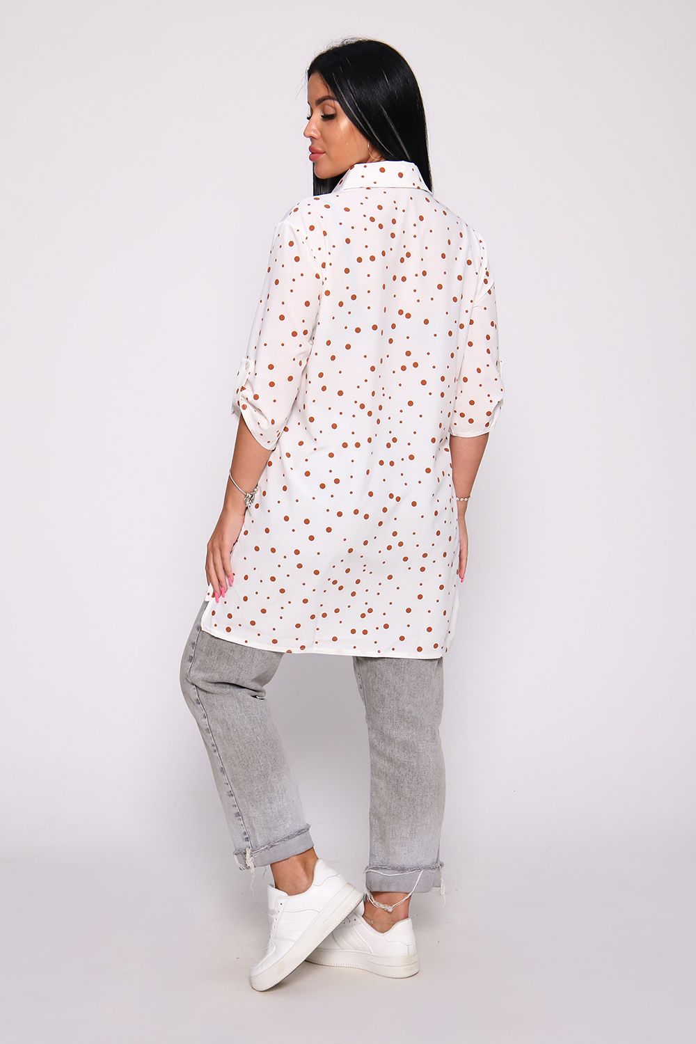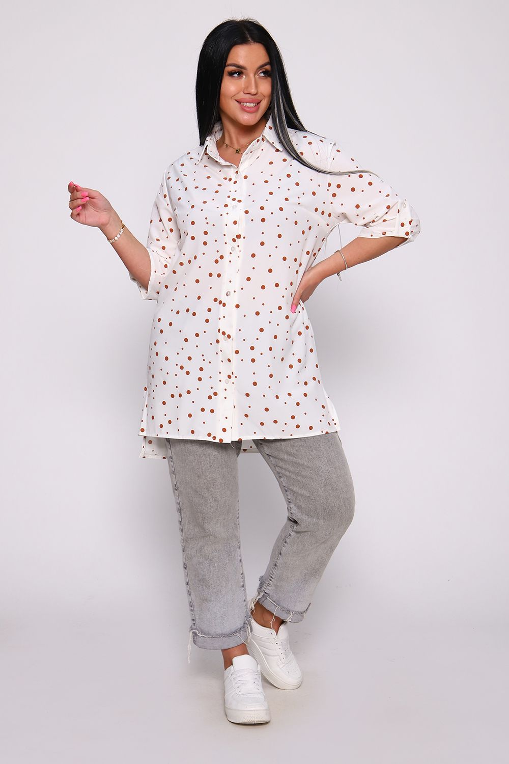 Туника рубашечного кроя с рисунком горох всегда актуальна, ее можно надеть как с джинсами, так и лосинами. Рукава подобраны на паты. Низ изделия фигурный.