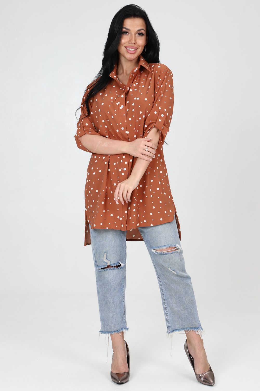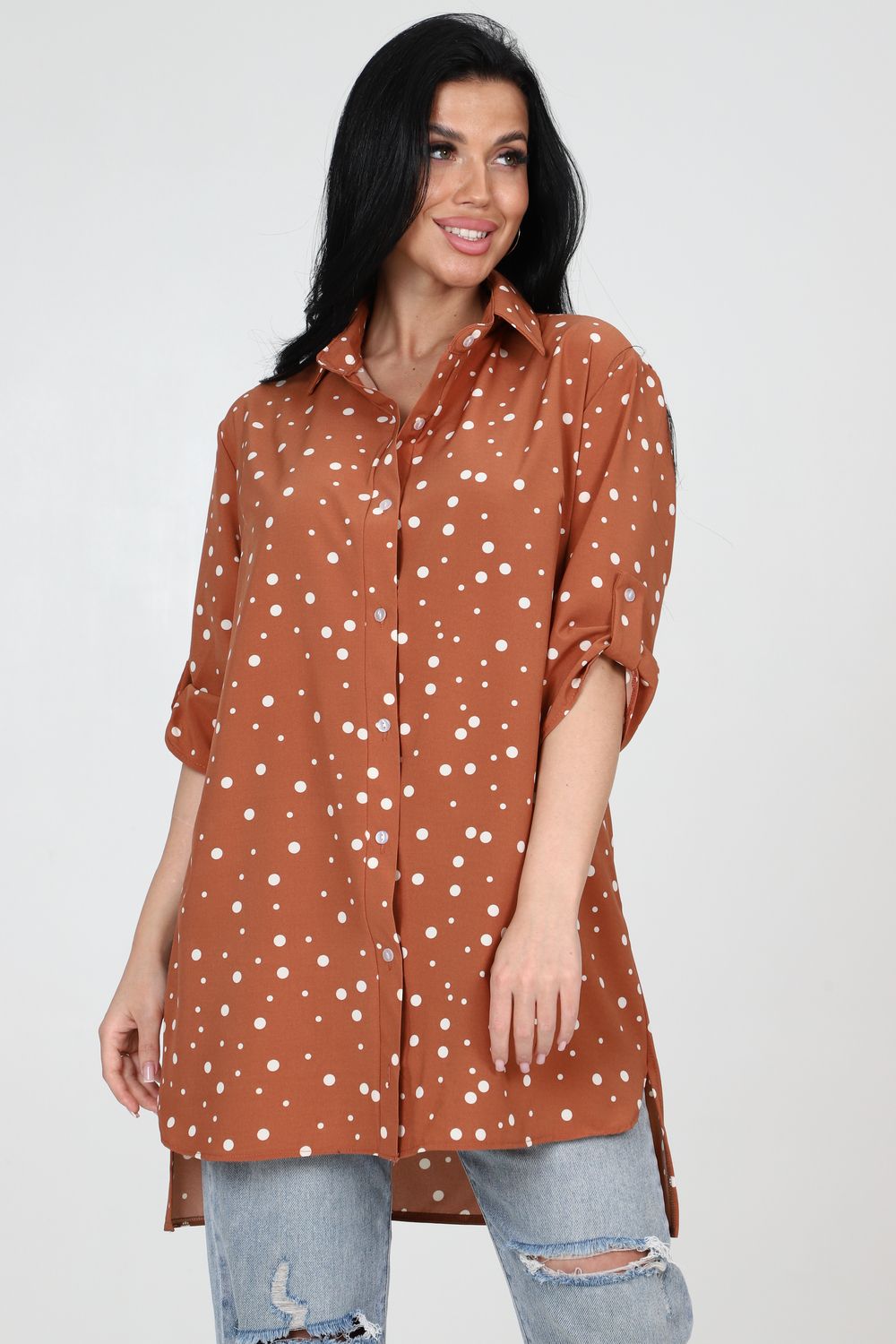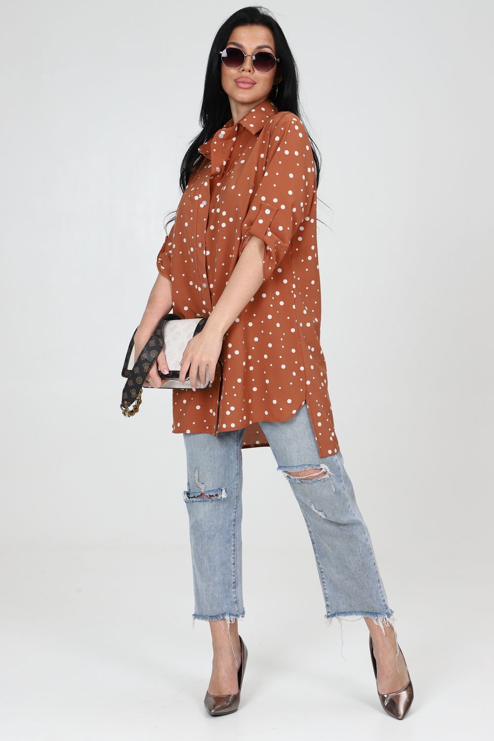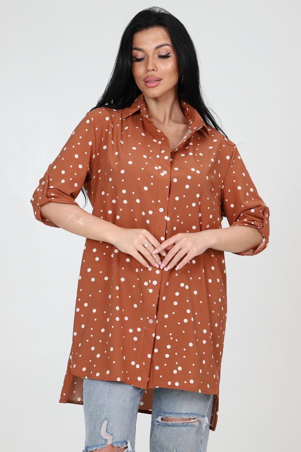 Туника рубашечного кроя с рисунком горох всегда актуальна, ее можно надеть как с джинсами, так и лосинами. Рукава подобраны на паты. Низ изделия фигурный.
