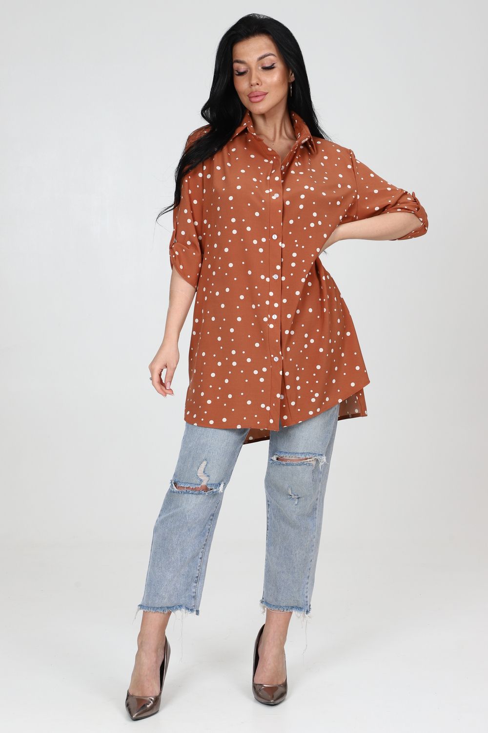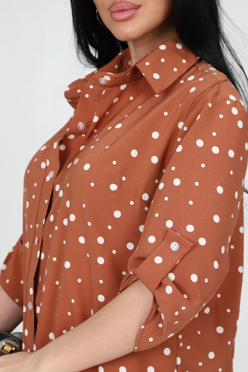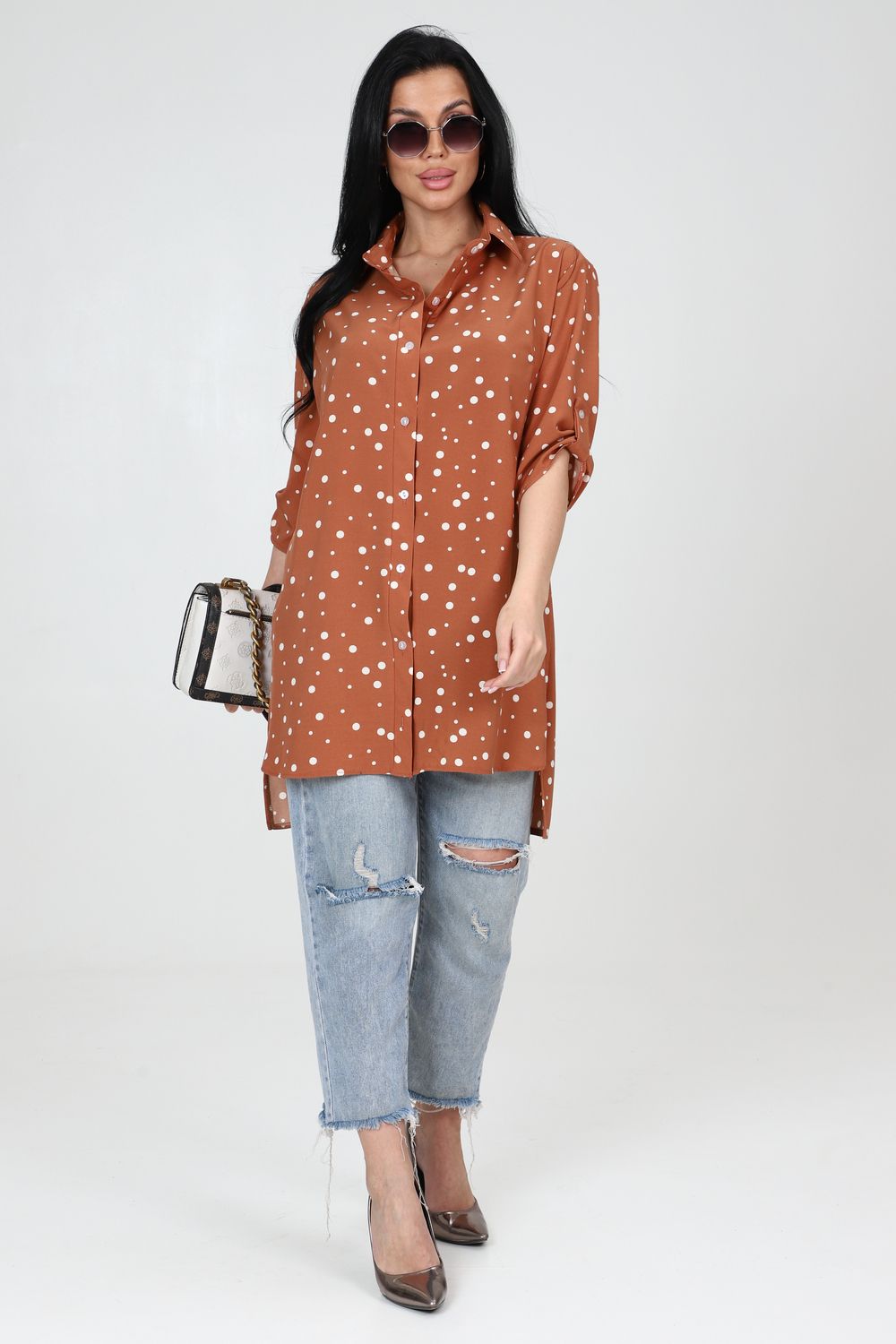 Туника рубашечного кроя с рисунком горох всегда актуальна, ее можно надеть как с джинсами, так и лосинами. Рукава подобраны на паты. Низ изделия фигурный.