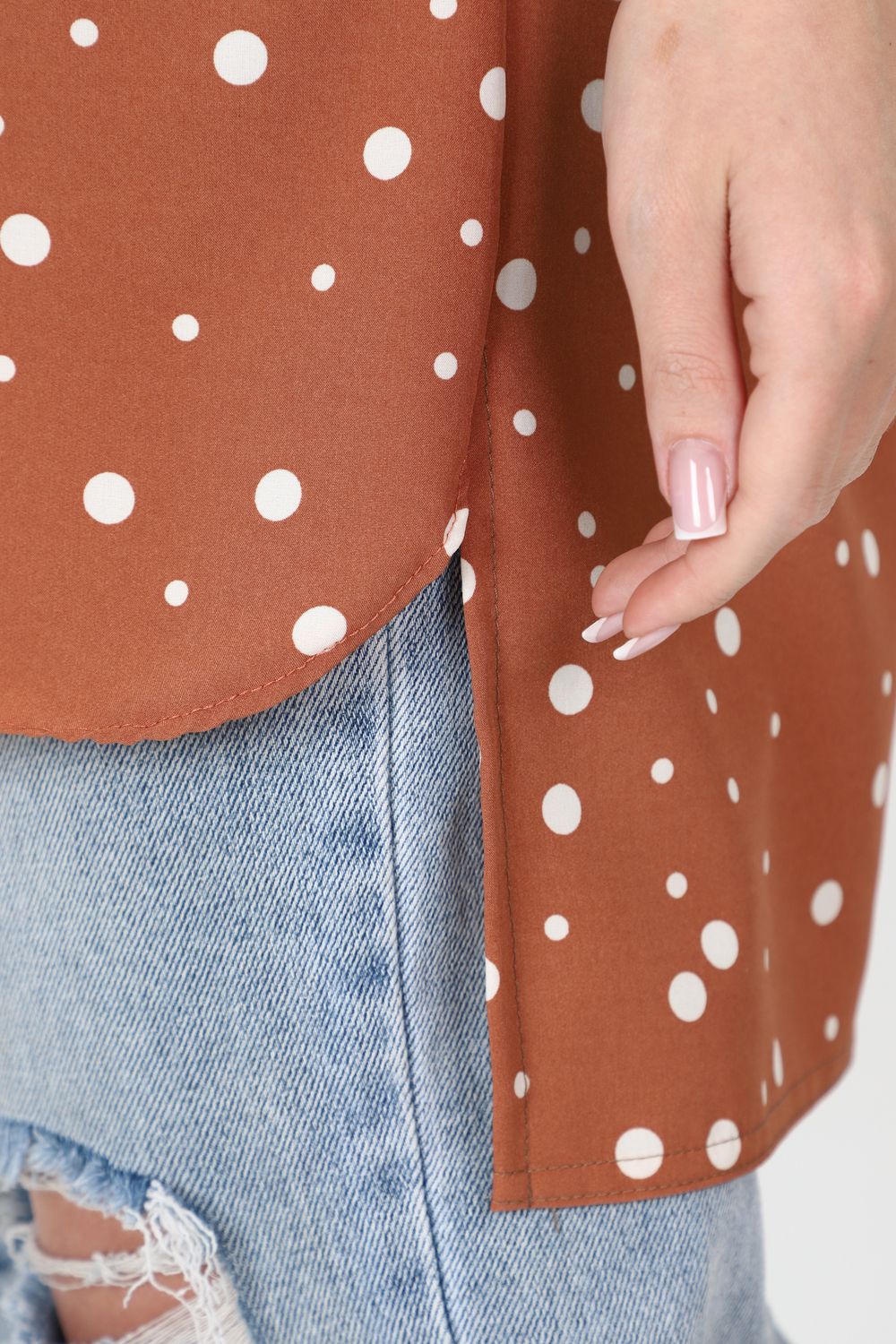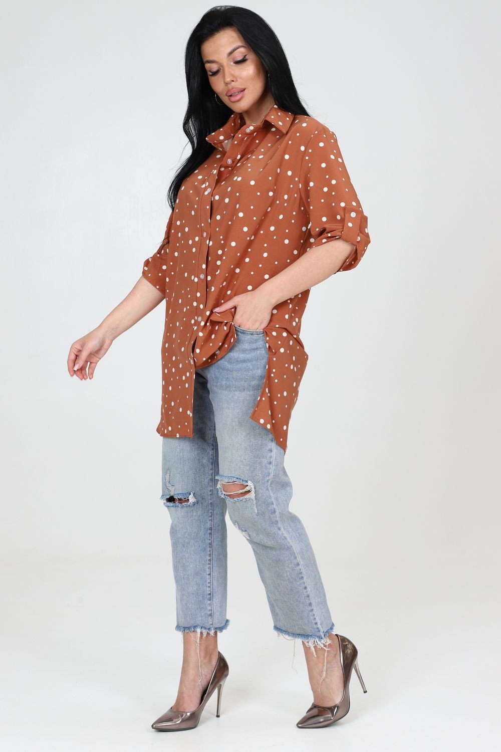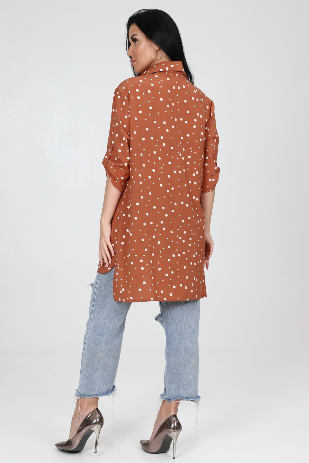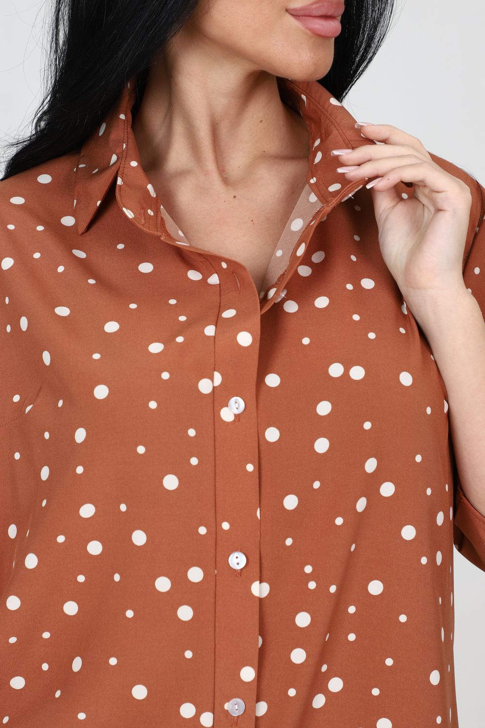 Туника рубашечного кроя с рисунком горох всегда актуальна, ее можно надеть как с джинсами, так и лосинами. Рукава подобраны на паты. Низ изделия фигурный.