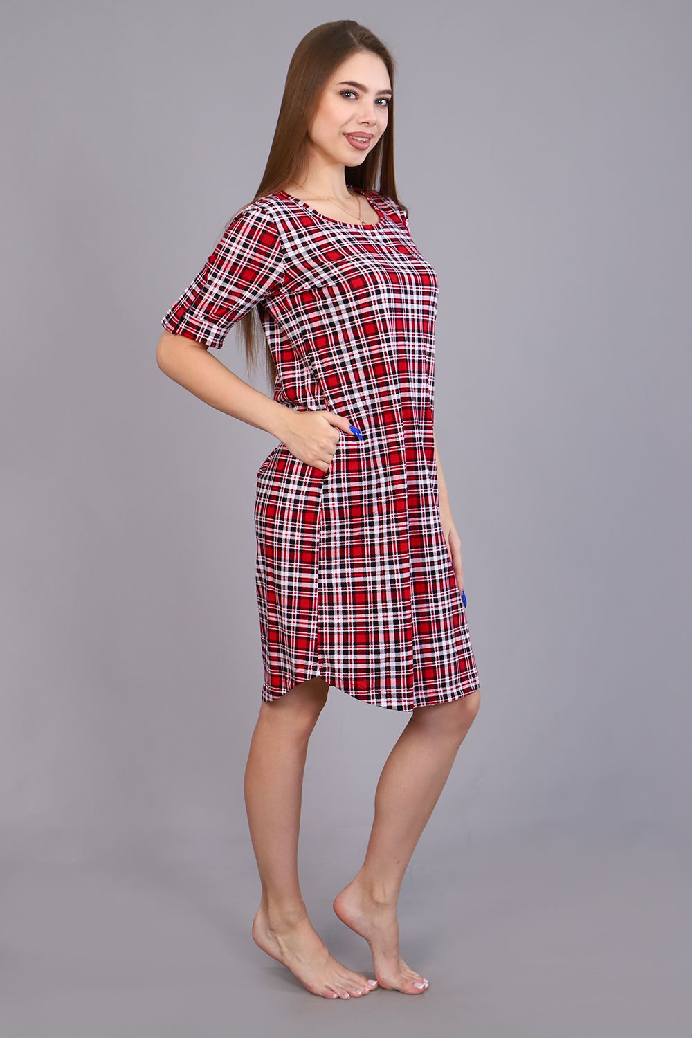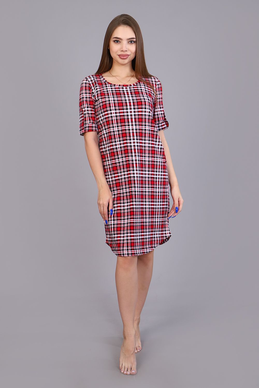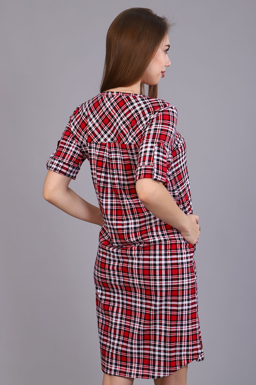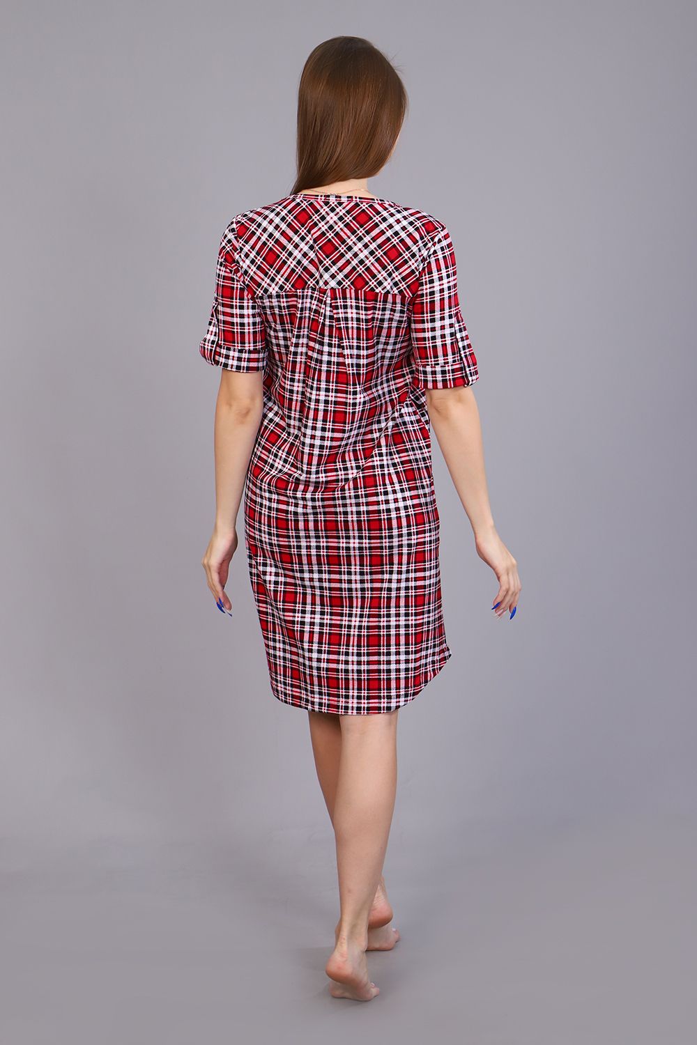 Домашняя туника полуприлегающего силуэта с короткими рукавами и отворотными манжетами удерживаемыми декоративными патами. Вырез горловины круглый. Спинка со встречной складкой посередине и отрезной кокеткой. Низ изделия фигурный.