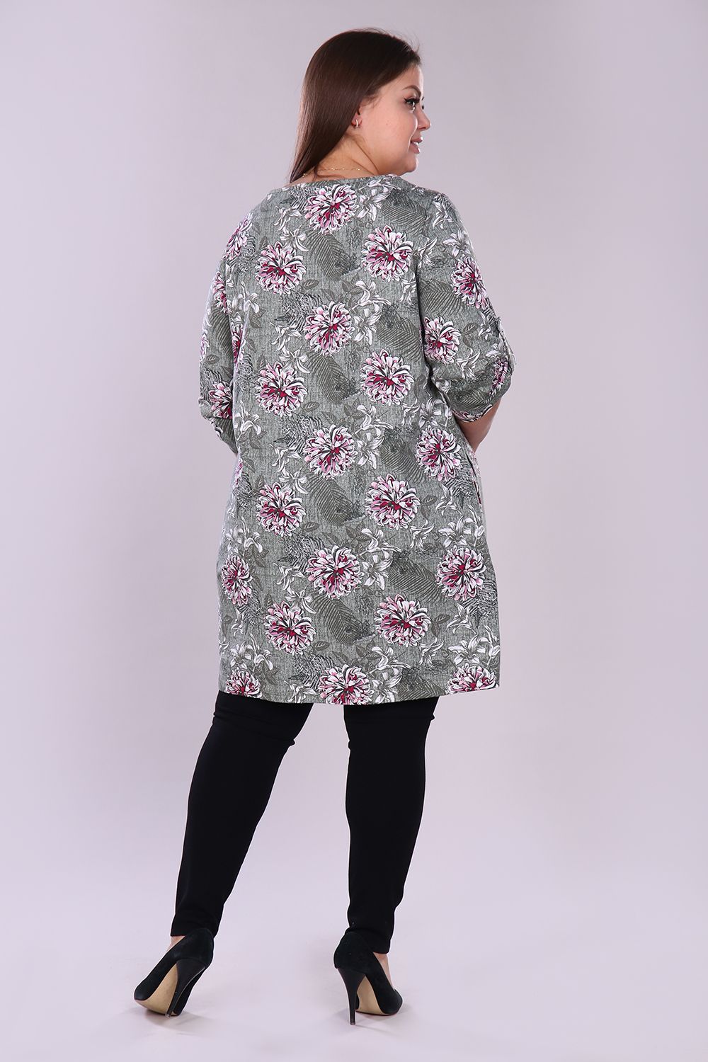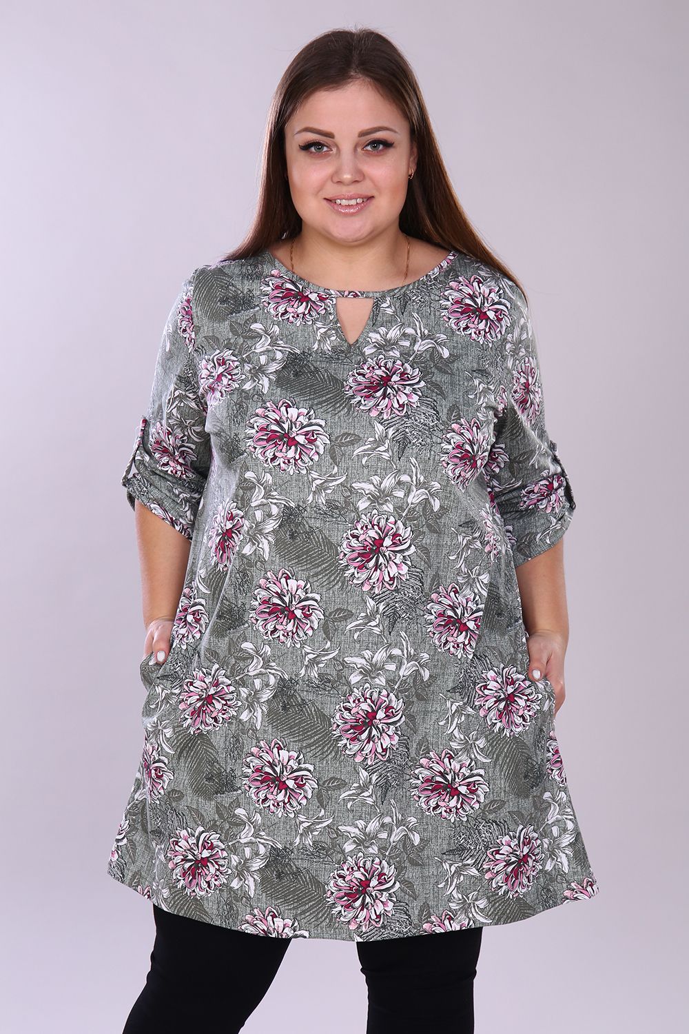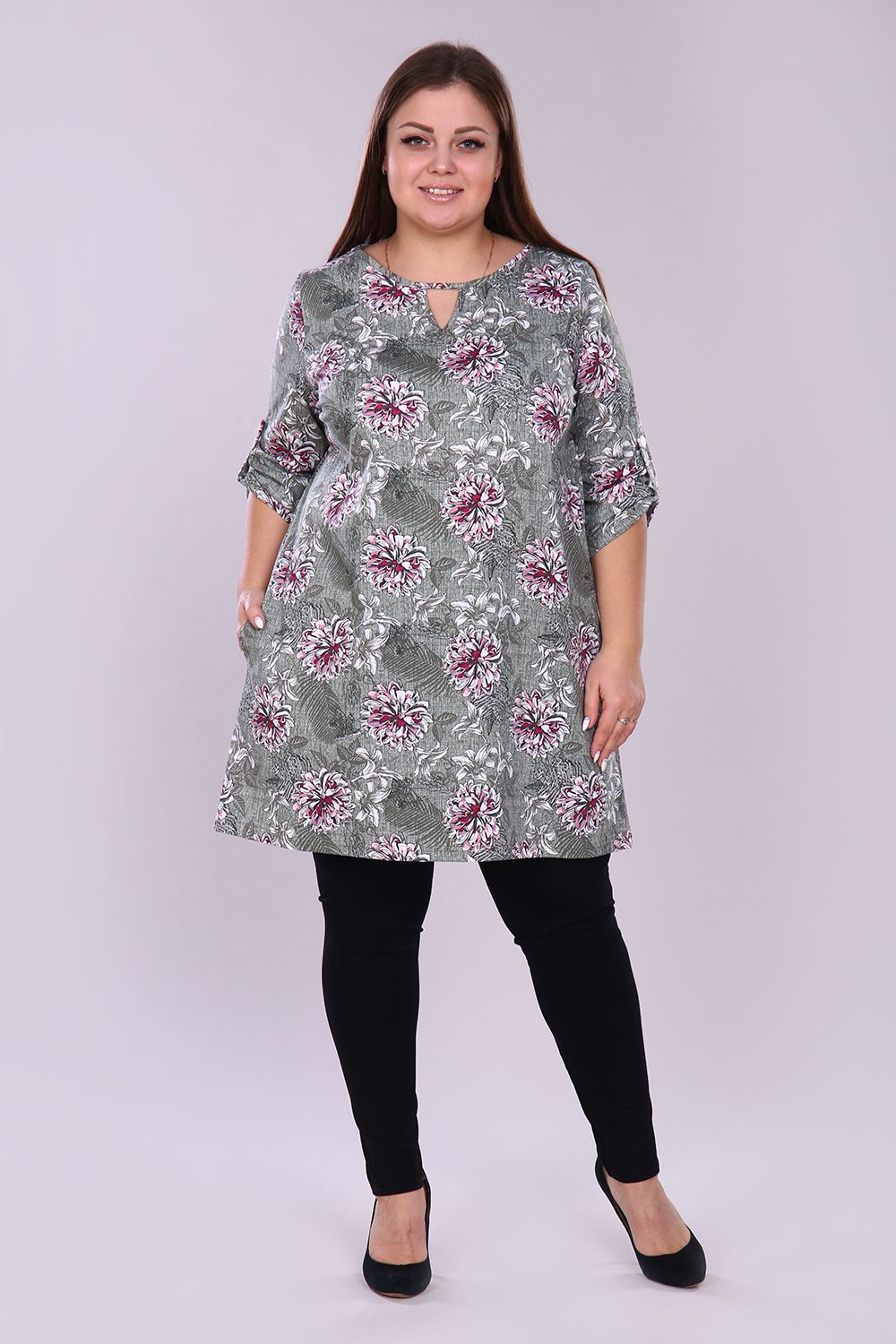 Удлинённая женская туника свободного кроя выполнена из 100% хлопчатобумажного полотна. По горловине расположен треугольный вырез, рукав 3/4. На рукавах имеются паты, закреплённые светлыми серебристыми пуговицами, что делает изделие более привлекательным. Данная туника для полноразмерных дам помогает скрыть недостатки фигуры и подчеркнуть достоинства, тем самым создавая стильный образ, в котором Вы будете чувствовать себя максимально комфортно и уверенно. На модели 52 размер
