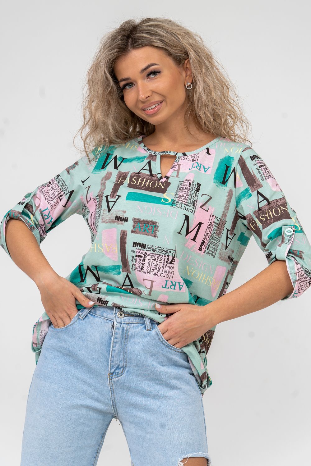 Женская туника свободного силуэта выполнена из 100% хлопчатобумажного полотна. Модный дизайн ткани, округлая горловина с треугольным вырезом, паты на рукавах и по низу изделия делают тунику удобной и по своему привлекательной. Современная туника - это почти неотъемлемая часть гардероба любой женщины, в которой собраны все её неоспоримые достоинства - универсальность, удобство, красота и многовариантность.