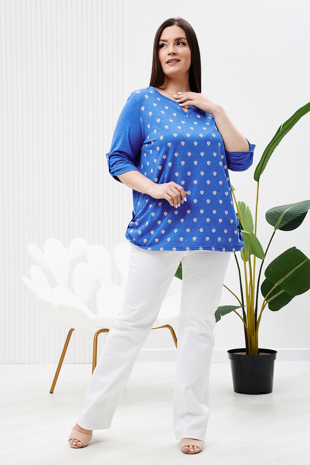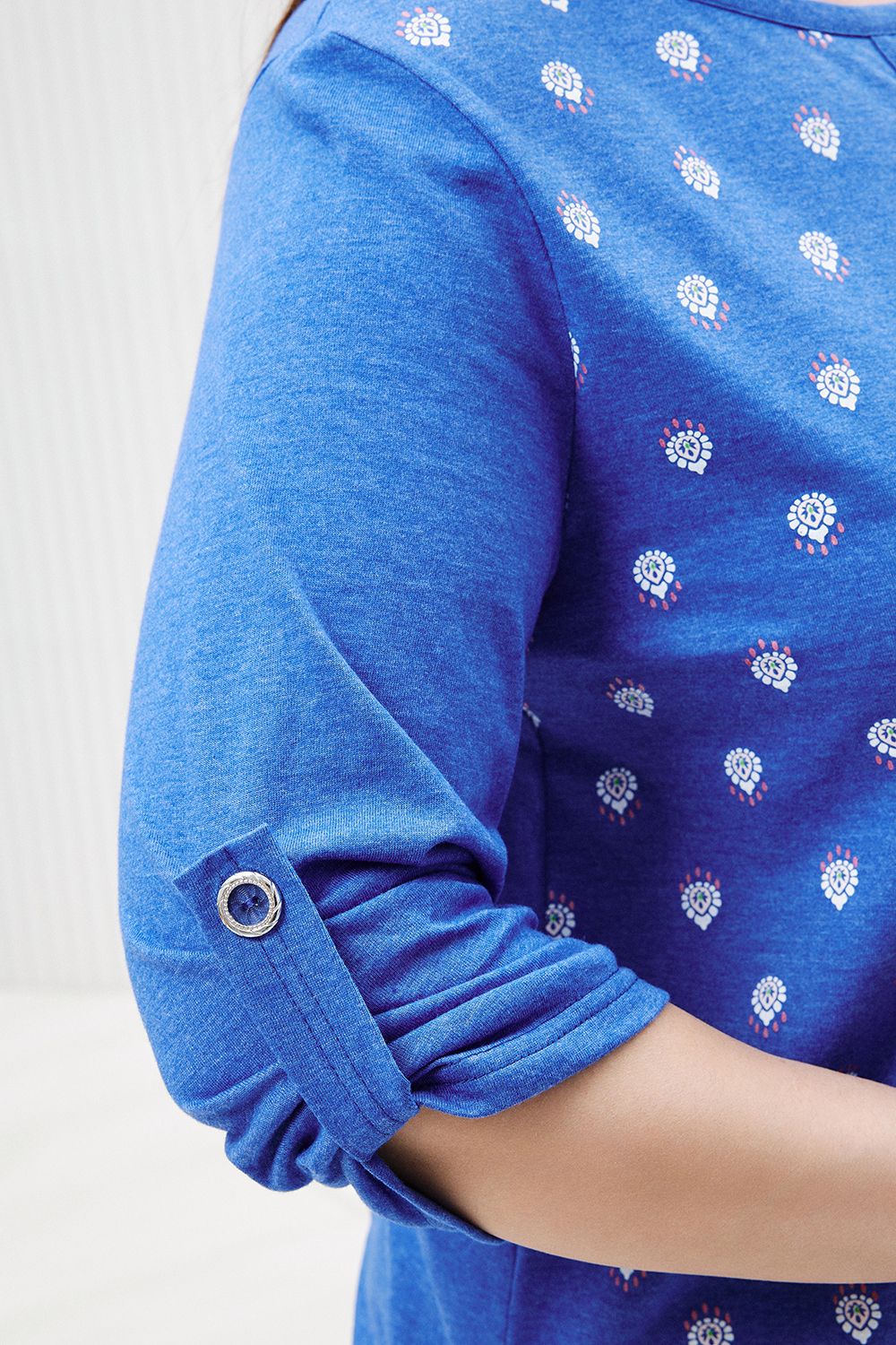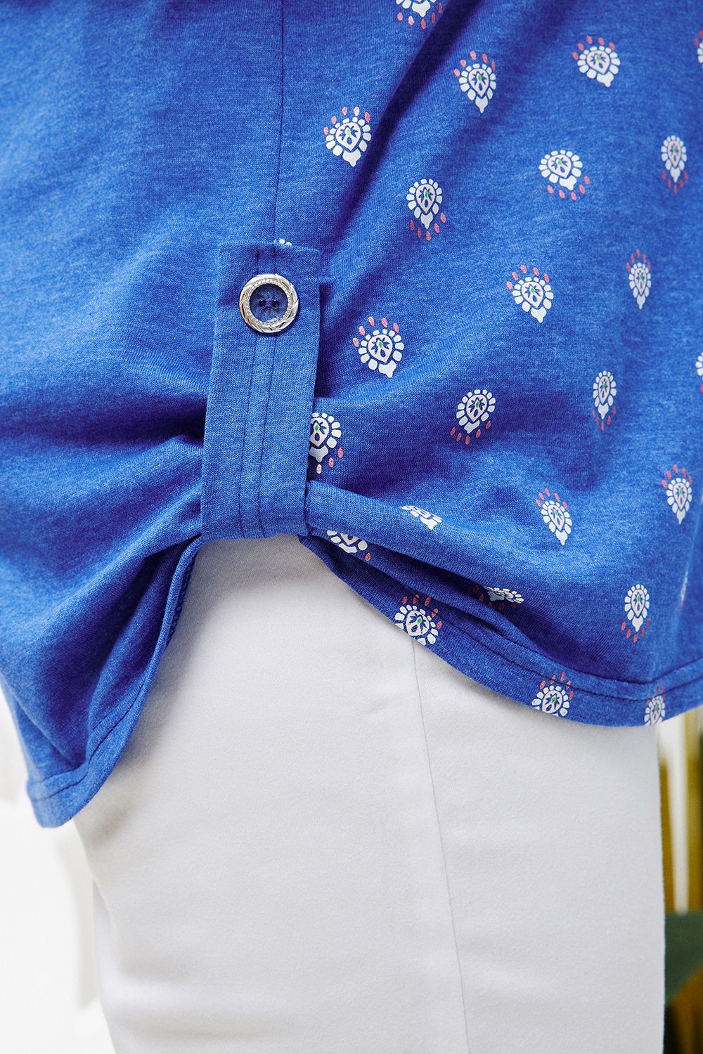 Туника женская прямого свободного кроя, состав 50% хлопок, 50% ПЭ. Горловина туники круглая с фигурной капелькой обработана окантовкой, рукав туники 3/4 с хлястиком на декоративной пуговице, низ обработан на плоскошовной машине, по бокам низа хлястики с декоративными пуговицами, на полочке печать. Туника легкая в уходе, подойдет для повседневной носки.