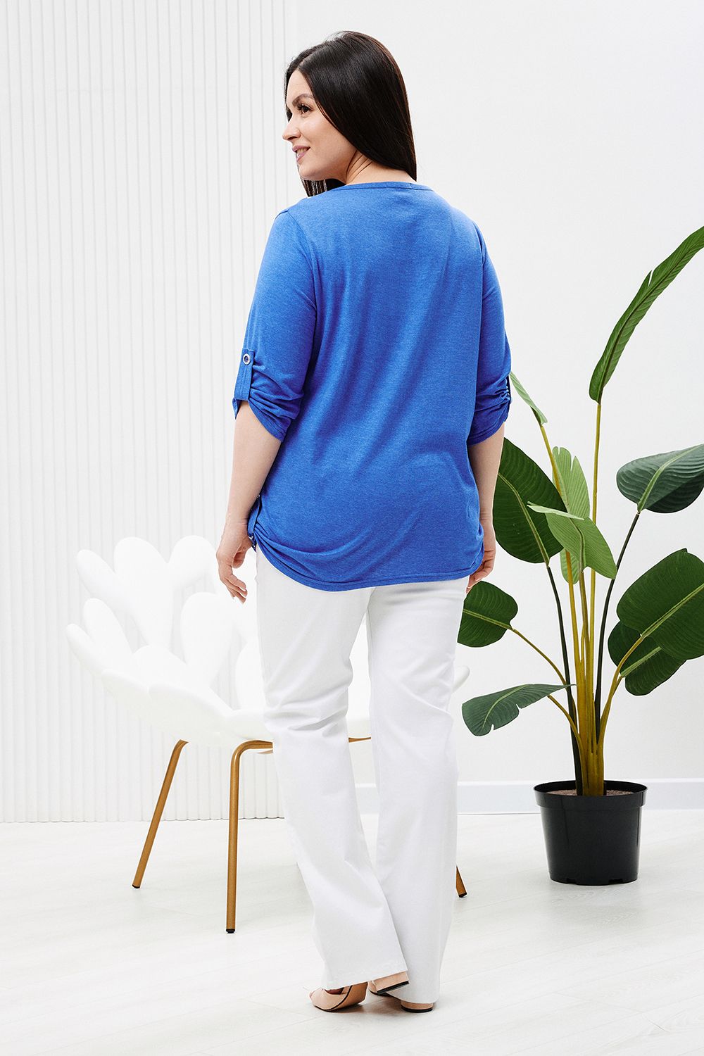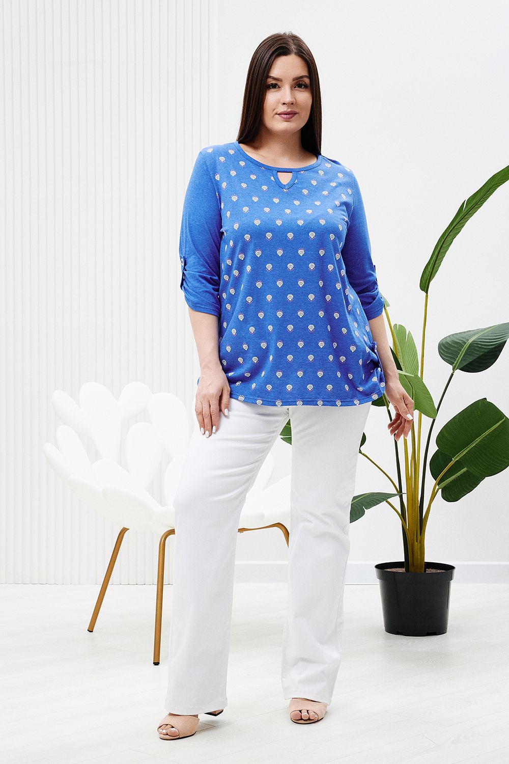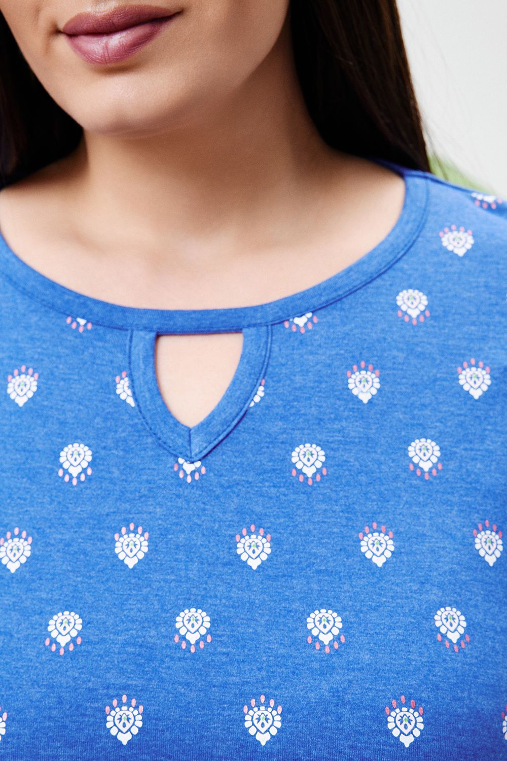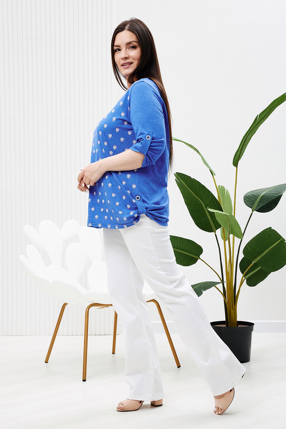 Туника женская прямого свободного кроя, состав 50% хлопок, 50% ПЭ. Горловина туники круглая с фигурной капелькой обработана окантовкой, рукав туники 3/4 с хлястиком на декоративной пуговице, низ обработан на плоскошовной машине, по бокам низа хлястики с декоративными пуговицами, на полочке печать. Туника легкая в уходе, подойдет для повседневной носки.