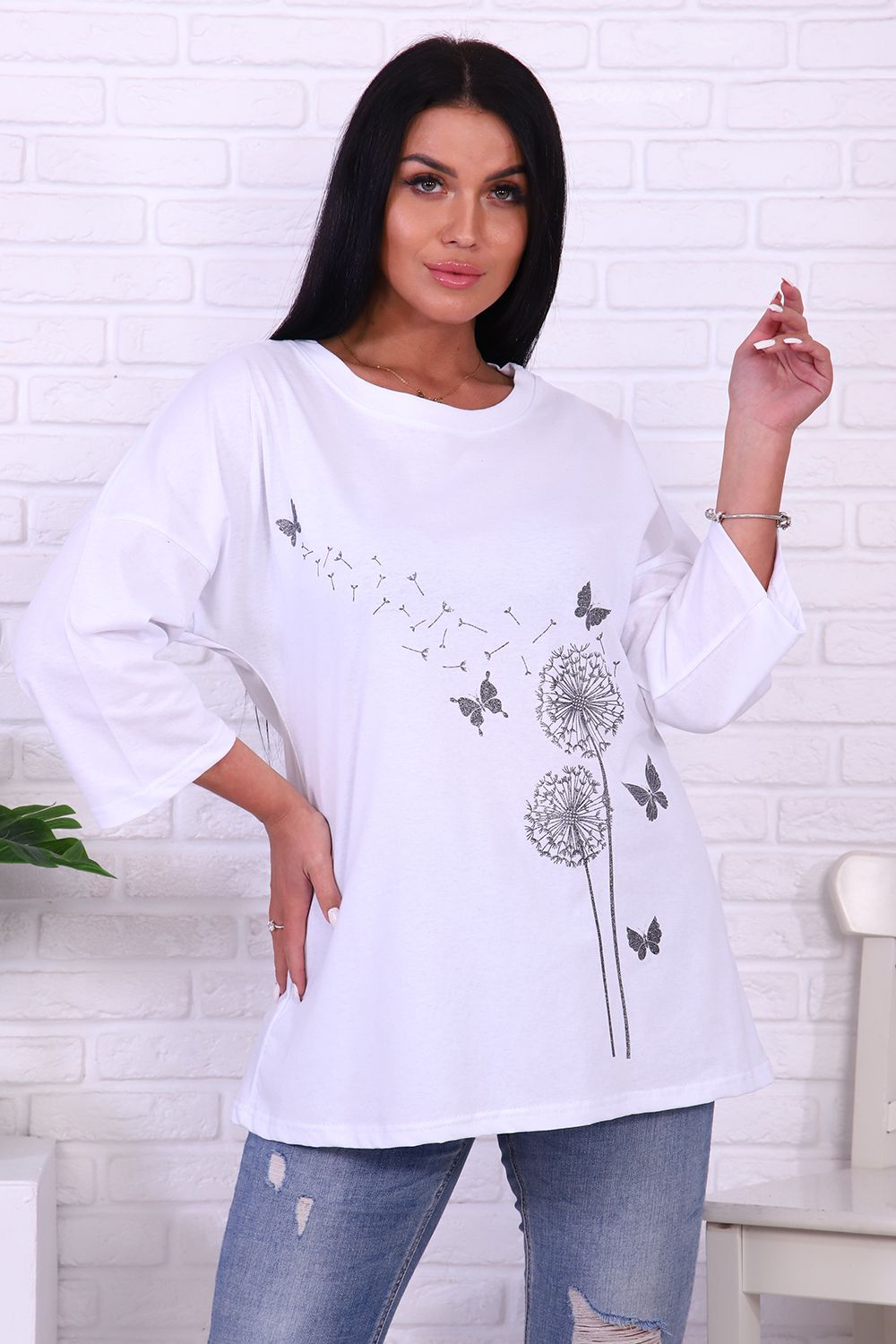 Туника выполнена из мягкого хлопка с нежным принтом одуванчиков, присыпанным глиттером. Модель свободного кроя, рукав 3/4, горловина втачная, низ и рукава вподгибку.