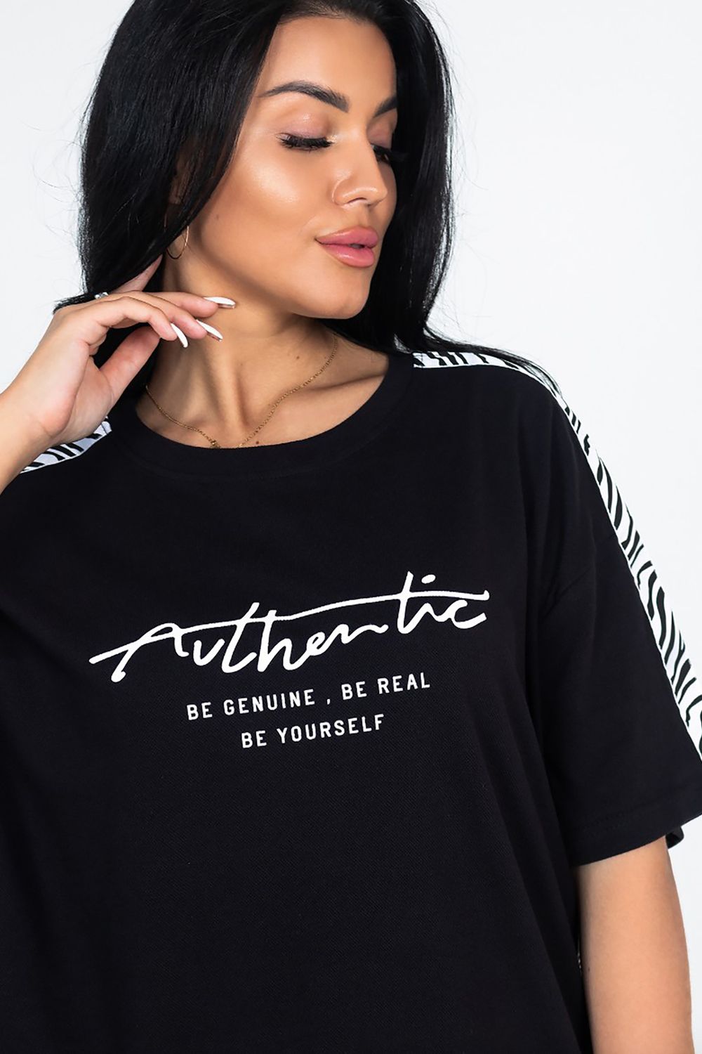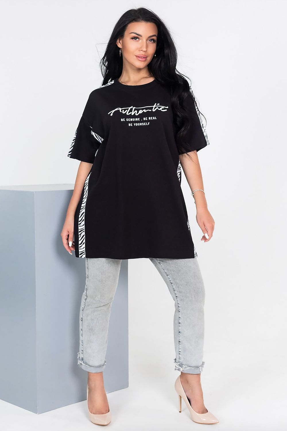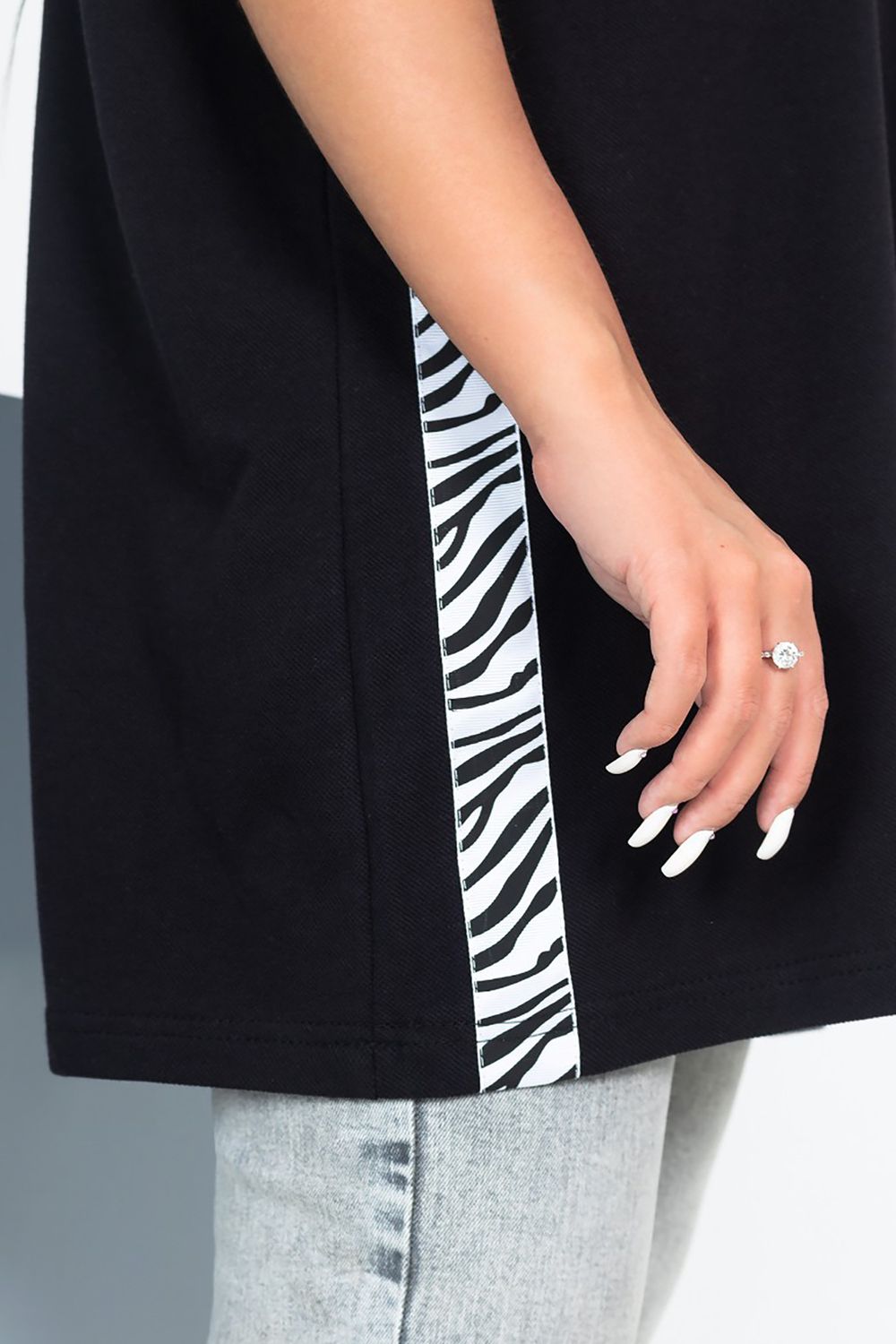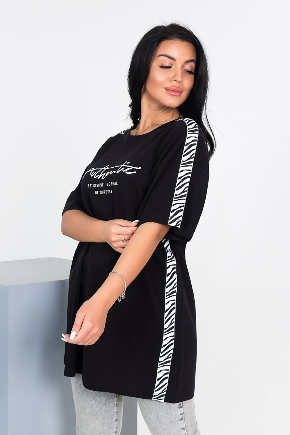 Туника свободного кроя, вырез круглый, рукав короткий, принт расположен на передней части туники. Футболка украшена декоративной тесьмой. Тесьма пришита по плечевому срезу и переходит на рукав, так же тесьмой украшены боковые швы.