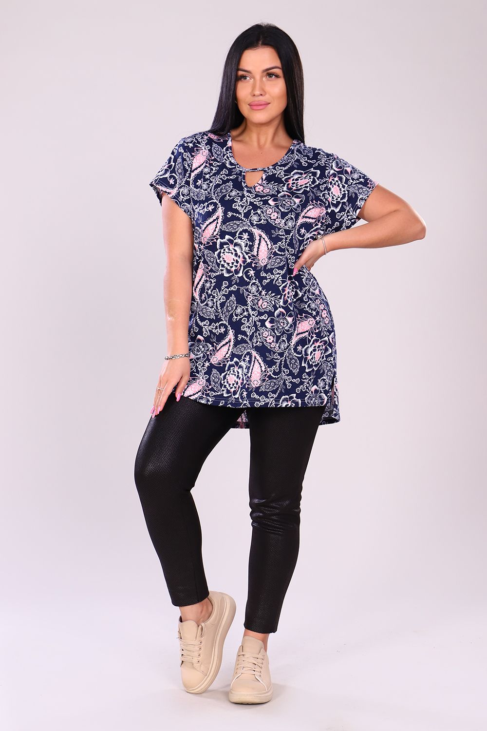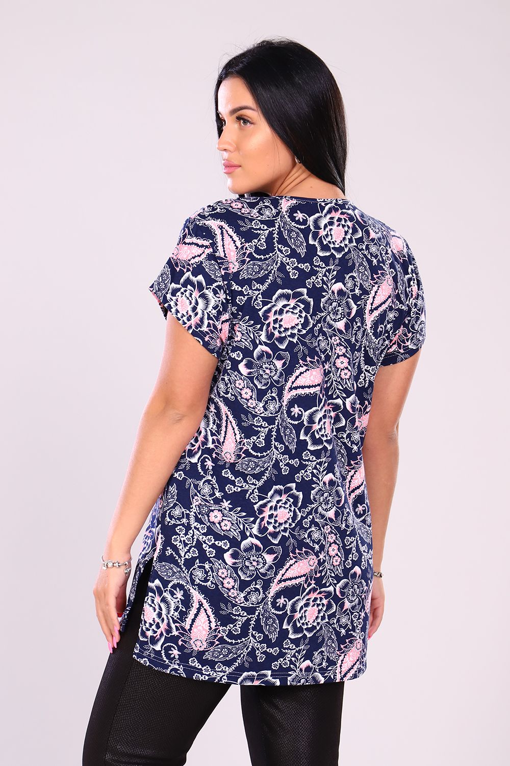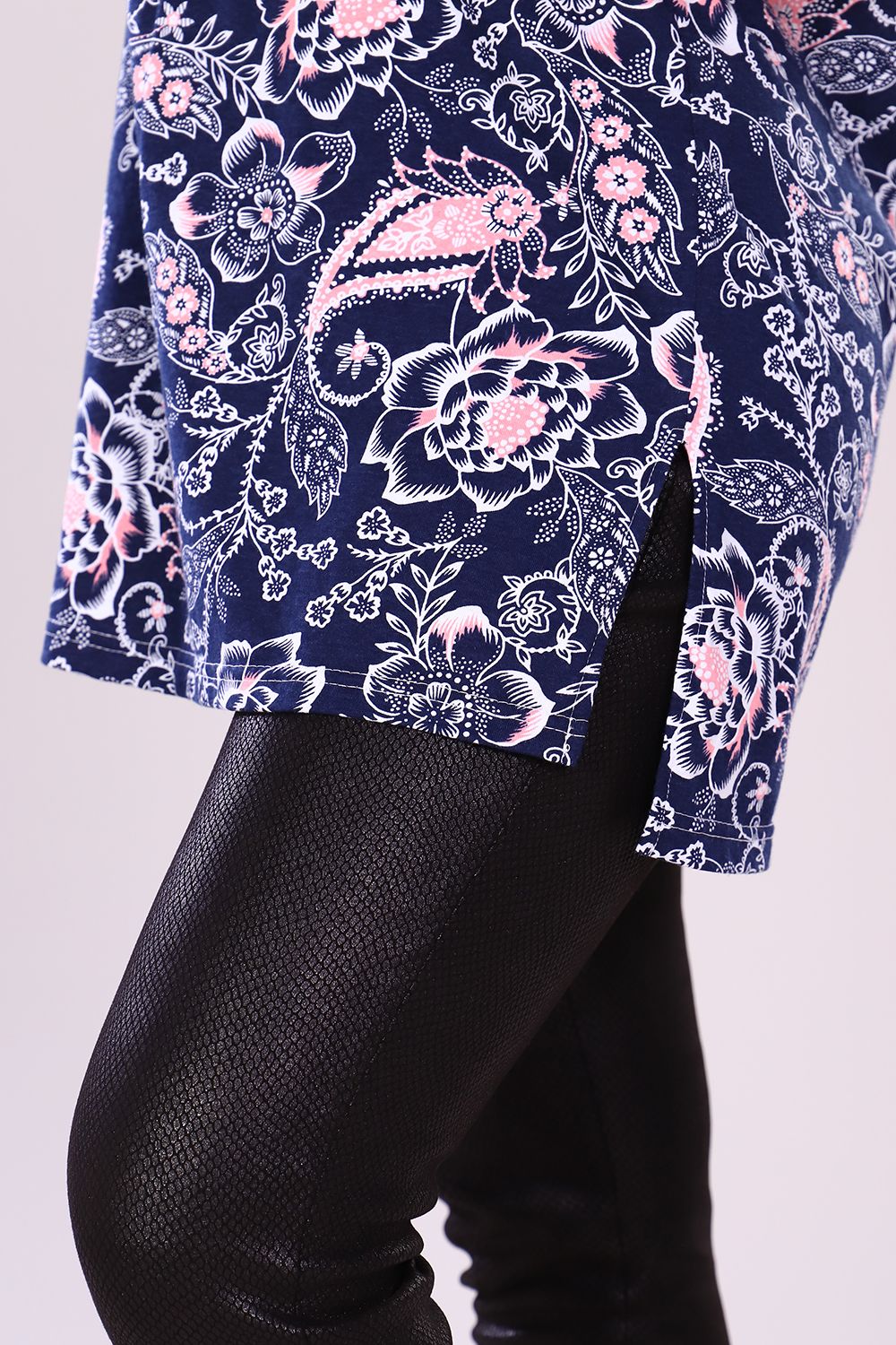 Туника женская прямого силуэта, короткий рукав. Горловина круглая, капелька на полочке отделаны бейкой. Туника удлиненная, по боковым швам разрезы. Туника с цветочным орнаментом подойдет к любому низу. Прекрасный вариант для повседневной носки.