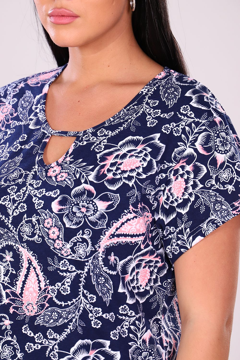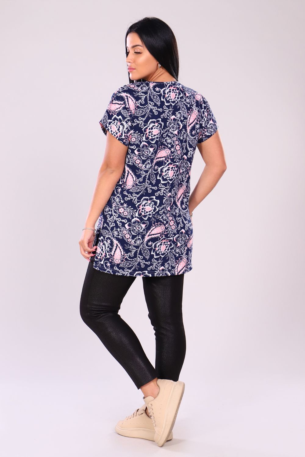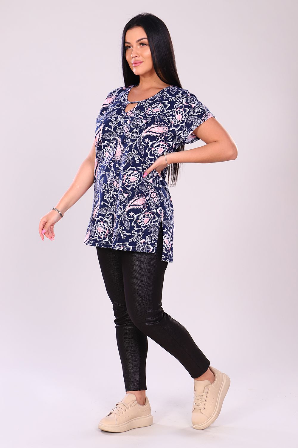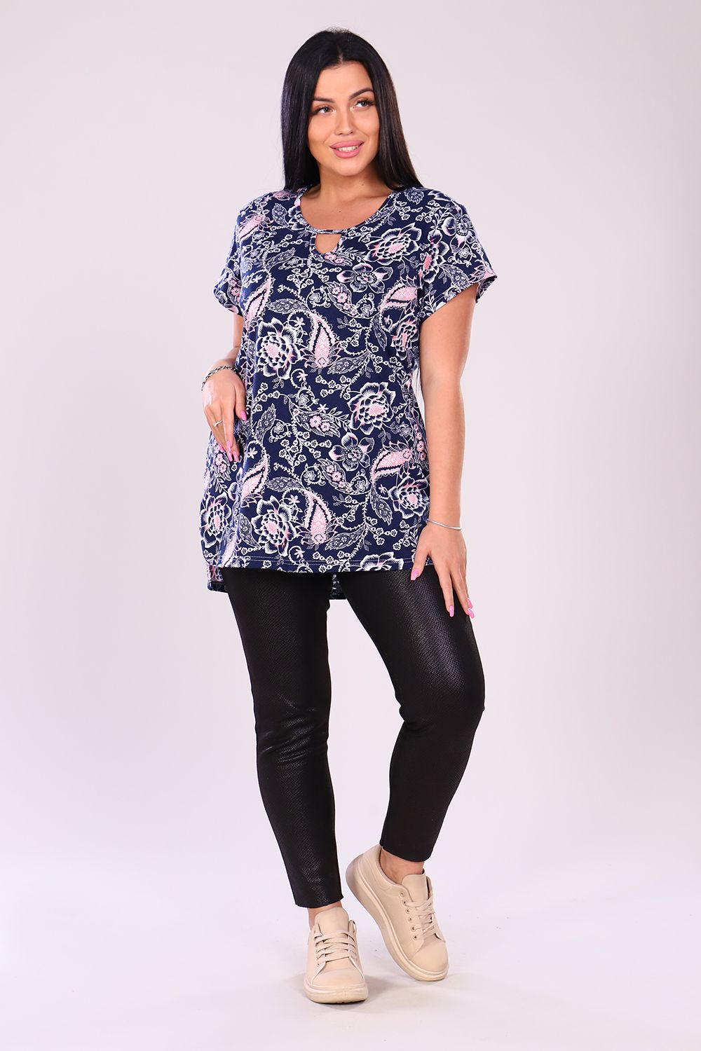Туника женская прямого силуэта, короткий рукав. Горловина круглая, капелька на полочке отделаны бейкой. Туника удлиненная, по боковым швам разрезы. Туника с цветочным орнаментом подойдет к любому низу. Прекрасный вариант для повседневной носки.