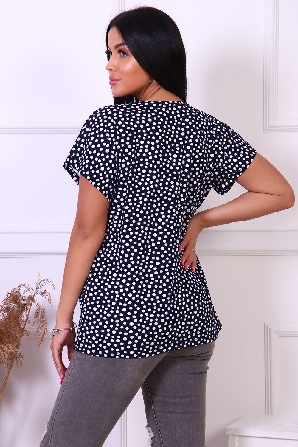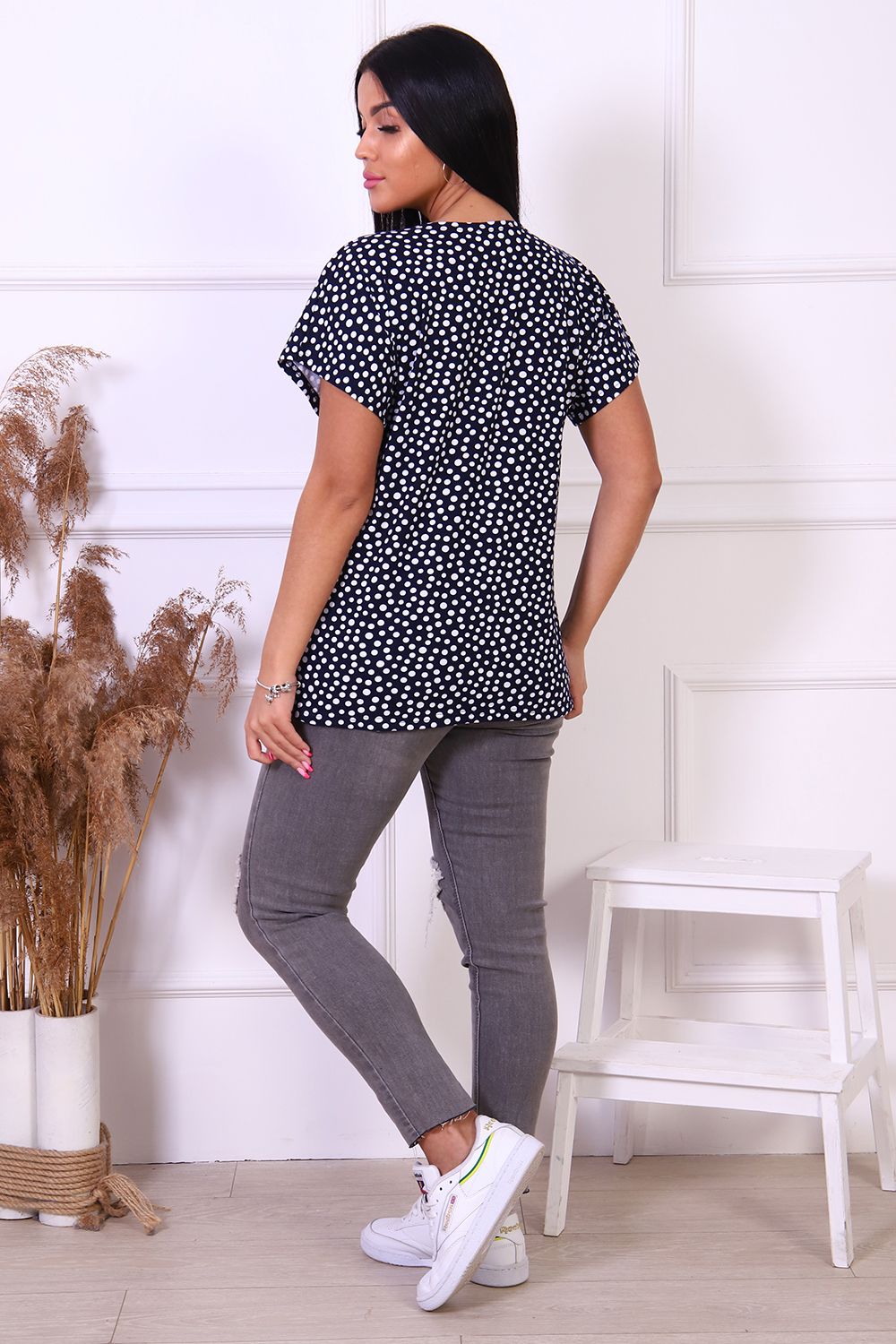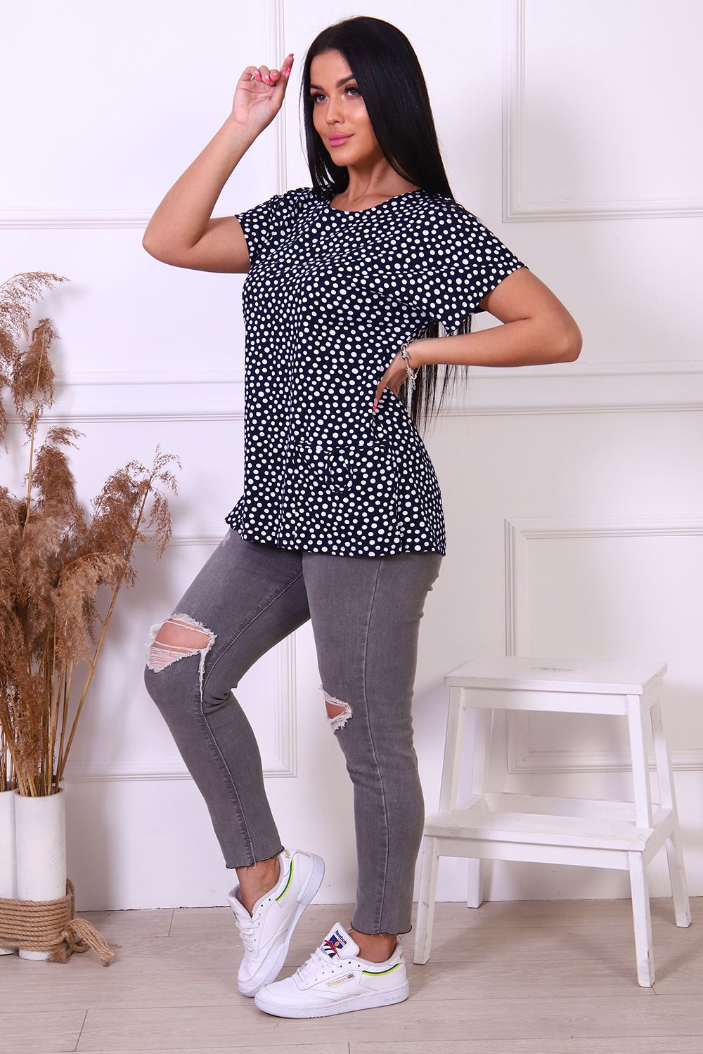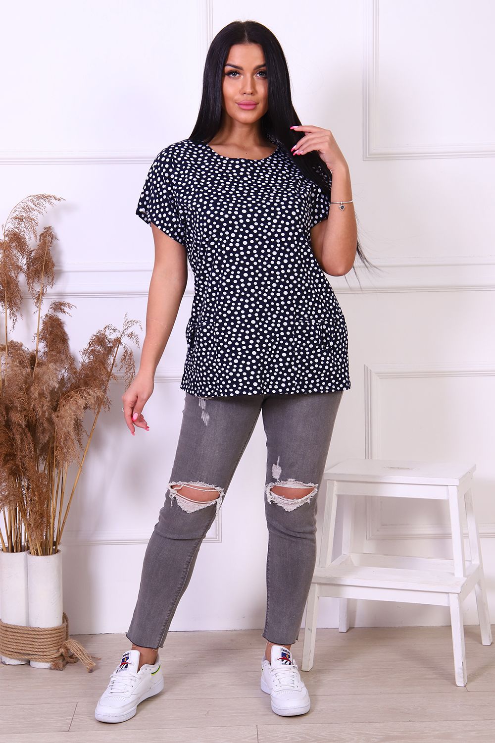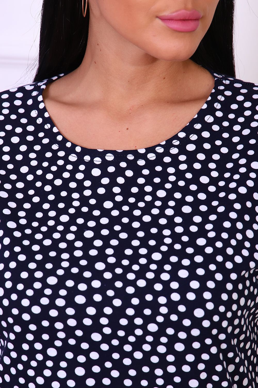 Туника женская приталенного силуэта, спущенная линия плеча, имеются накладные карманы, обработанные бейкой с фигурным вырезом. Рисунок - белый горох на черном фоне придаст образу женственность и очарование.