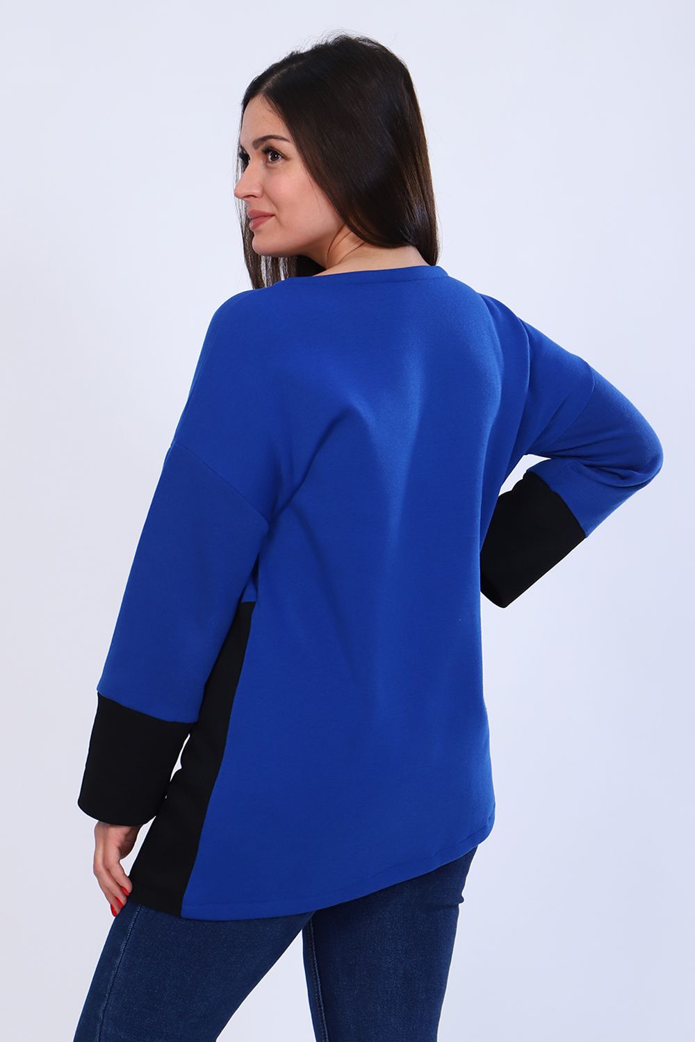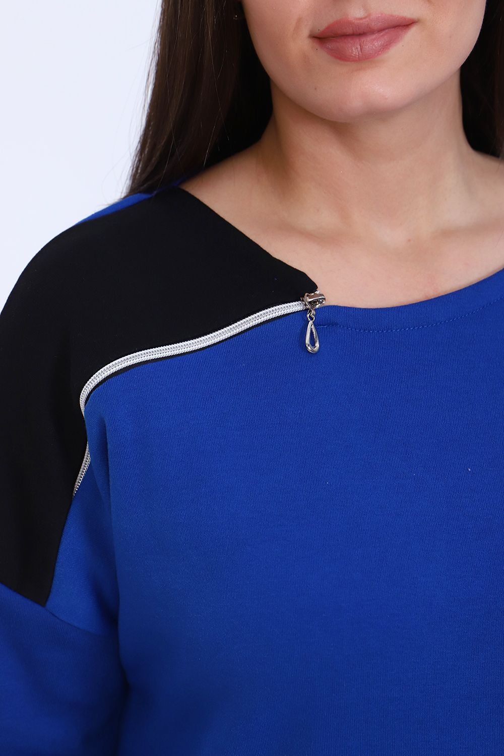 Туника женская, комбинированная, прямого силуэта, спущенный рукав 3/4 с широкими манжетами, длина рукава от шва. Горловина с обтачкой, справа декорирована втачной молнией. Фигурный v-образный низ декорирован вшивной молнией. Удобно и практично.