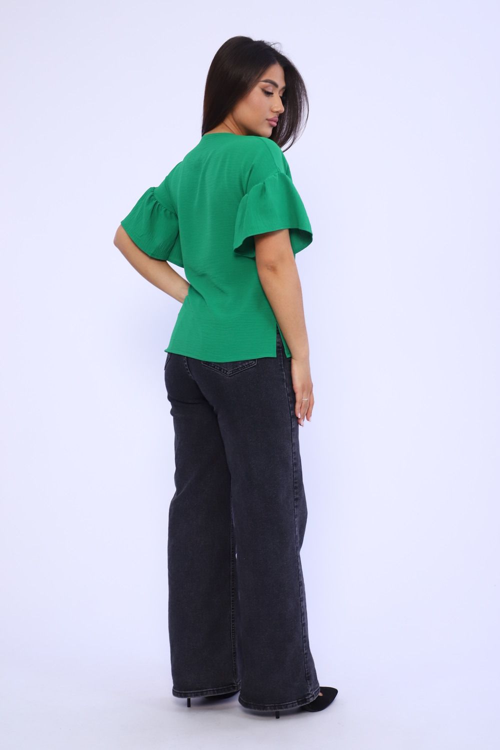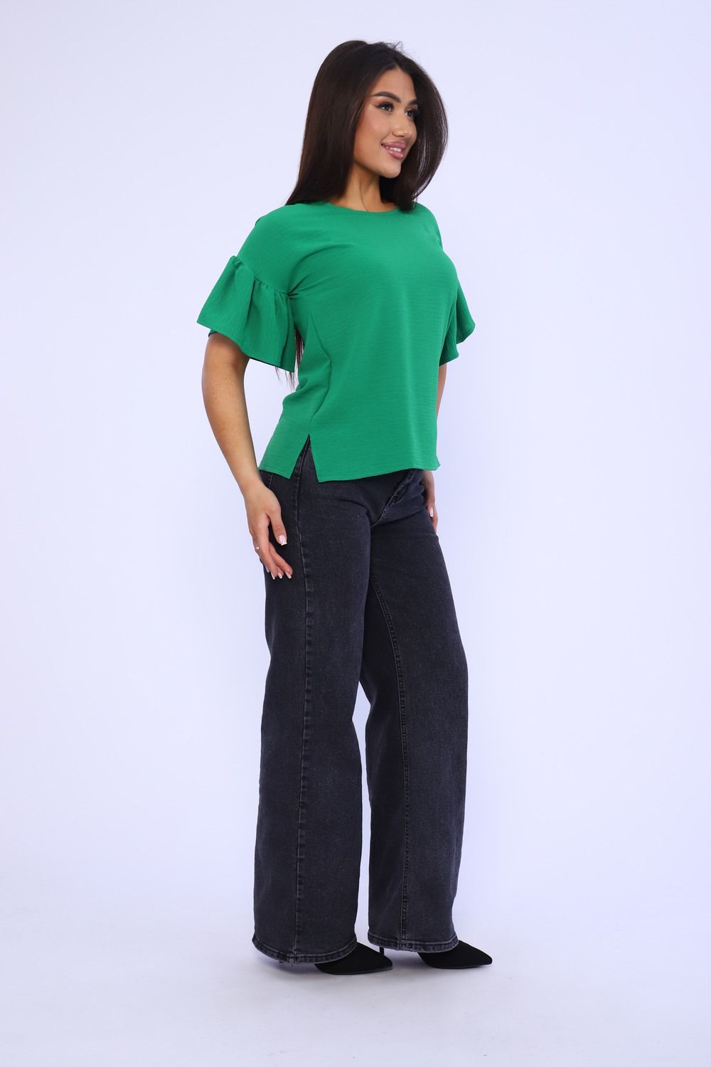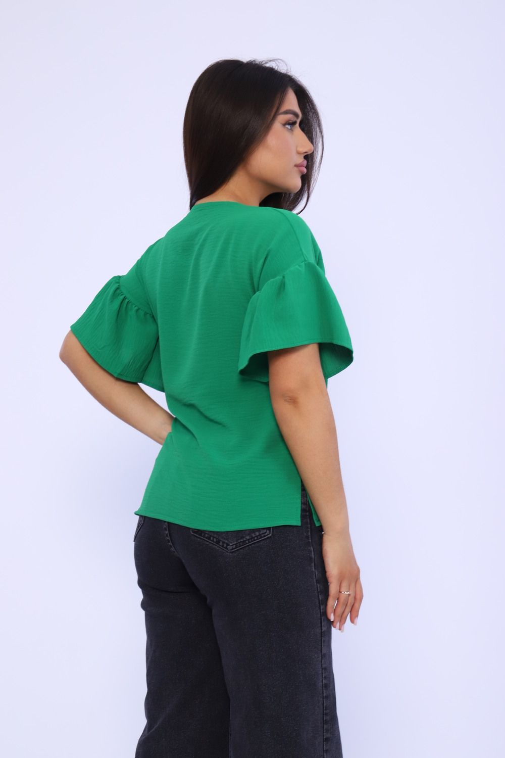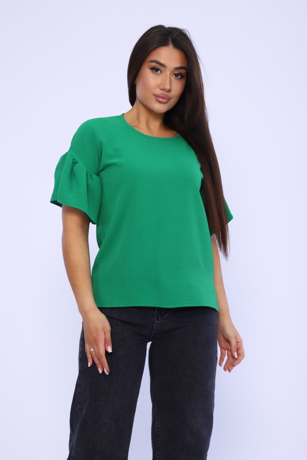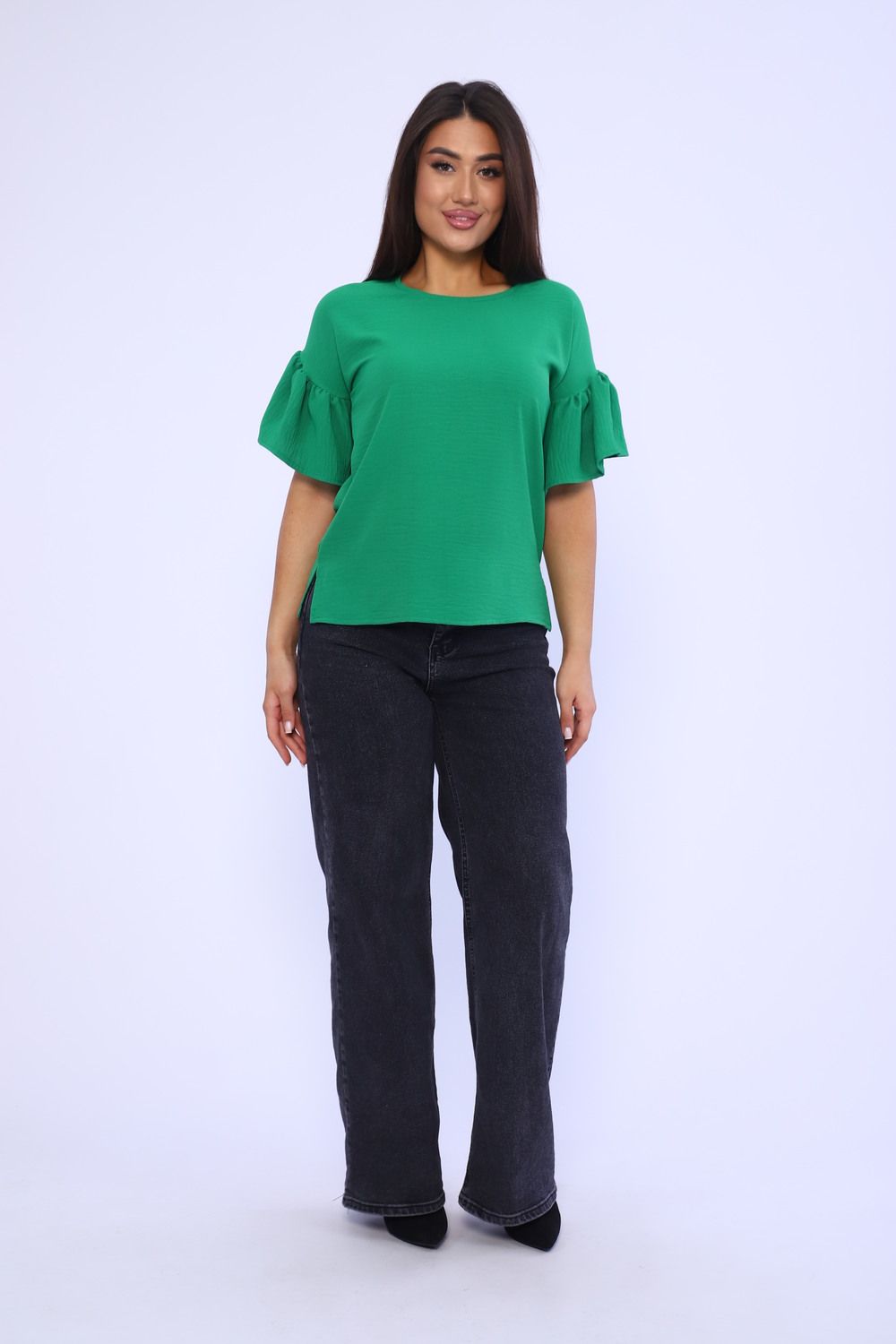 Женская элегантная туника прямого силуэта. Блузка имеет несколько цветов - 2 из них базовые "черный и белый". Рукава воланового типа, чуть выше локтя, горловина округлая, снизу разрезы по бокам. Выполнена из ткани сингапур, которая отвечает за комфорт и легкость при носке. Туника на каждый день - на работу, на праздник, для прогулок.