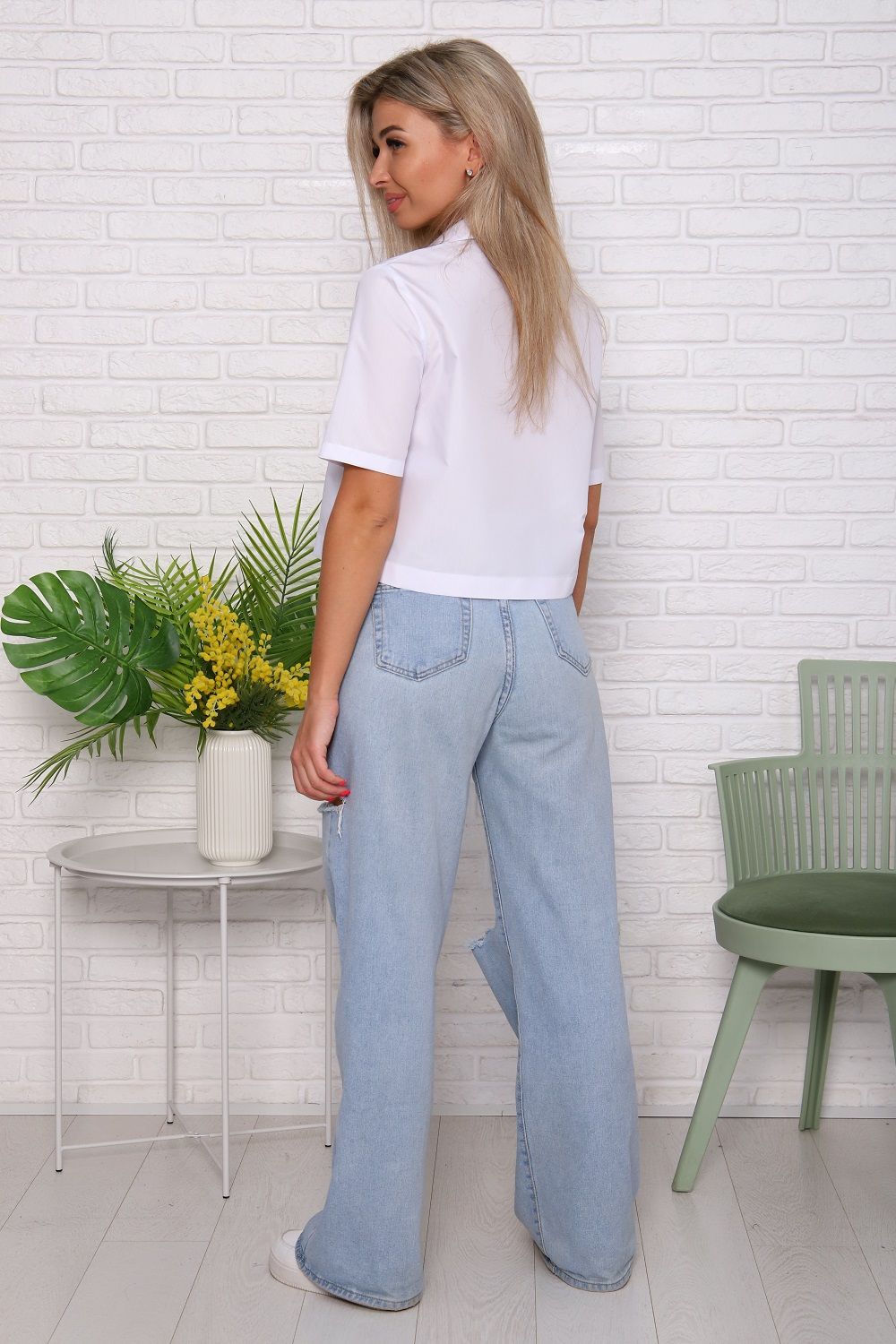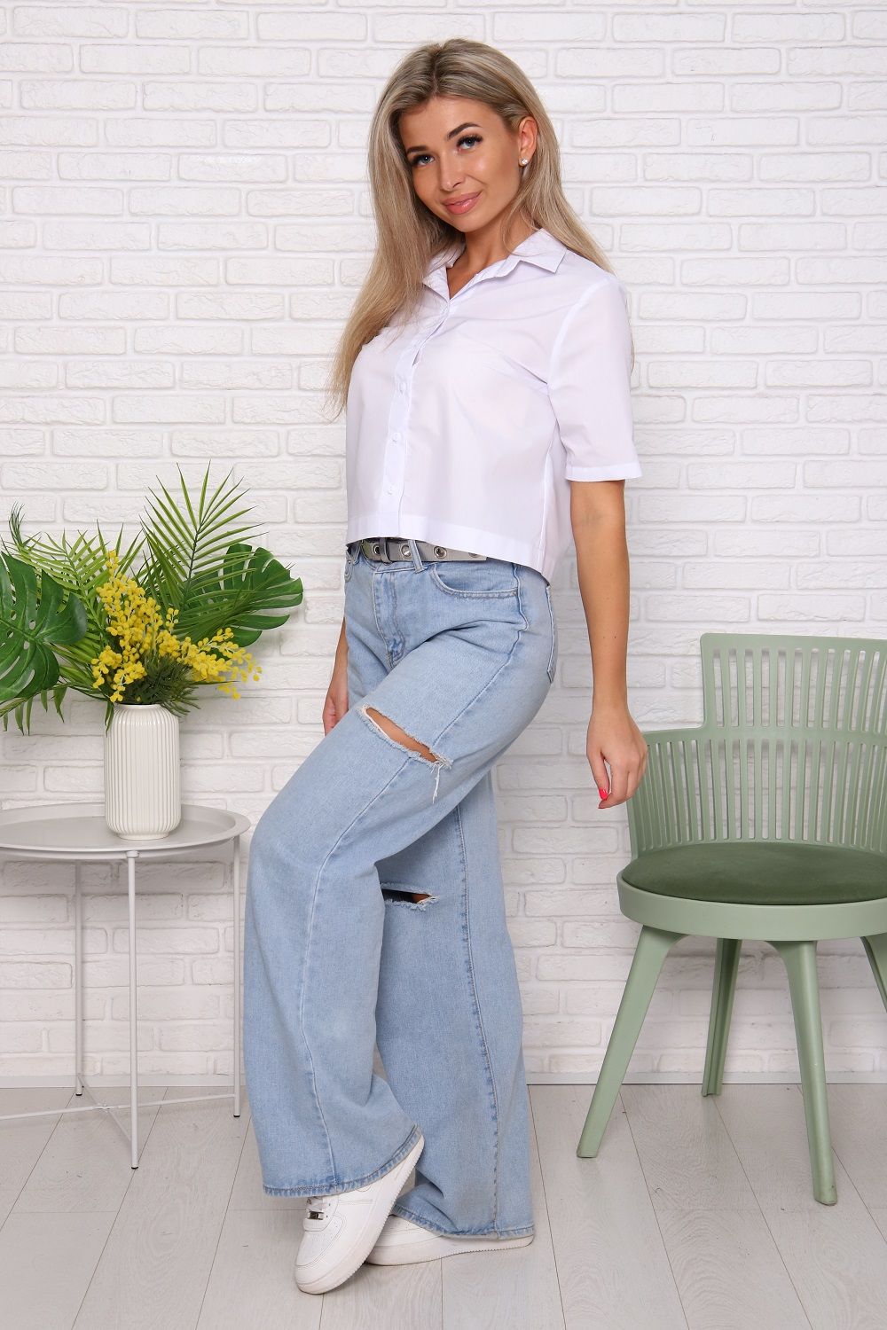 Туника-рубашка женская белая укороченная с короткими рукавами. Стильный, модный силуэт рубашки подчёркивает достоинства фигуры, визуально удлиняет ноги. Рубашка из смешанной ткани мало мнётся и легко гладится. Сочетается практически с любыми брюками, шортами, юбками. Данная модель есть и с длинным рукавом (артикул 57093).