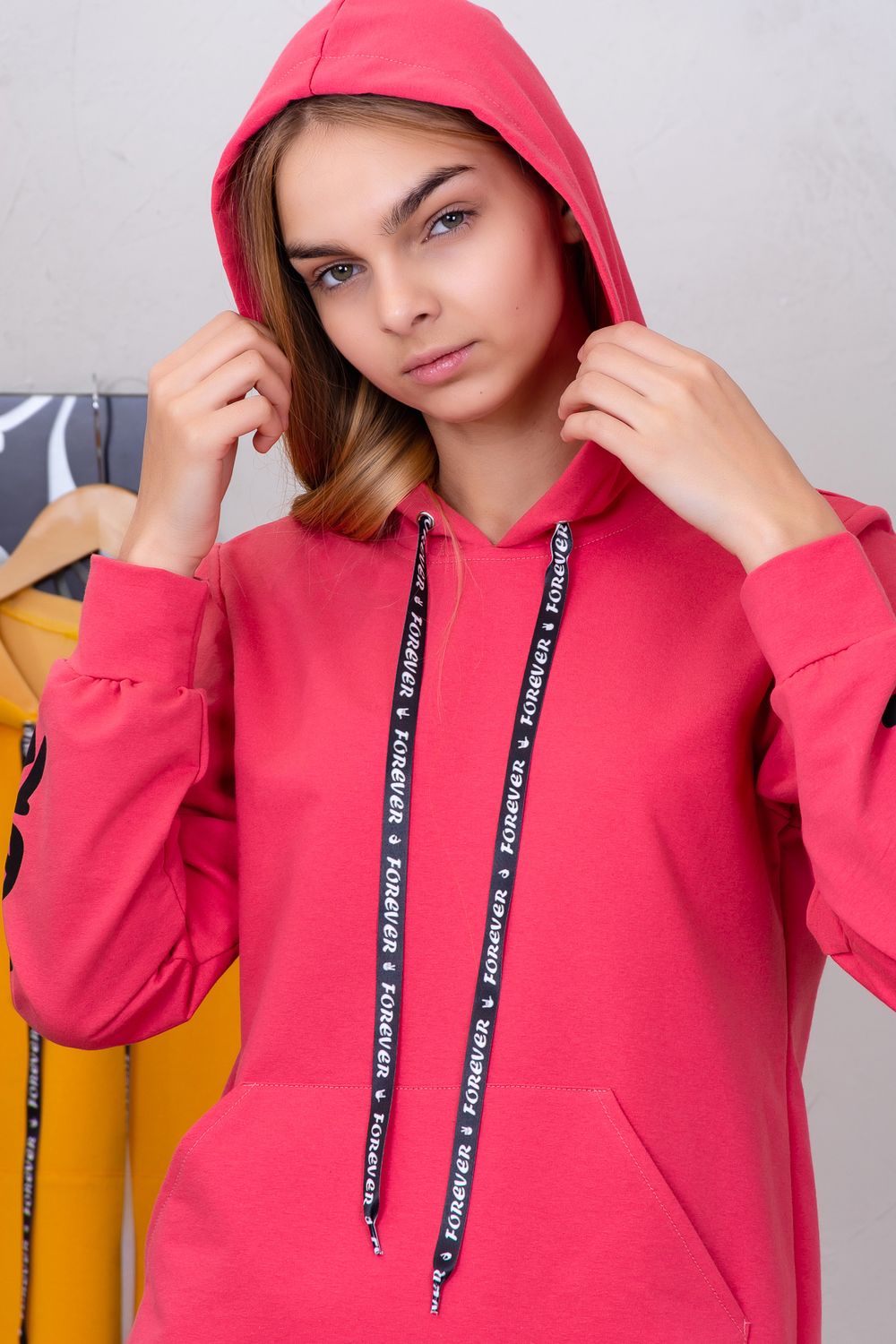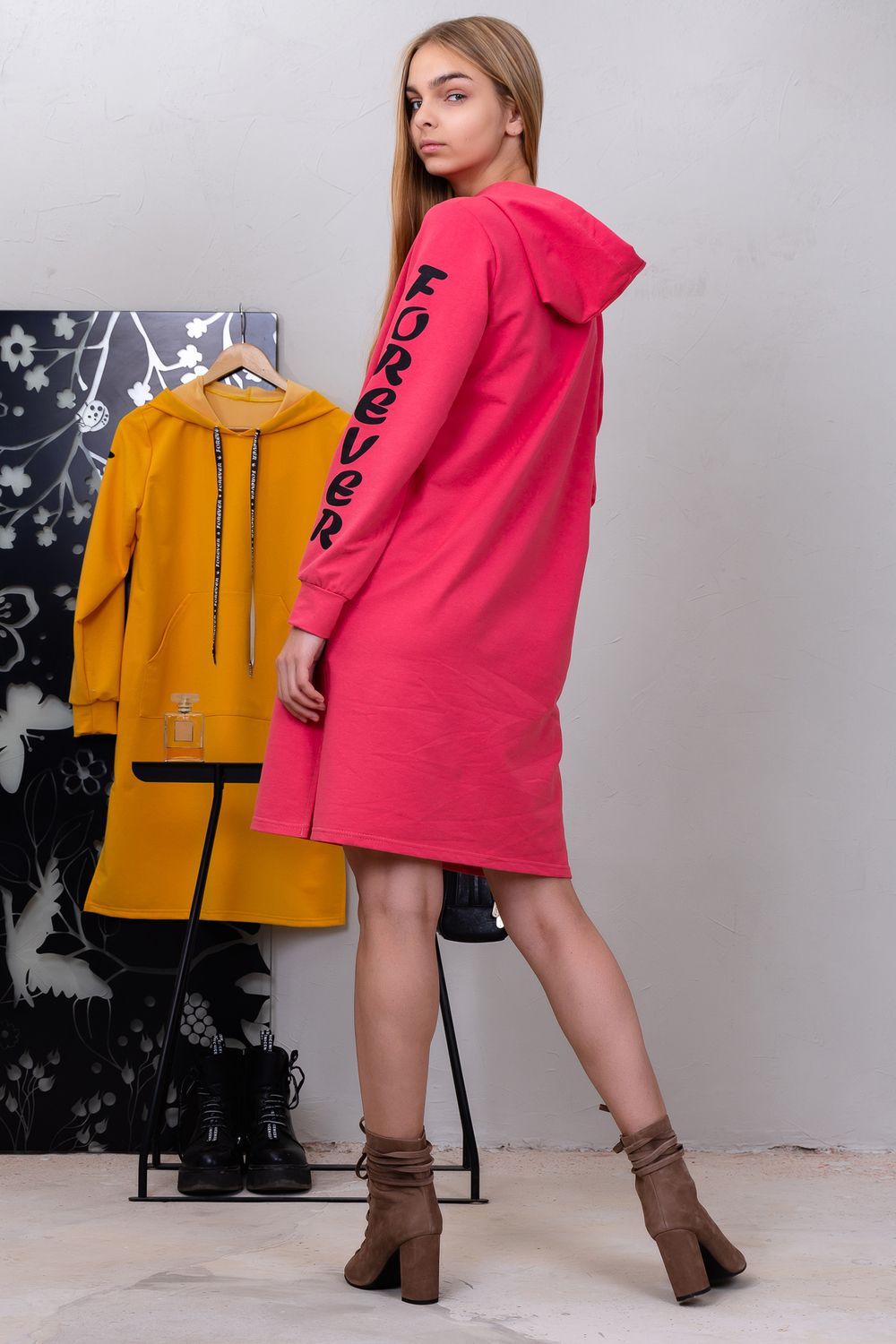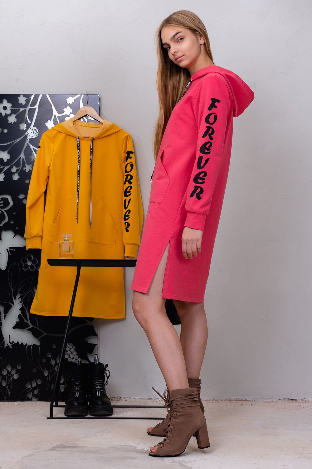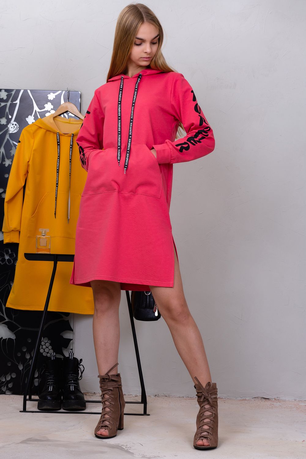 Молодежная туника из футера с капюшоном, длина до коленей, с разрезом по бокам, длинные рукава с печатью