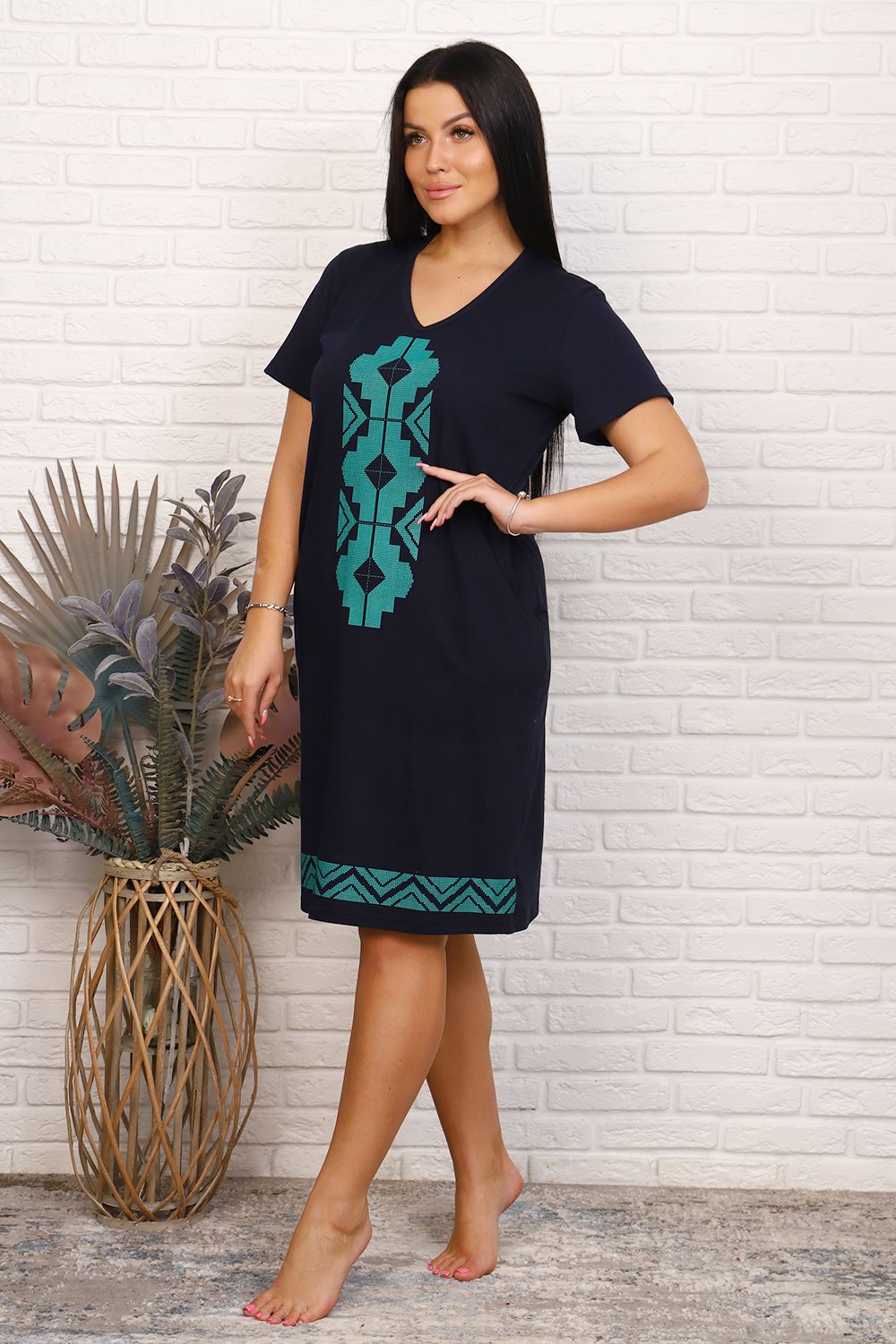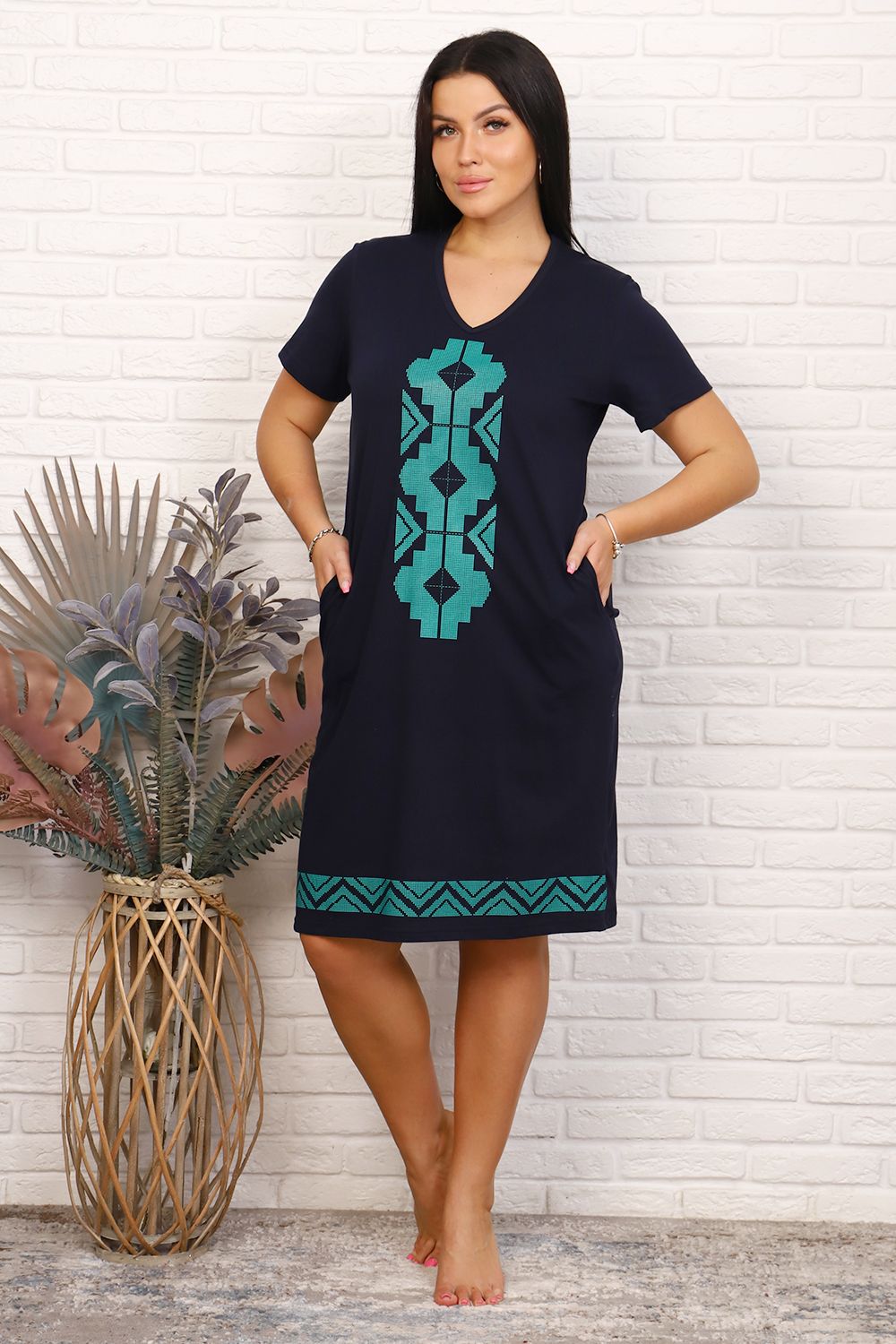 Женская туника из кулирки с печатью на переде и снизу, рукава короткие, боковые карманы