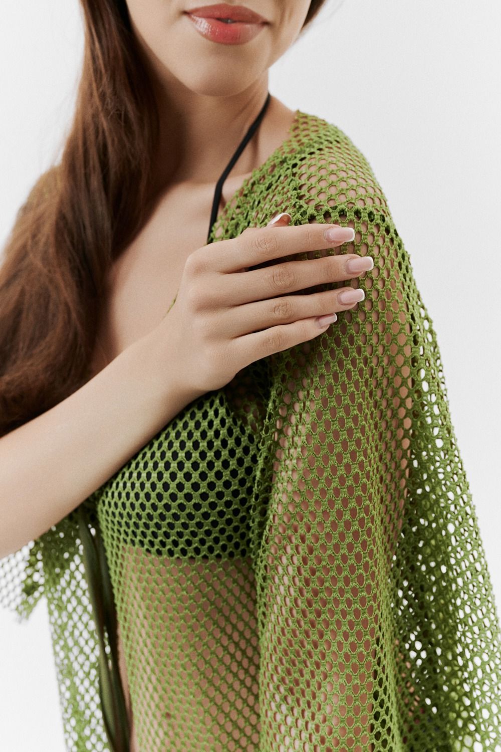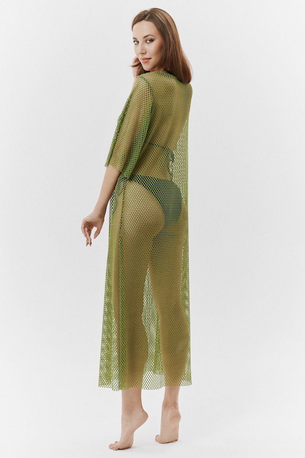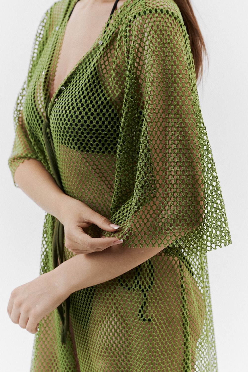 Туника пляжная, длинная, свободного силуэта, на груди завязывается, горловина оформлена декоративными стразами.
