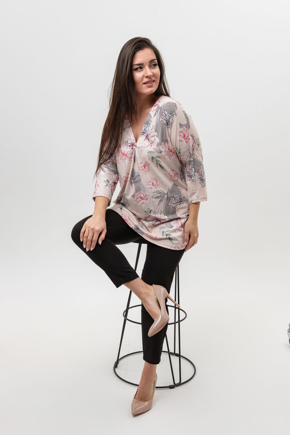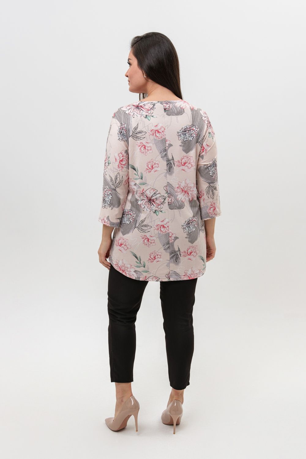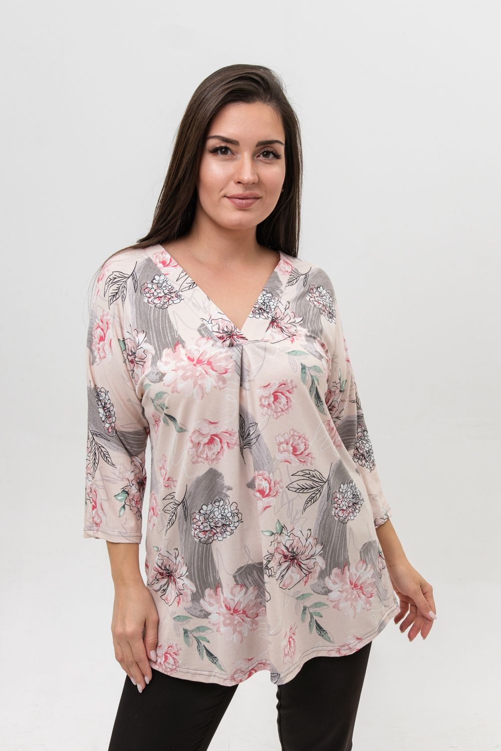 Туника женская со спущенным цельнокроеным рукавом длиной 3/4 выполнена из вискозы красивой, нежной расцветки. Горловина туники имеет V-образный вырез, обработана планкой, низ изделия немного расклешен. Ткань хорошего качества, при стирке не линяет, не дает усадку, сохраняет форму.