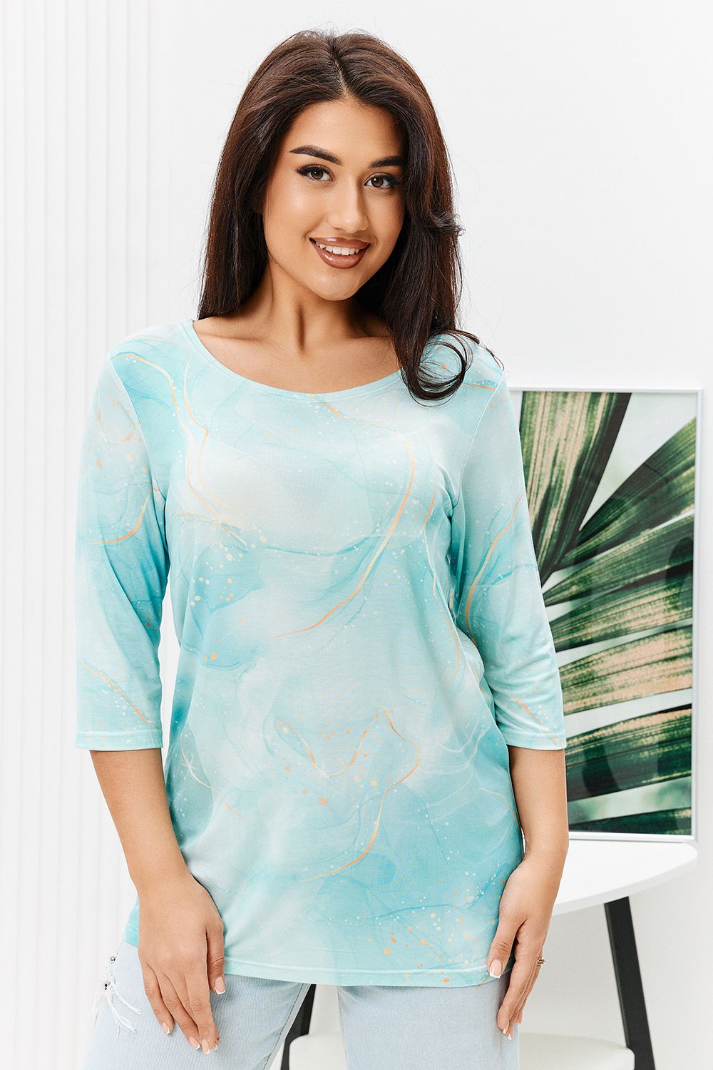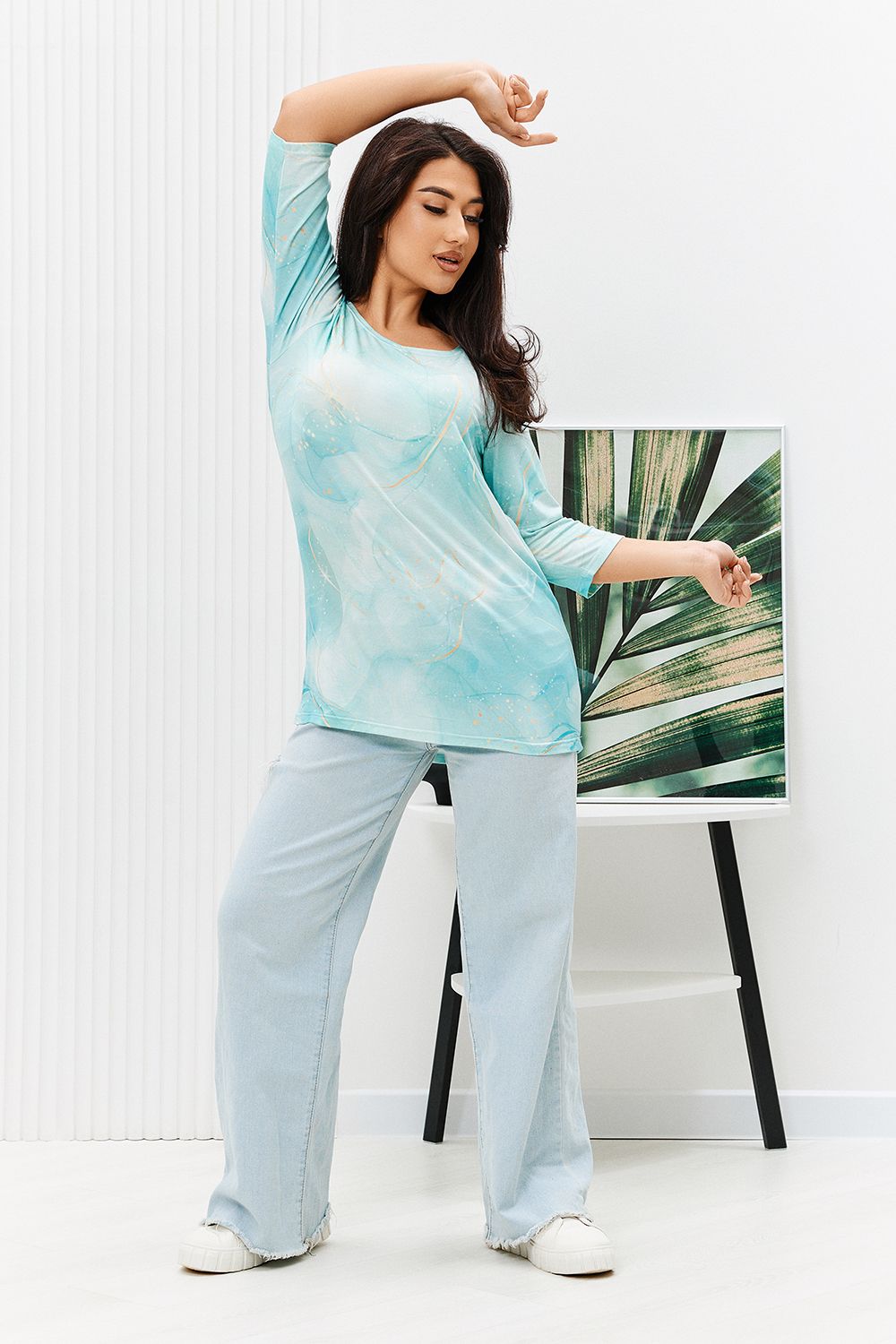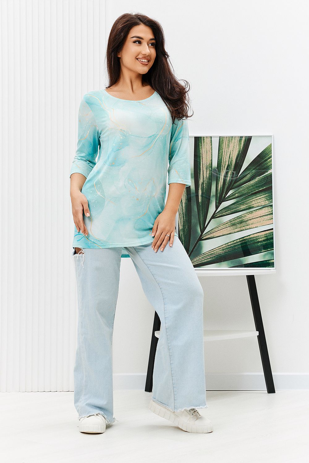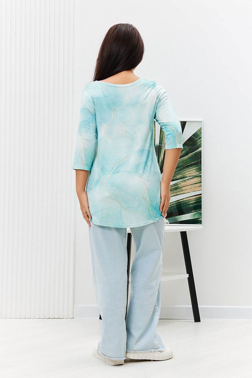 Туника из вискозы оригинальной расцветки с рукавом 3/4. Горловина и рукава подшиты. Туника прекрасно подойдет как для дома, так и для прогулок и отдыха.
