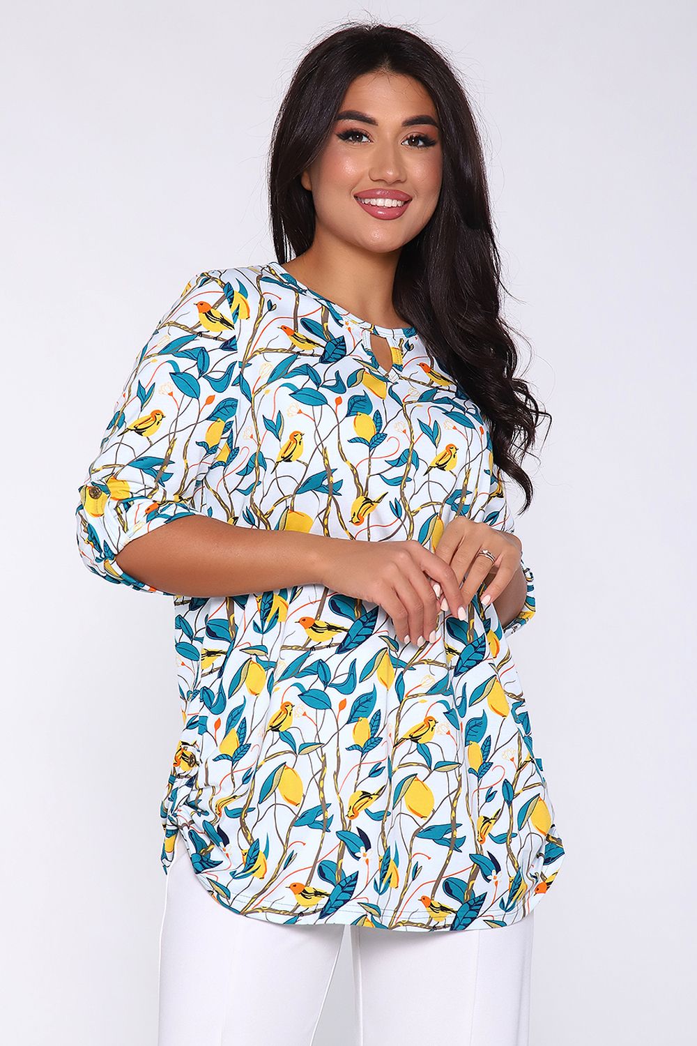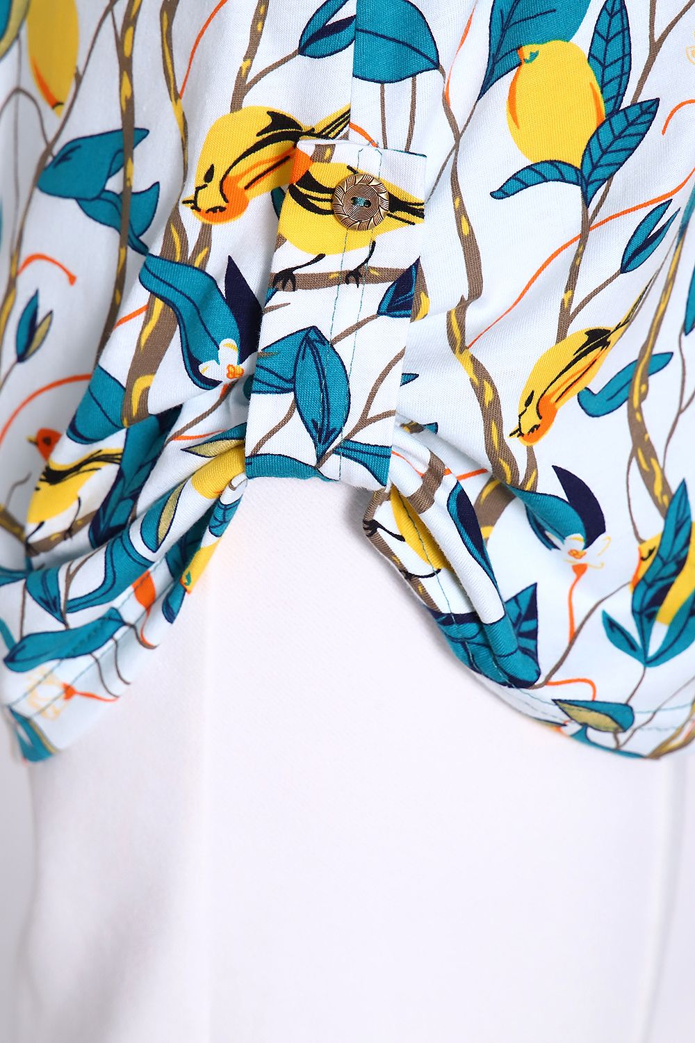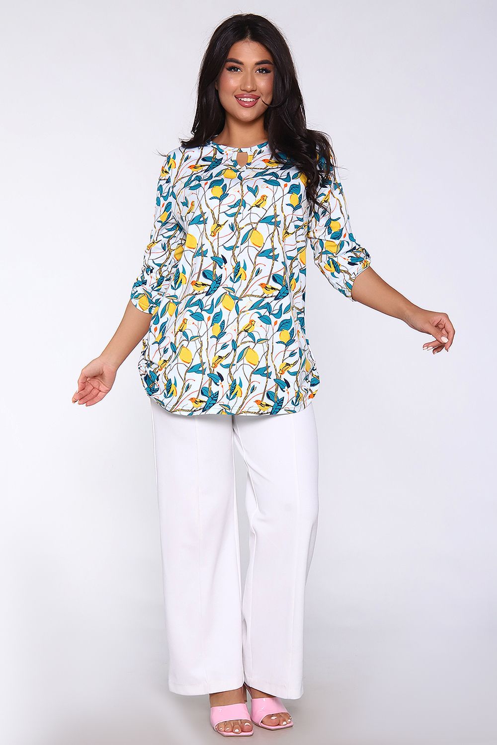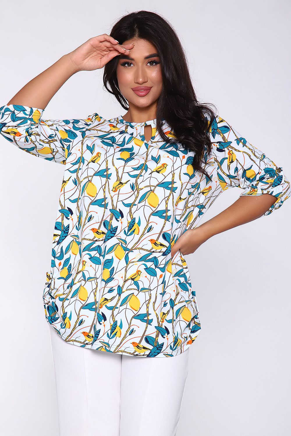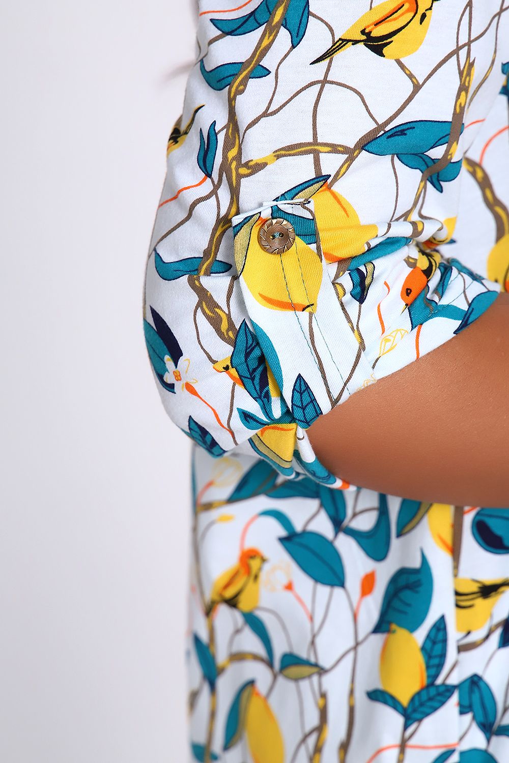 Туника женская Туника-рубашка имеет округлый вырез с фигурной капелькой. Рукава 3/4 и низ подогнуты на плоскошовной машине, а так жен имеют декоративный элемент с пуговицей.Блуза женская подходит для беременных, для полных, для женщин больших размеров. Туника-рубашка подойдет для лета, весны, осени, зимы