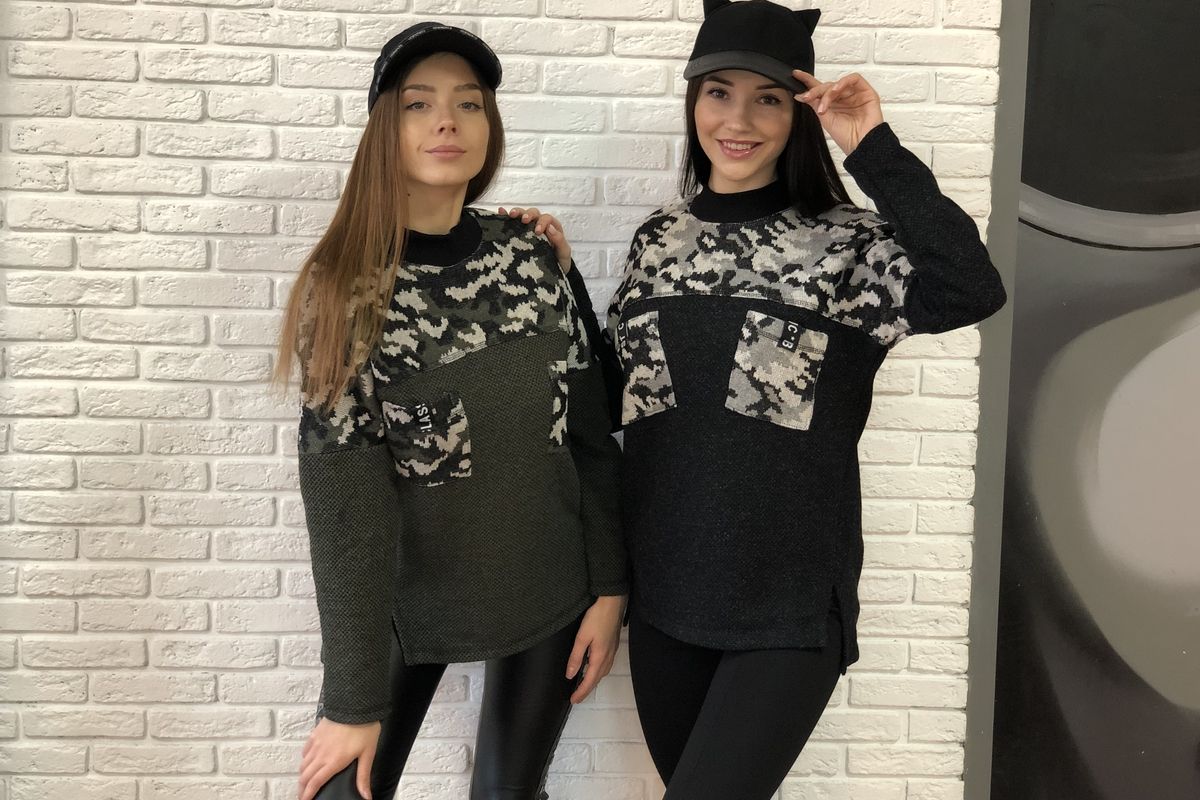 Туника женская прямого силуэта. Рукав цельнокроенный со швом. Полочка короче спинки. Воротник-стойка из кашкорсе. На полочке два нагрудных накладных кармана, по боковому шву разрезы, слегка перенесенные в сторону полочки. Туника из однотонной ткани "Пике", кокетки полочки и спинки, карманы из ткани "Жакке" с модным принтом камуфляж.