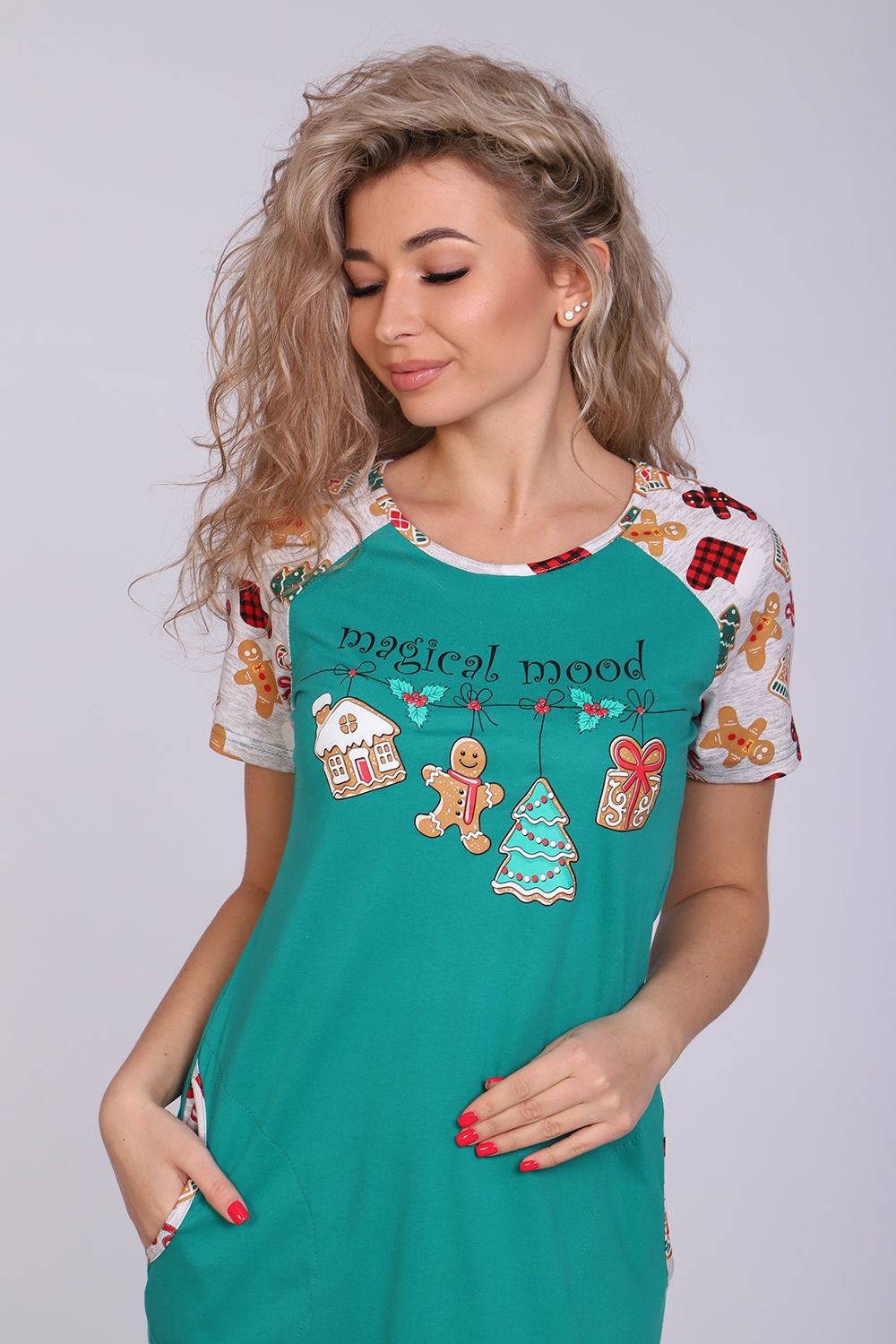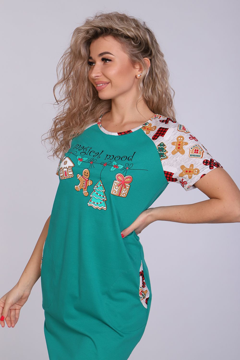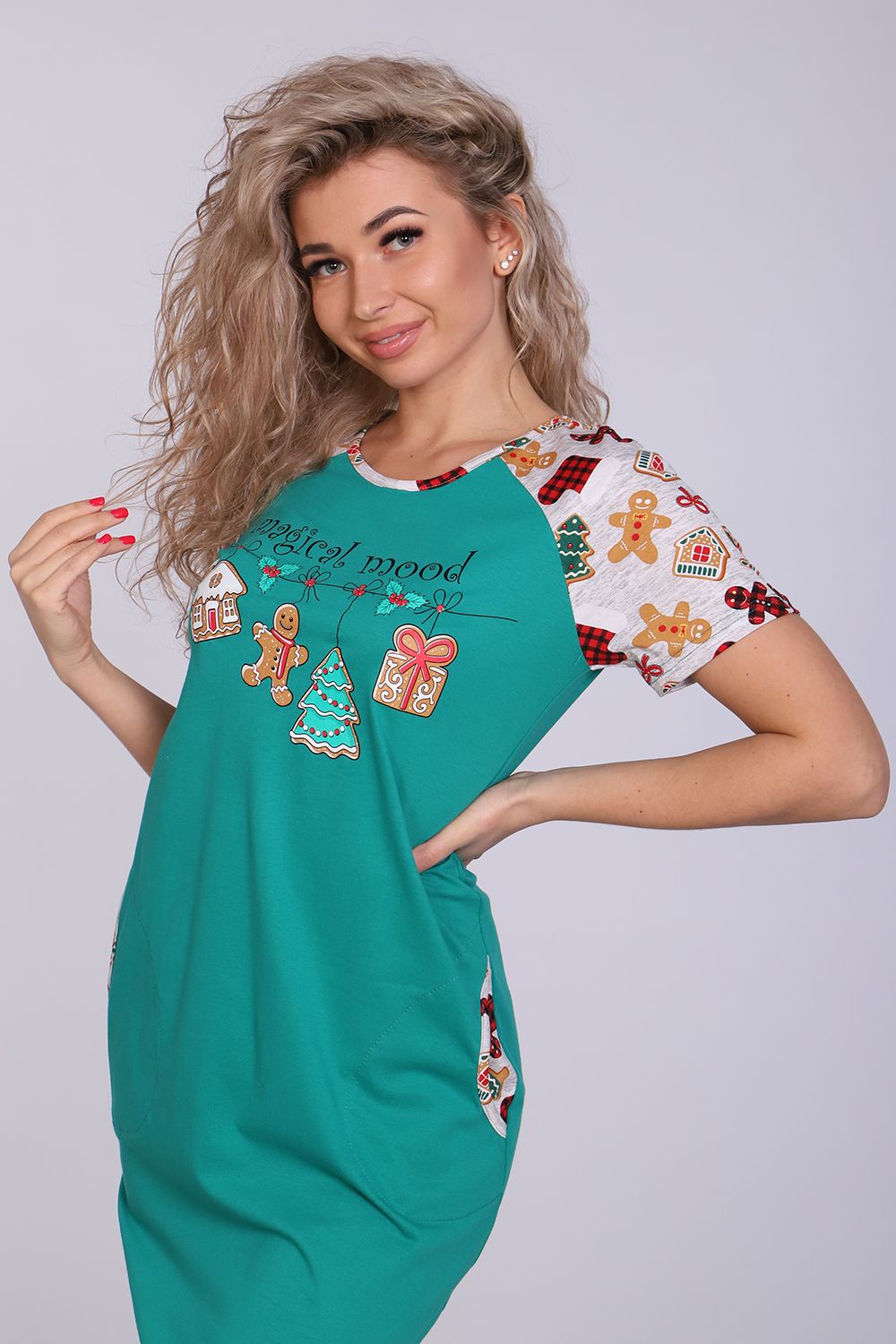 Женское платье-туника длиной чуть выше колена с милым принтом на полочке в виде атрибутов новогодних праздников, короткими рукавами-реглан контрастного цвета и округлой горловиной. Низ платья закруглен и образует небольшие разрезы по бокам. Горловина и вход в карманы обработаны окантовкой из ткани рукавов. Наличие боковых карманов добавит дополнительный комфорт при использовании. Выполнена из трикотажного полотна, 100% хлопок. Удобная, модная приятная к телу. Не стесняет движения. Яркие стойкие цвета соответствуют модным тенденциям. Можно носить, как домашнюю тунику или уличное платье. Для дома и отдыха, для дачи. Новогодняя тематика принтов делает эту модель отличным подарком девушкам на Новый год!