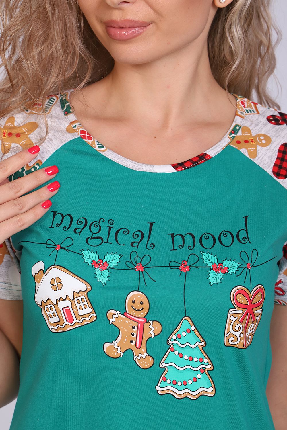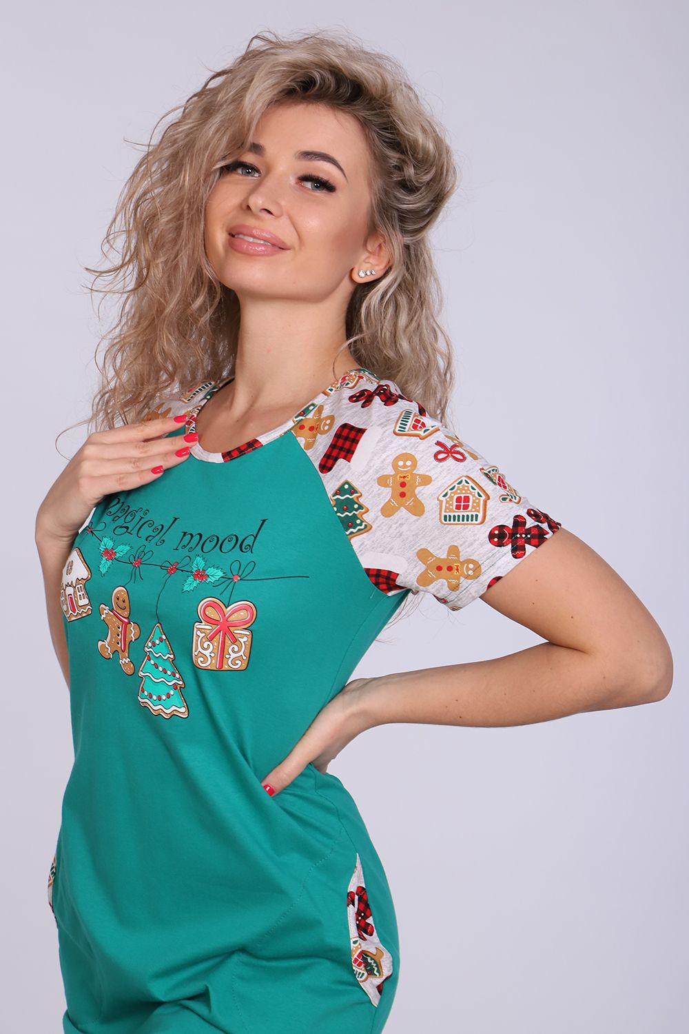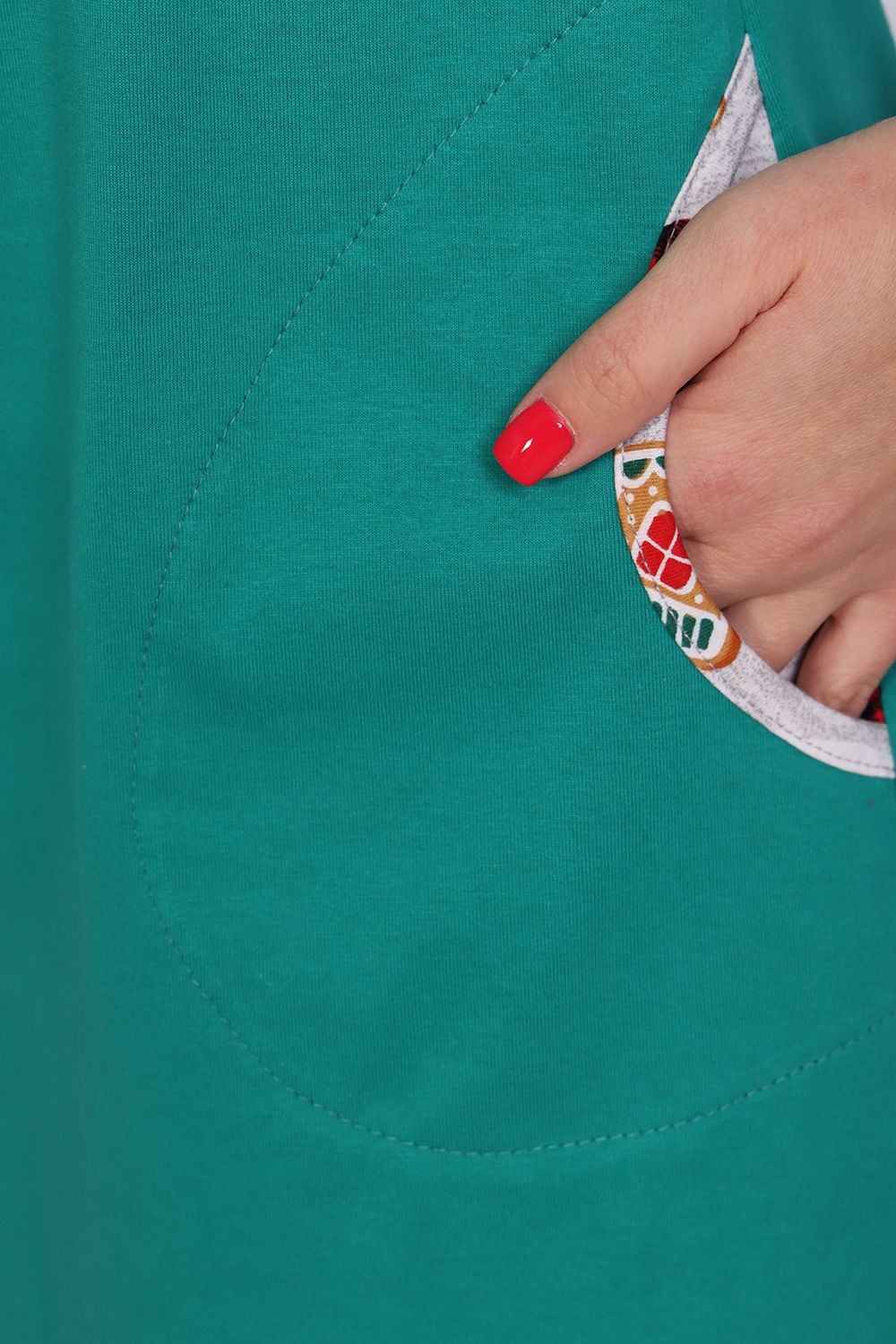 Женское платье-туника длиной чуть выше колена с милым принтом на полочке в виде атрибутов новогодних праздников, короткими рукавами-реглан контрастного цвета и округлой горловиной. Низ платья закруглен и образует небольшие разрезы по бокам. Горловина и вход в карманы обработаны окантовкой из ткани рукавов. Наличие боковых карманов добавит дополнительный комфорт при использовании. Выполнена из трикотажного полотна, 100% хлопок. Удобная, модная приятная к телу. Не стесняет движения. Яркие стойкие цвета соответствуют модным тенденциям. Можно носить, как домашнюю тунику или уличное платье. Для дома и отдыха, для дачи. Новогодняя тематика принтов делает эту модель отличным подарком девушкам на Новый год!