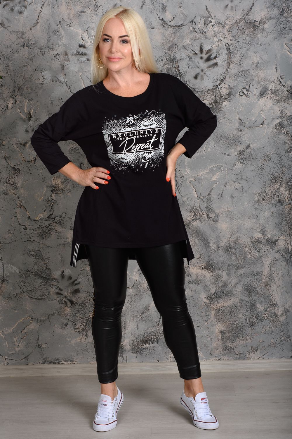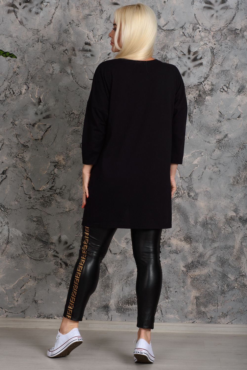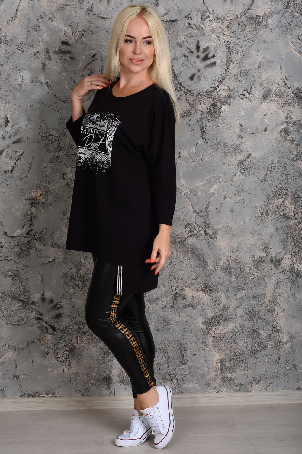 Туника женская. На полочке принт. По низу изделия отделка – тесьма.