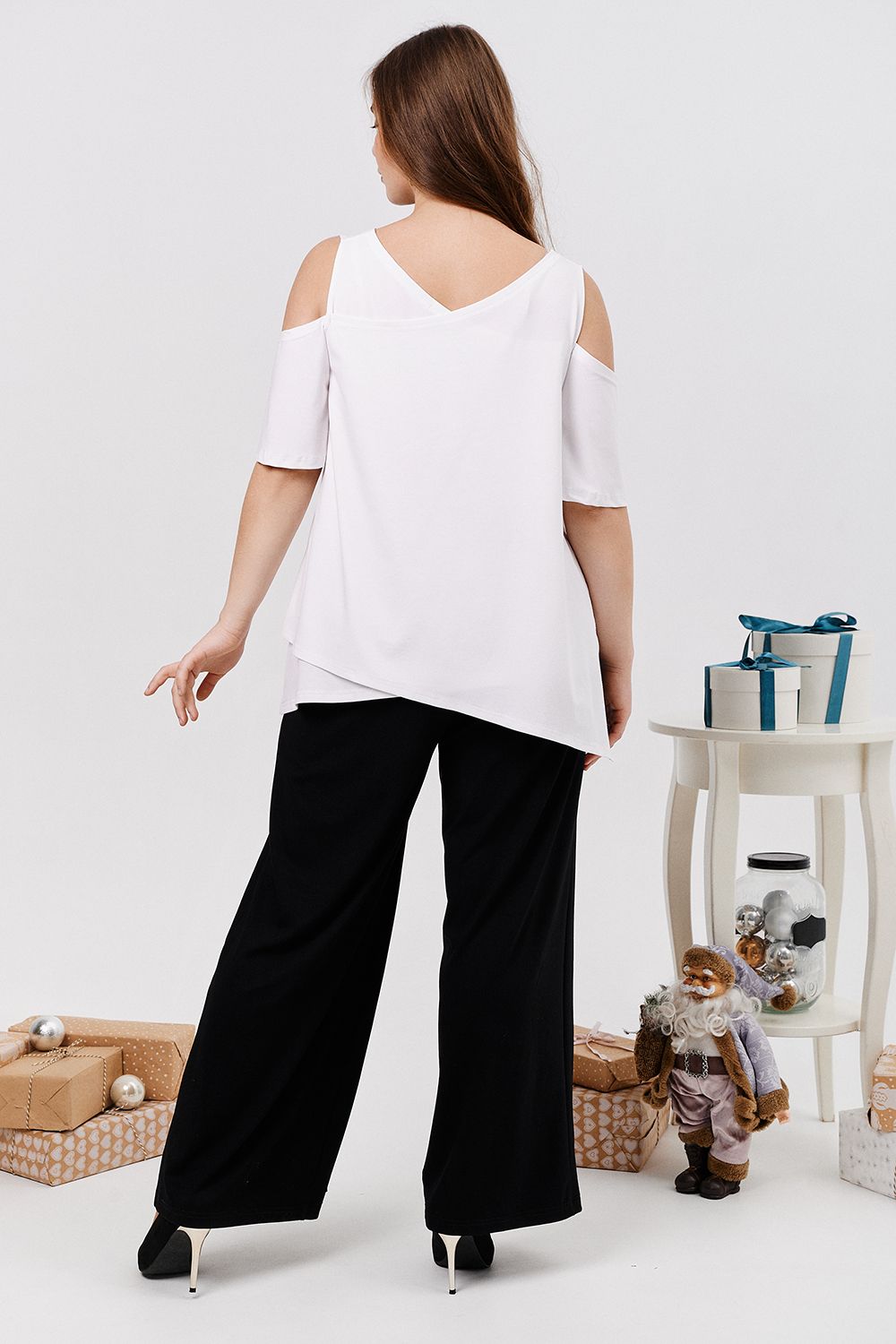 Дизайнерская женская блузка свободного кроя. Её можно носить как вечернюю или офисную, так же подойдет для жаркой погоды. Модель выполнена из приятной на ощупь дышащей ткани, не просвечивает. Особенностью блузки являются двойные полочка и спинка. Рукав с открытым плечом.