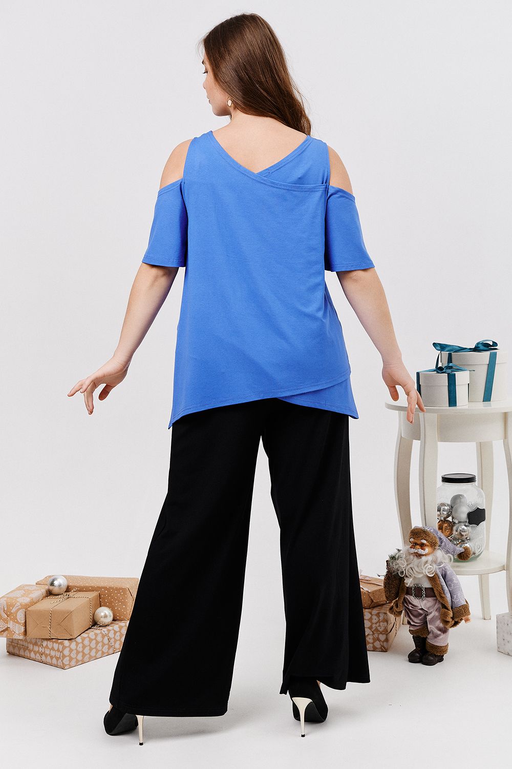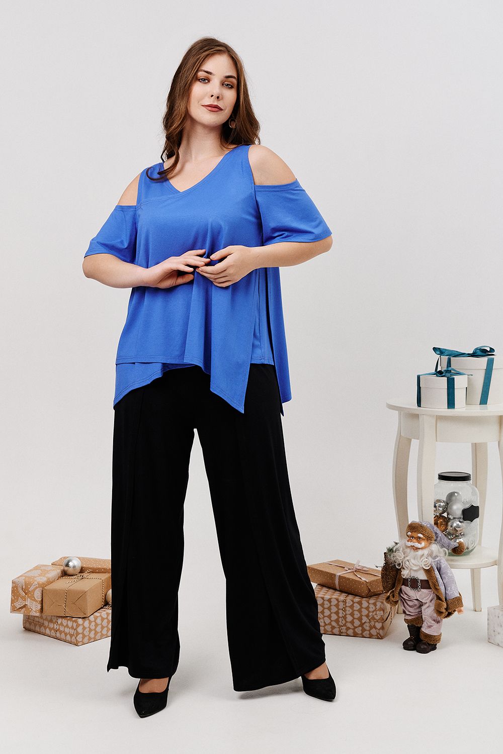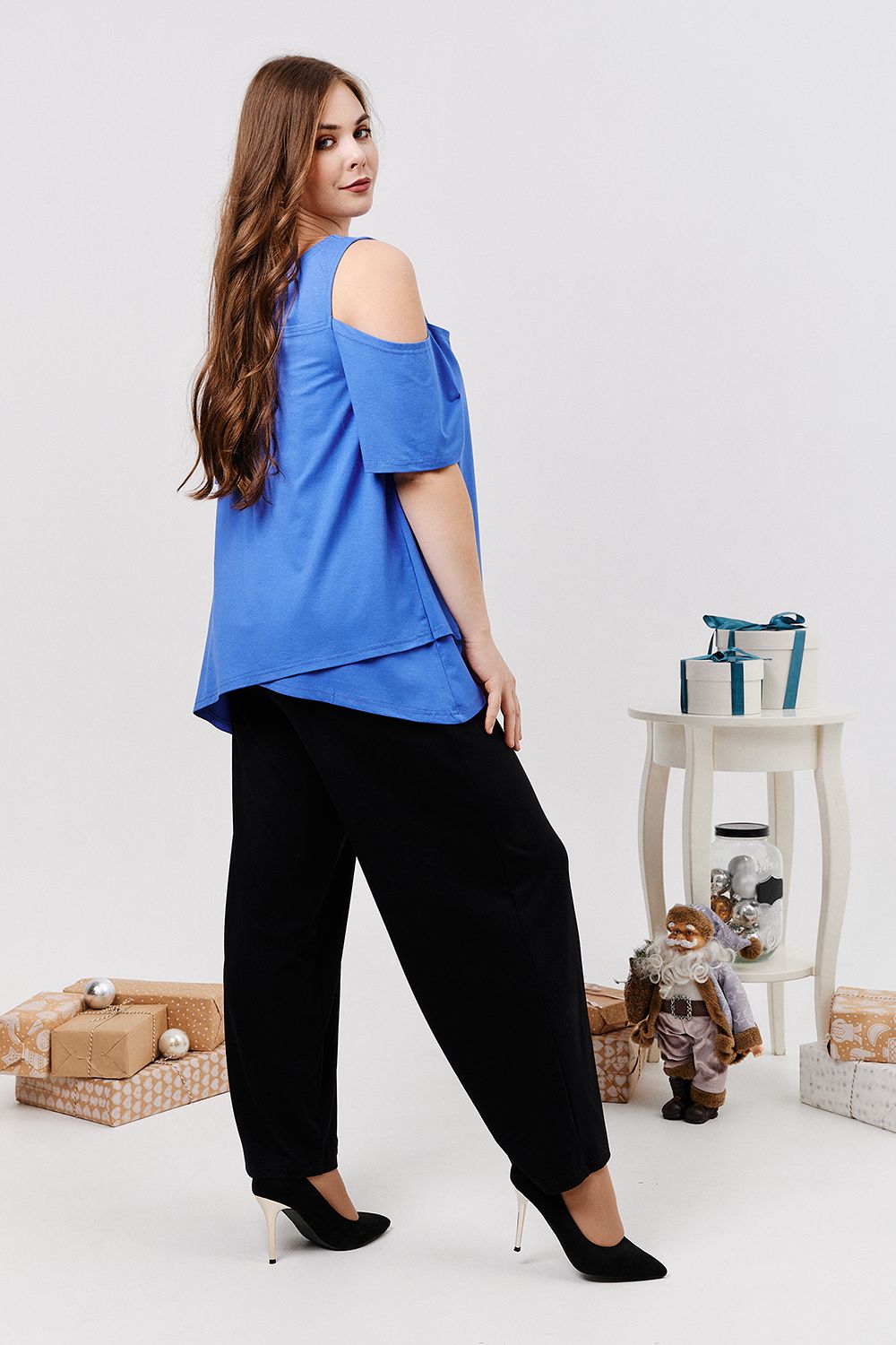 Дизайнерская женская блузка свободного кроя. Её можно носить как вечернюю или офисную, так же подойдет для жаркой погоды. Модель выполнена из приятной на ощупь дышащей ткани, не просвечивает. Особенностью блузки являются двойные полочка и спинка. Рукав с открытым плечом.