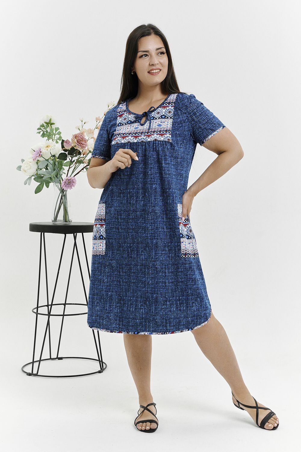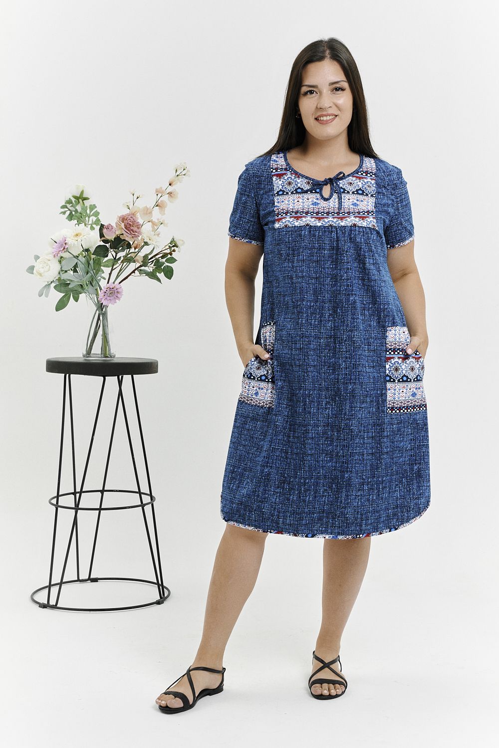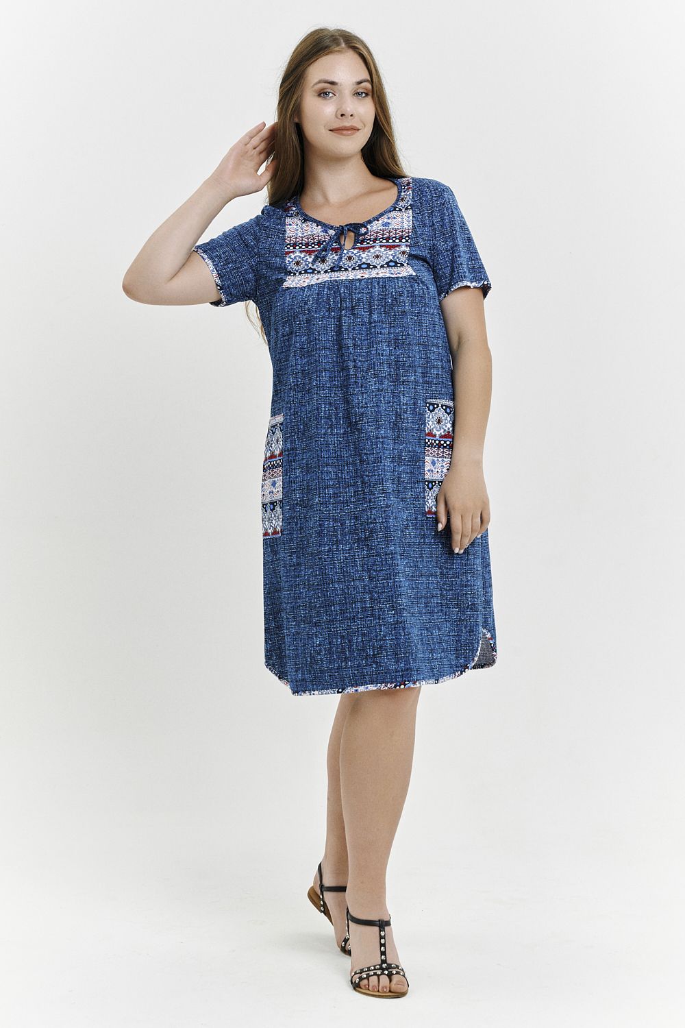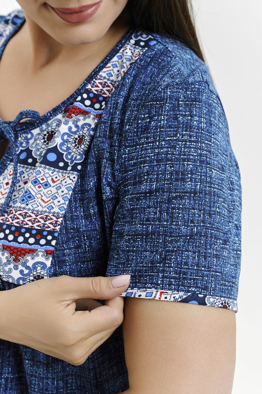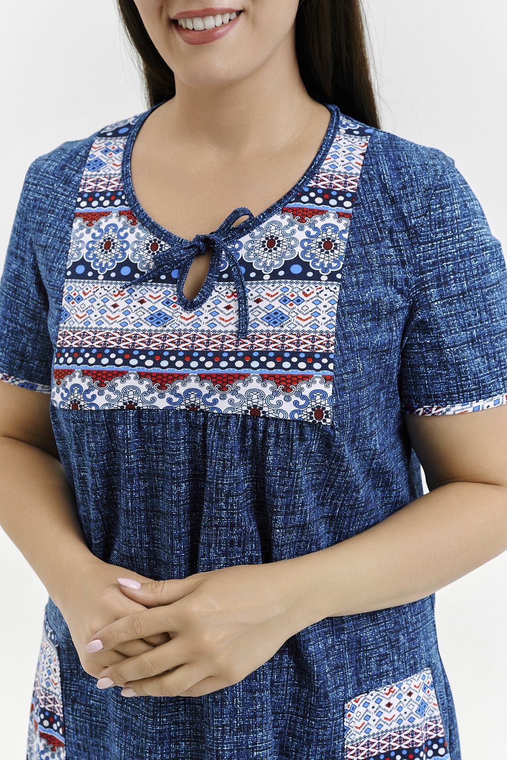 Стильная женская туника из кулирки. Горловина с завязками, короткие рукава, узорчатые вставки, карманы и окантовка, общая длина туники чуть выше коленей.