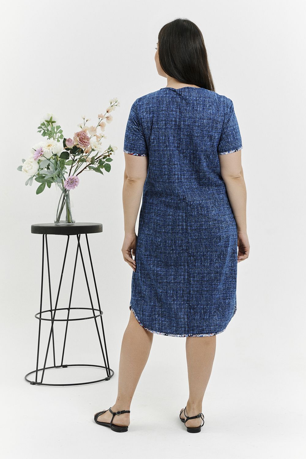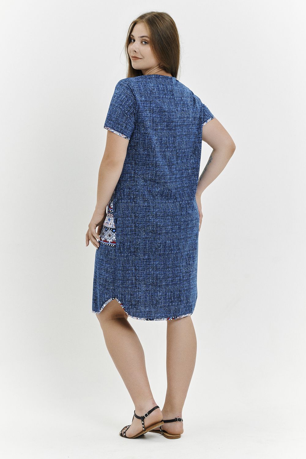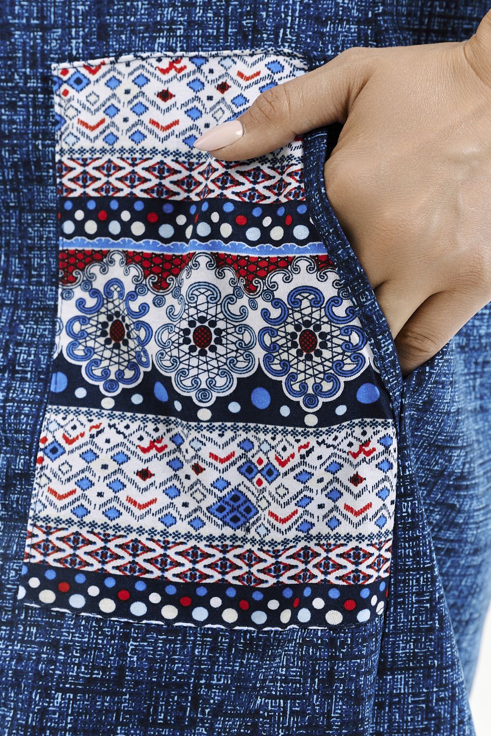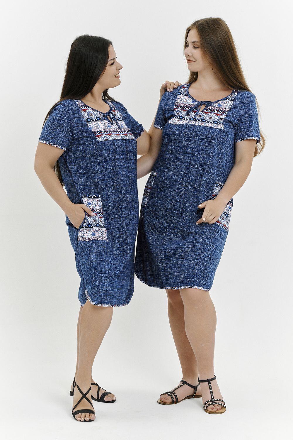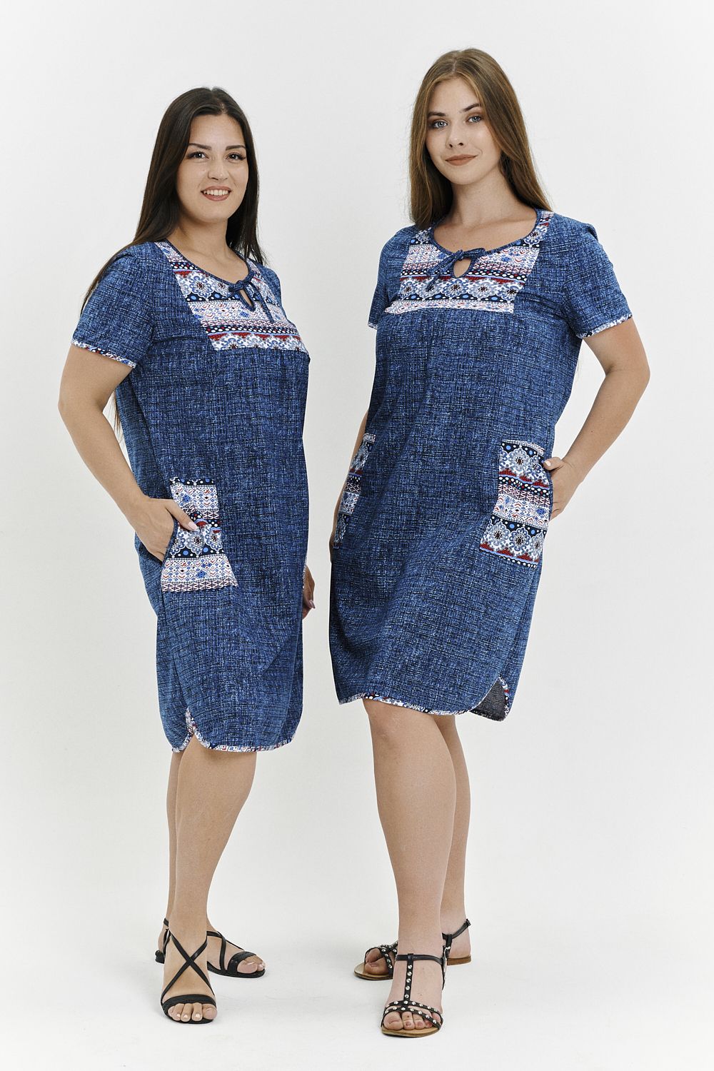 Стильная женская туника из кулирки. Горловина с завязками, короткие рукава, узорчатые вставки, карманы и окантовка, общая длина туники чуть выше коленей.