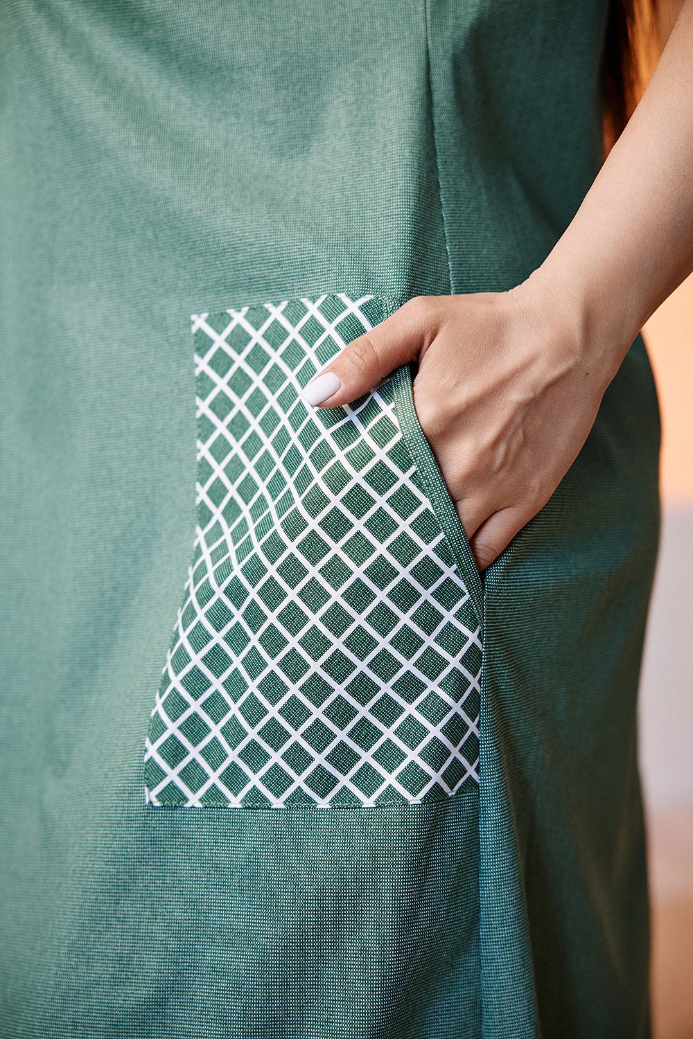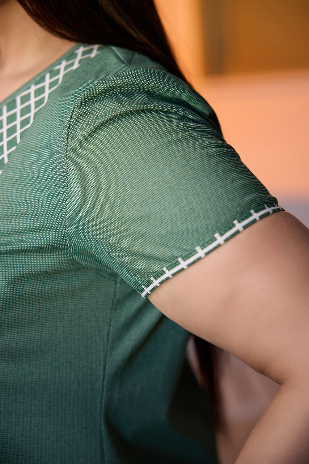 Стильная женская туника из кулирки. Горловина с завязками, короткие рукава, узорчатые вставки, карманы и окантовка, общая длина туники чуть выше коленей.