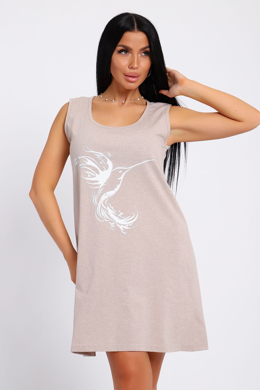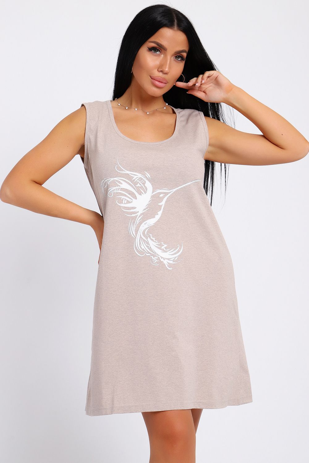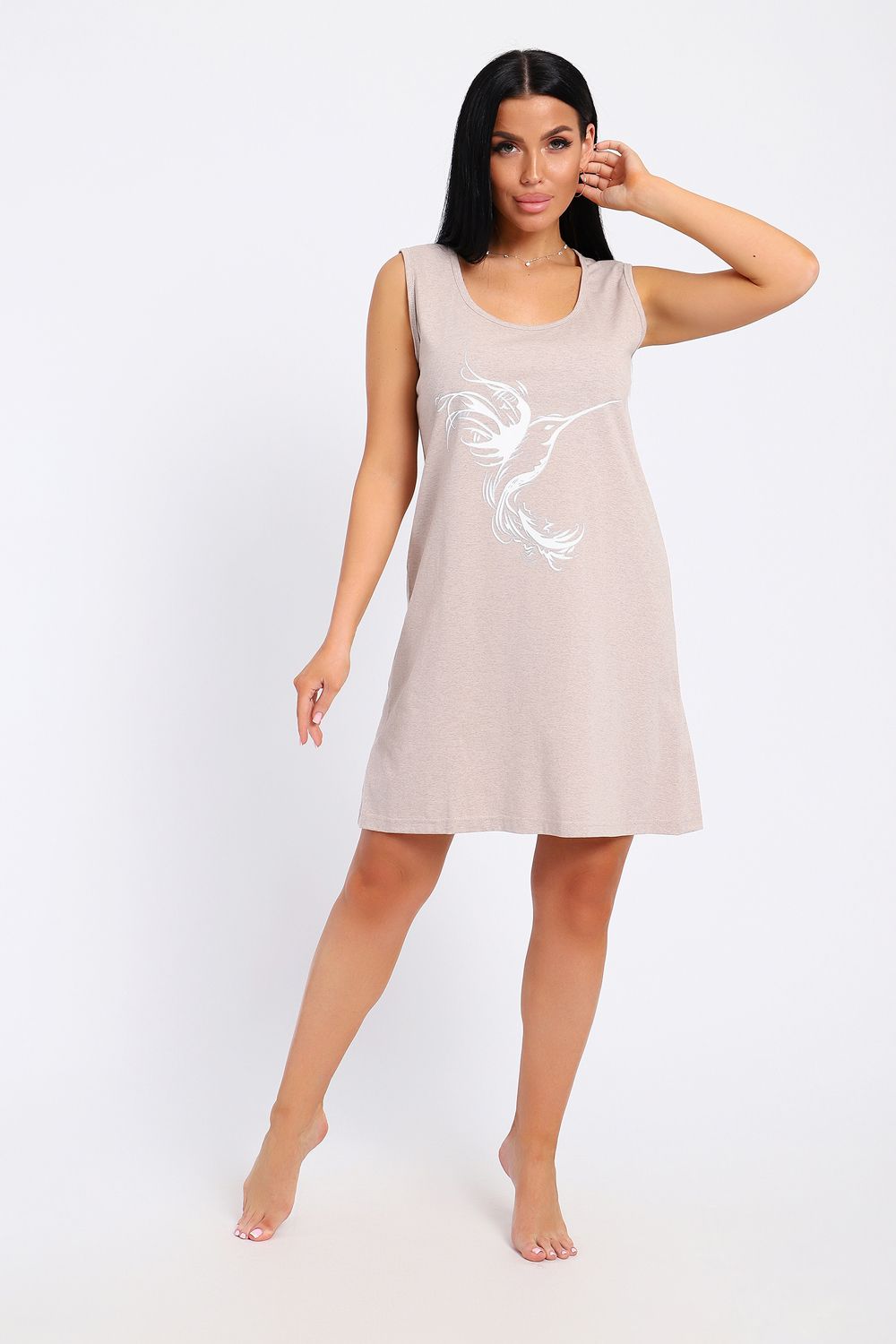 Туника домашняя из однотонной меланжированной кулирки, на передней части изделия расположен принт, горловина круглая, длина туники до колена.