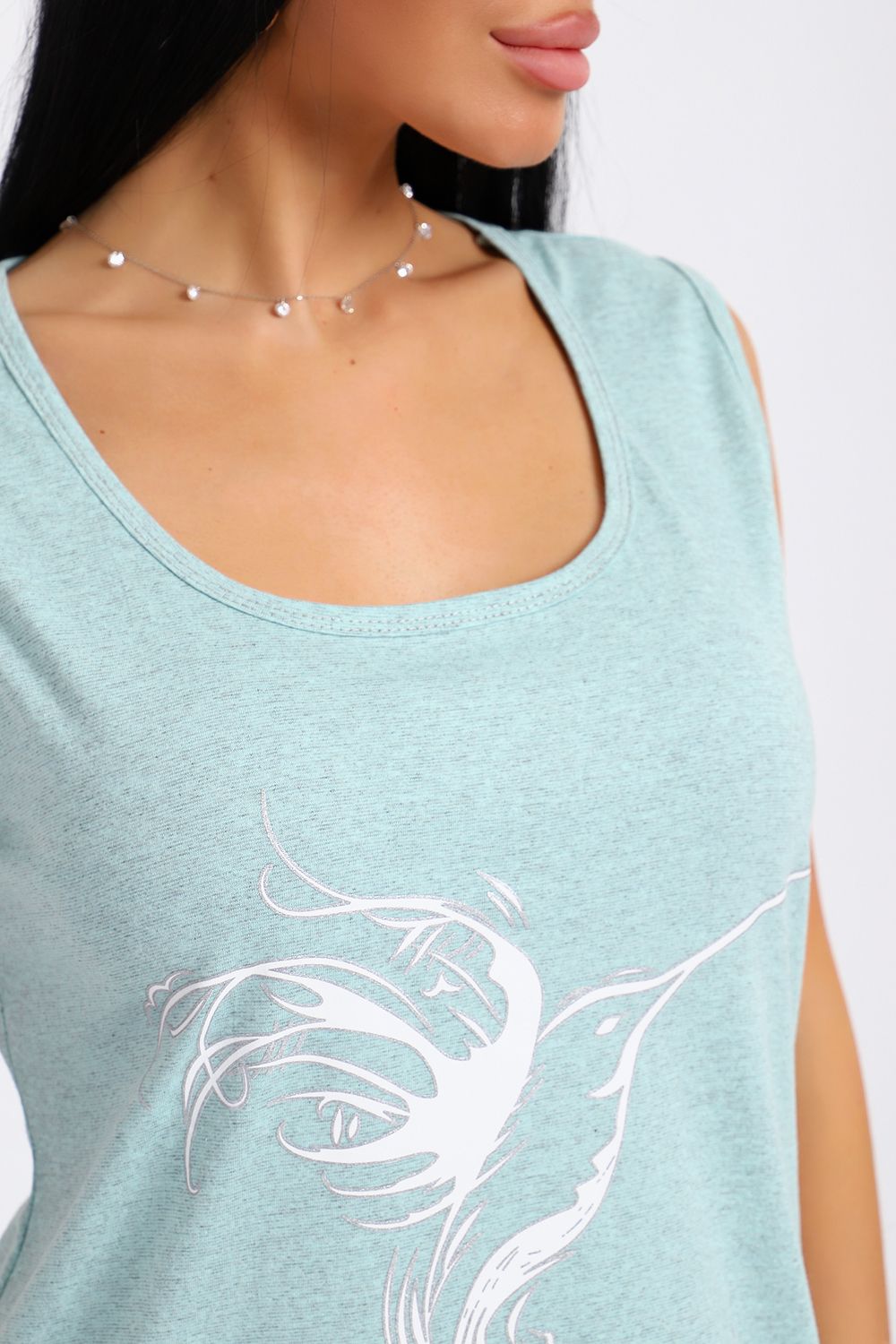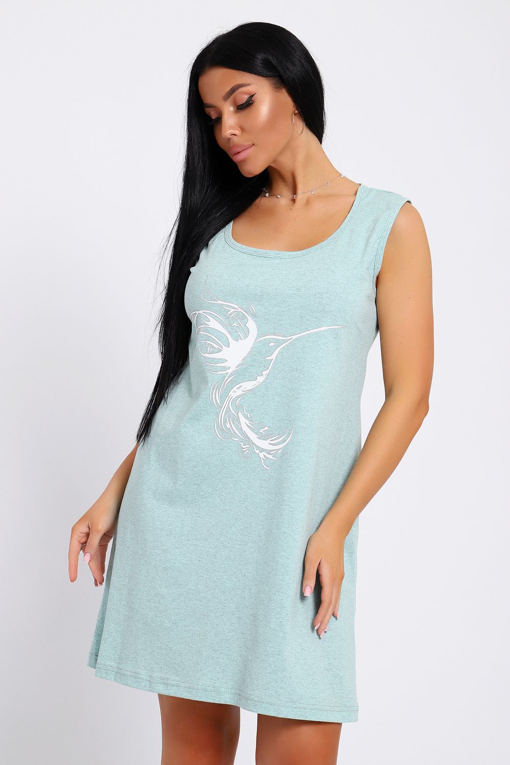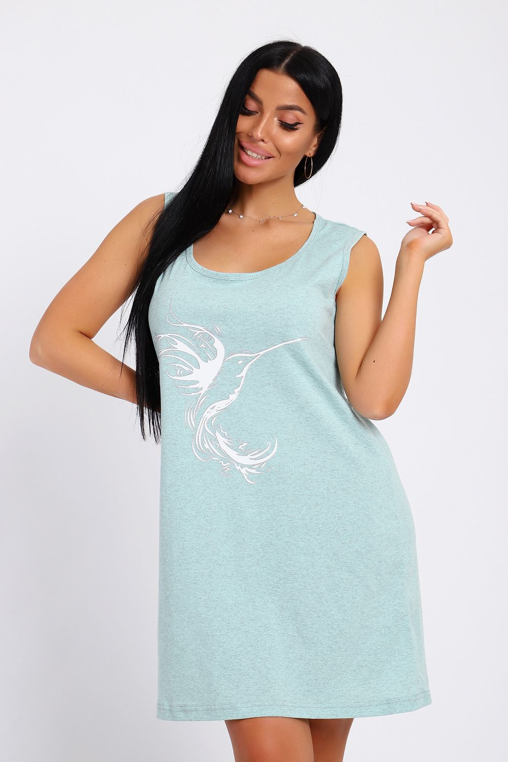 Туника домашняя из однотонной меланжированной кулирки, на передней части изделия расположен принт, горловина круглая, длина туники до колена.