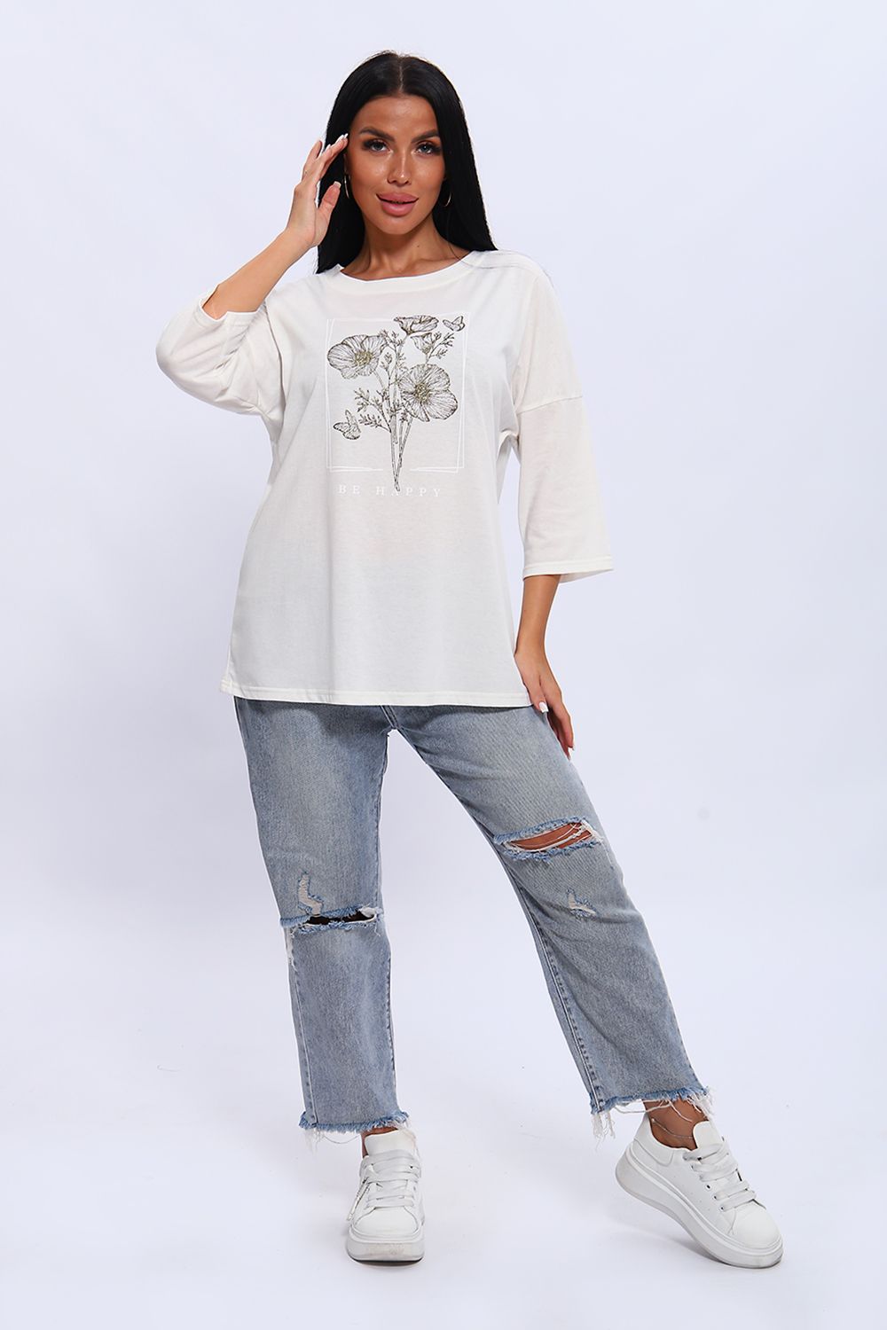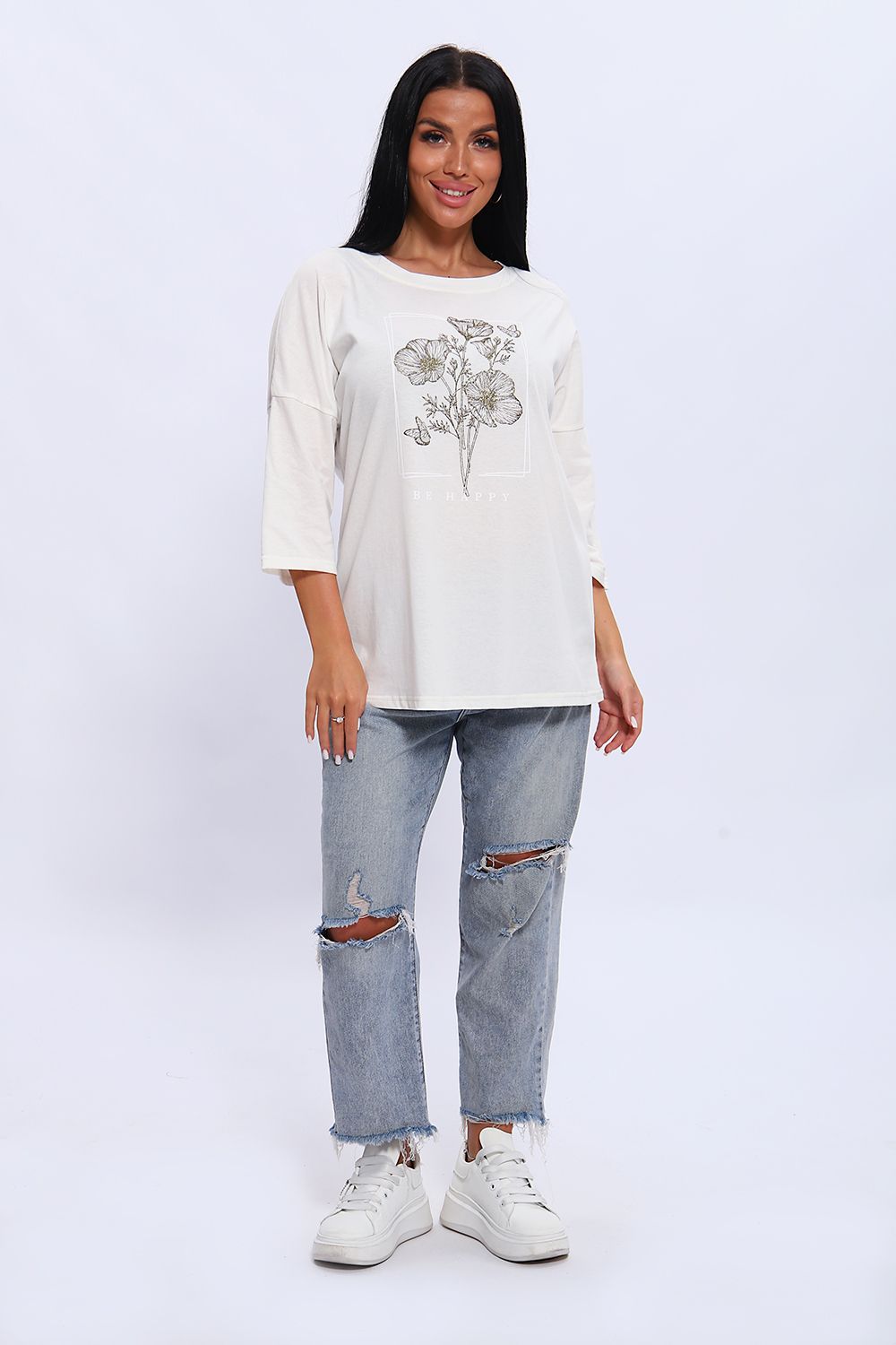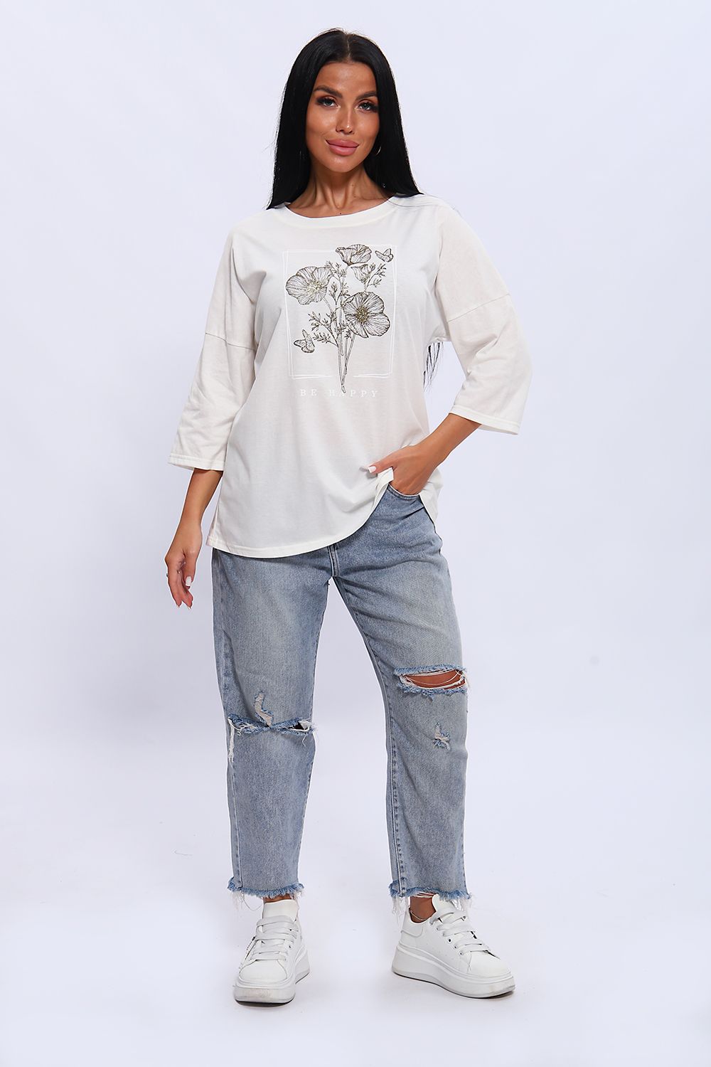 Туника свободного кроя из мягкого, натурального хлопка подарит ощущение комфорта и уюта. Принт маки с использованием глиттера и техники объёмной печати украшает модель, придавая ей изысканный вид. Обработка деталей вкруговую с закрепкой, рукав длиной 3/4, горловина втачная из основной ткани. Большие размеры!