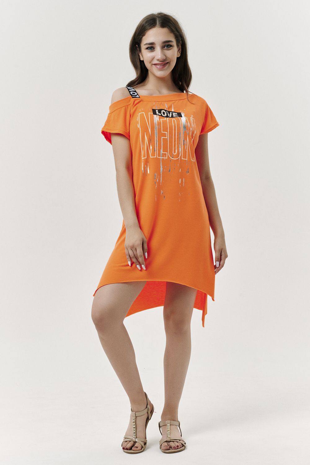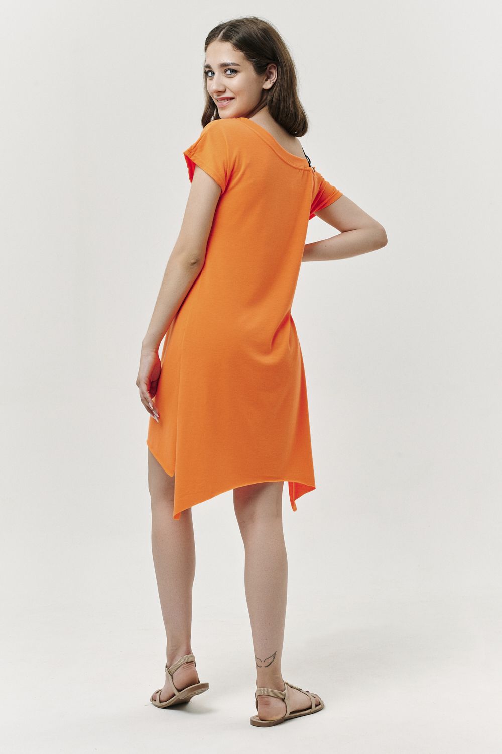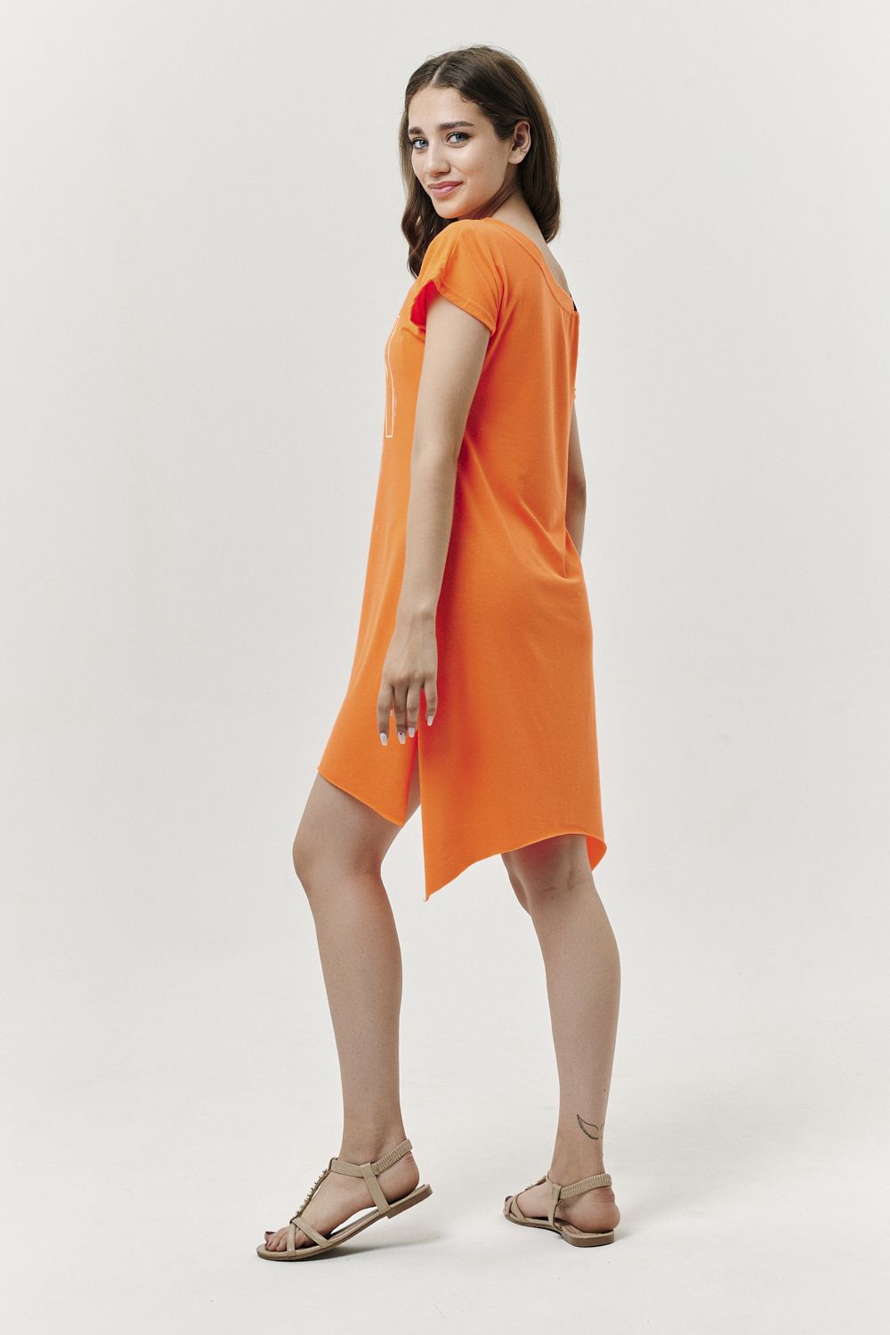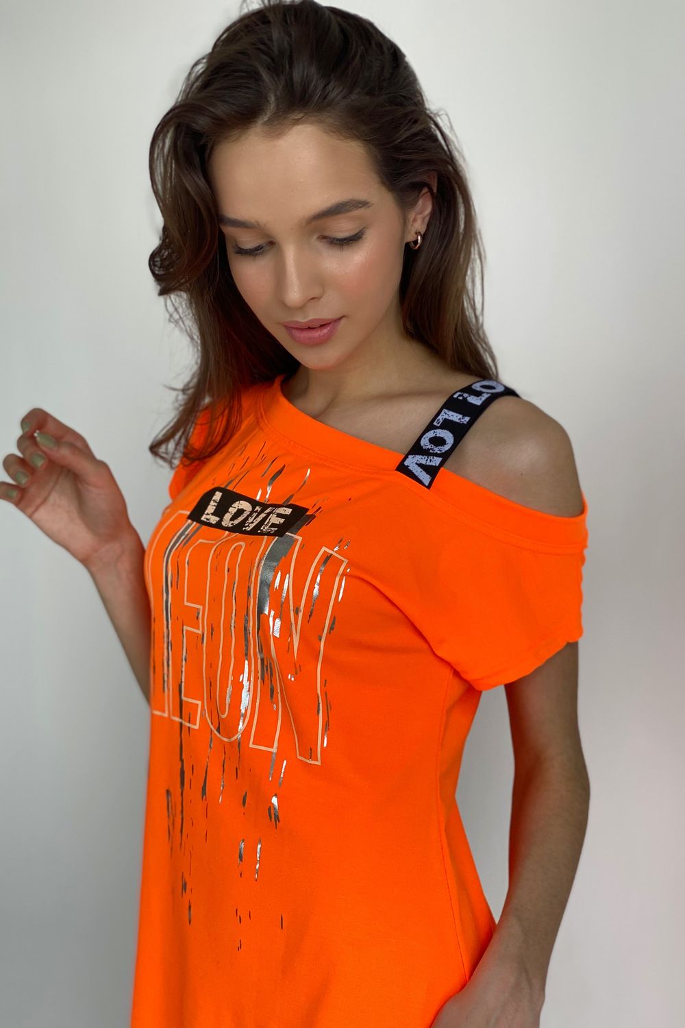 Туника полуприлегающего силуэта, длиной выше колена спереди и удлиненной спинкой сзади, с фигурной линией низа. Рукав цельнокроеный, короткий. В нижней части боковых швов обработаны разрезы. Горловина асимметричная с эластичной бретелью, обработана обтачкой из основного полотна.
