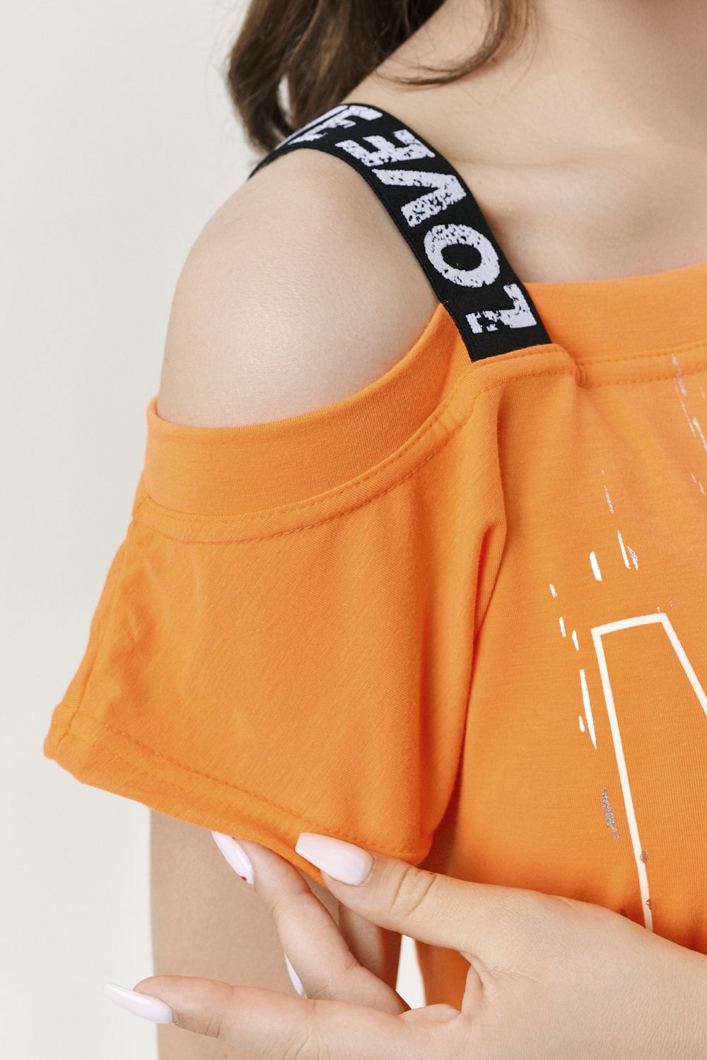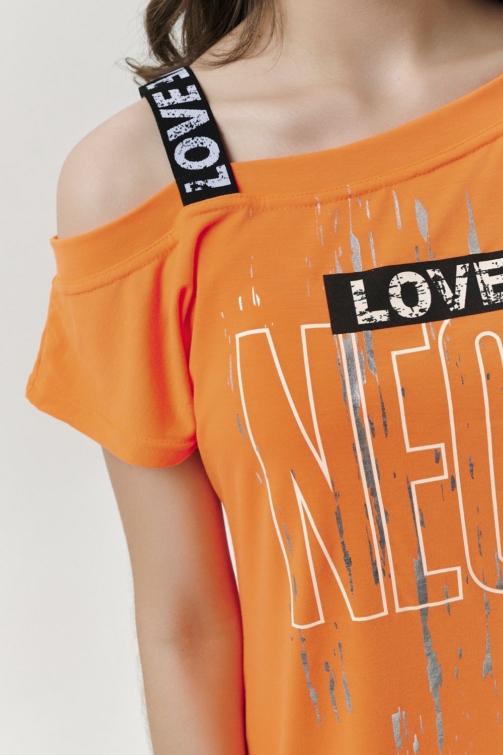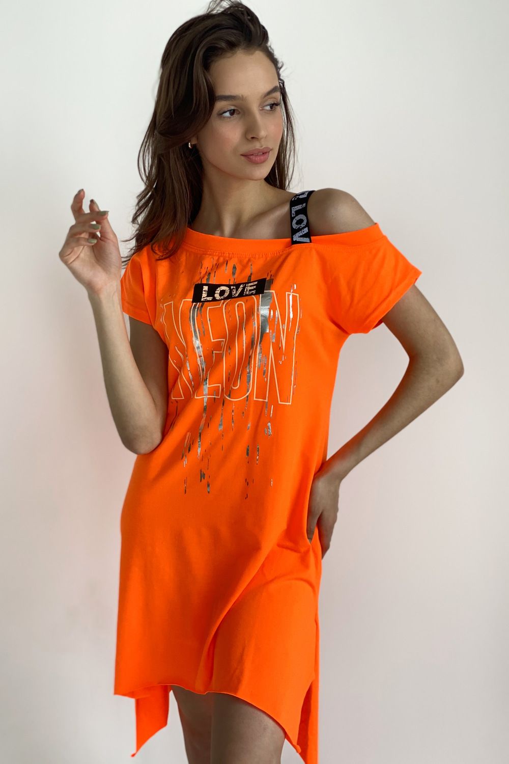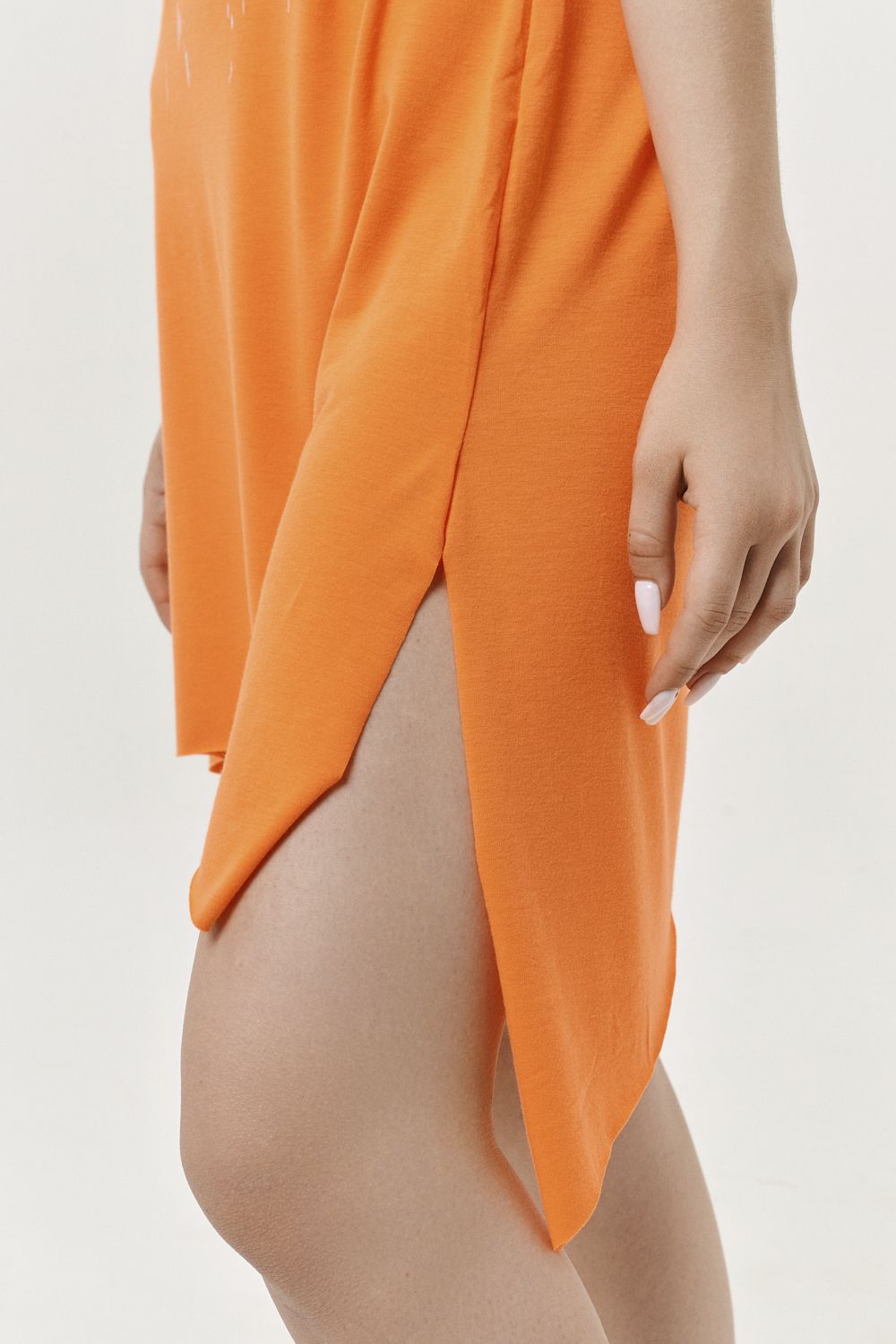 Туника полуприлегающего силуэта, длиной выше колена спереди и удлиненной спинкой сзади, с фигурной линией низа. Рукав цельнокроеный, короткий. В нижней части боковых швов обработаны разрезы. Горловина асимметричная с эластичной бретелью, обработана обтачкой из основного полотна.
