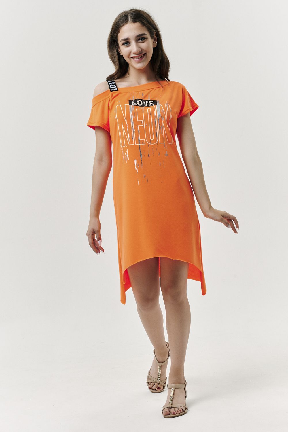 Туника полуприлегающего силуэта, длиной выше колена спереди и удлиненной спинкой сзади, с фигурной линией низа. Рукав цельнокроеный, короткий. В нижней части боковых швов обработаны разрезы. Горловина асимметричная с эластичной бретелью, обработана обтачкой из основного полотна.