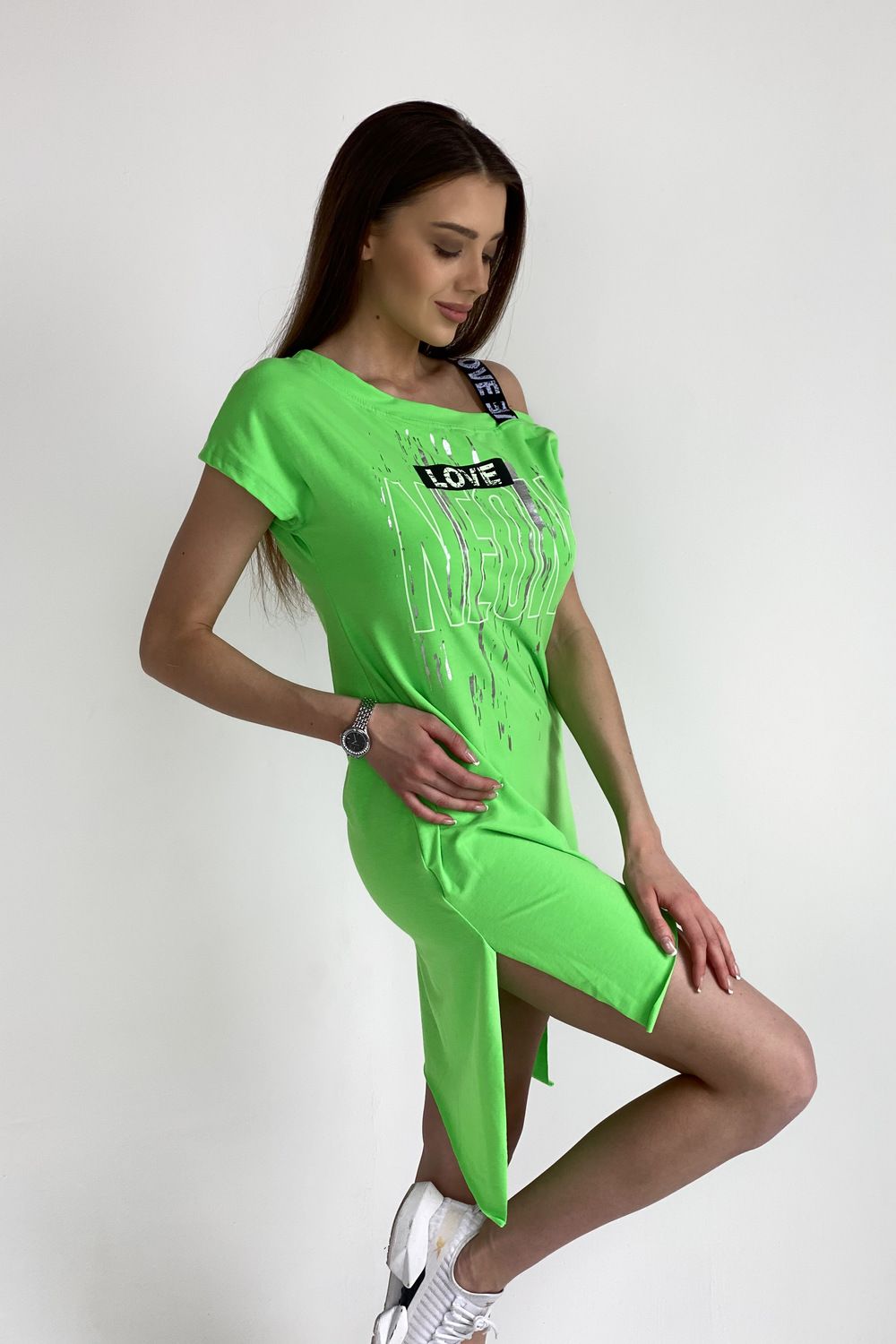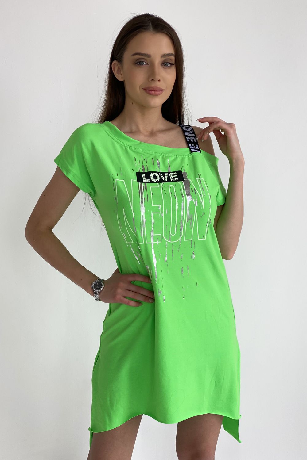 Туника полуприлегающего силуэта, длиной выше колена спереди и удлиненной спинкой сзади, с фигурной линией низа. Рукав цельнокроеный, короткий. В нижней части боковых швов обработаны разрезы. Горловина асимметричная с эластичной бретелью, обработана обтачкой из основного полотна.