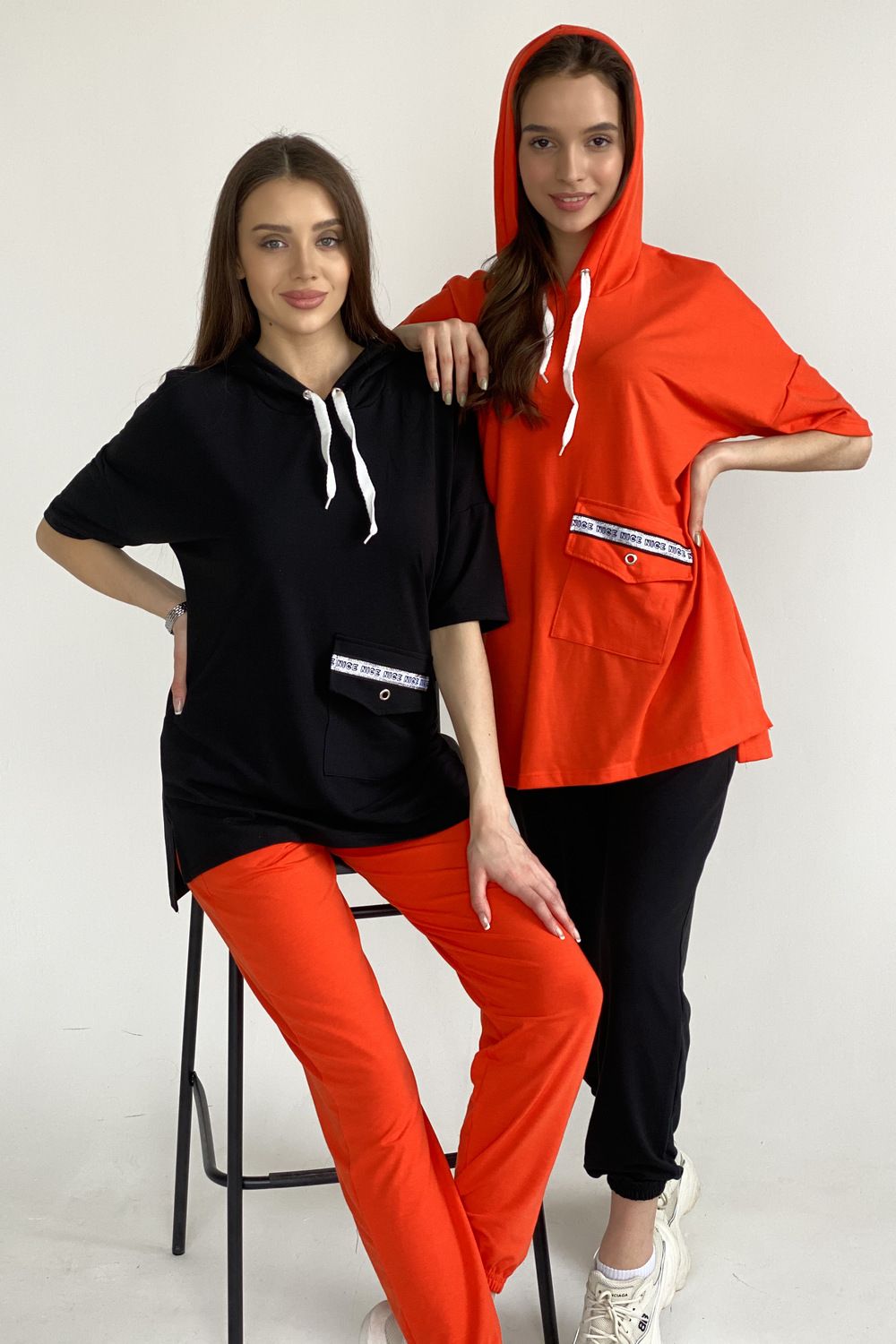 Туника прямая, свободная, с капюшоном, с удлиненной спинкой. Рукав короткий. На полочке расположен накладной карман с клапаном. В нижней части боковых швов обработаны разрезы.