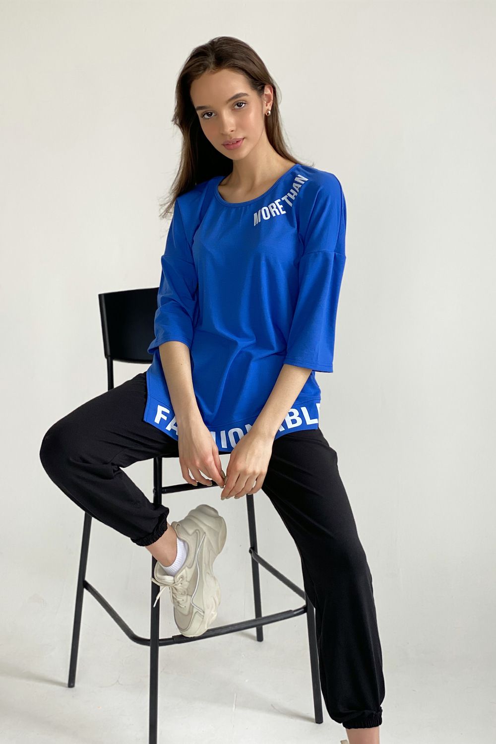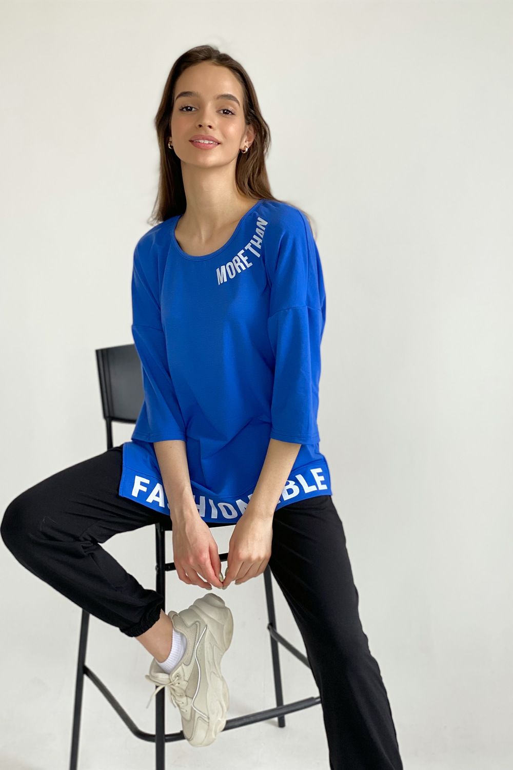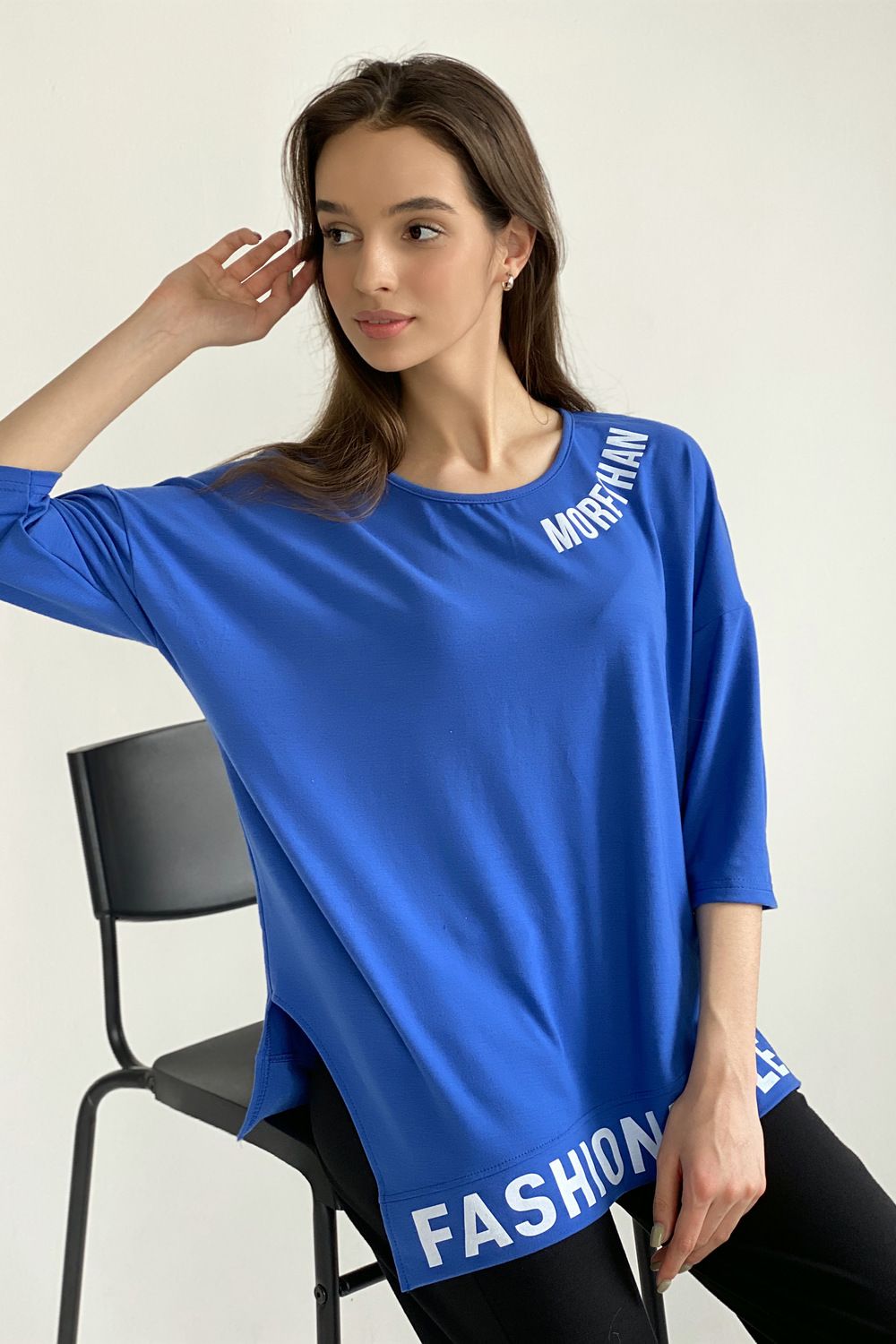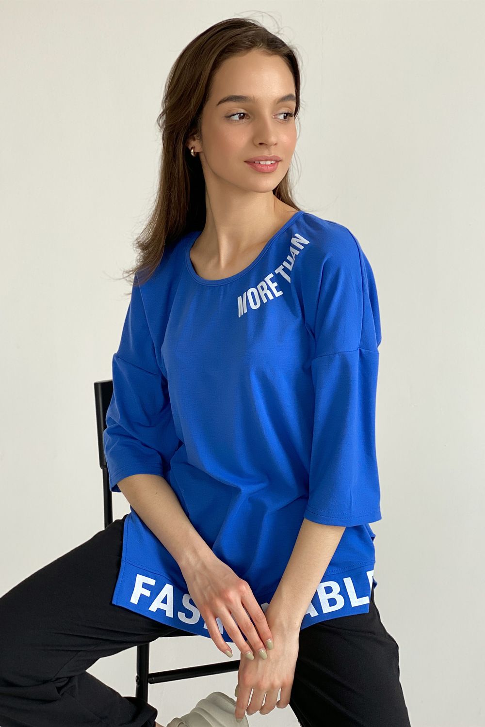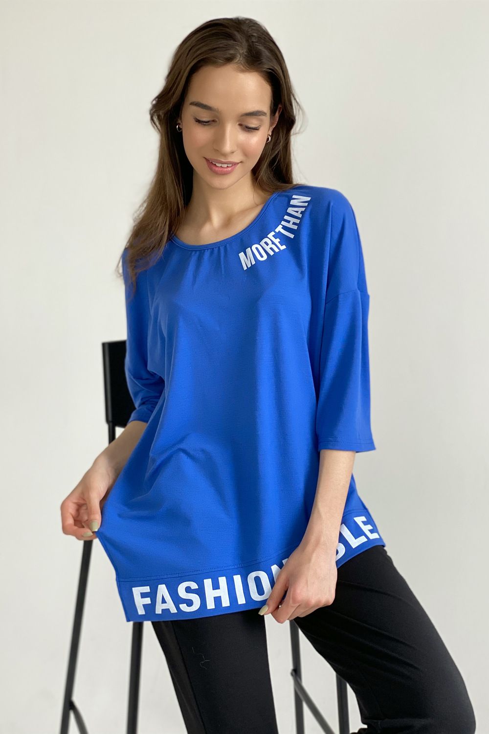 Туника прямая, свободная, с округлой горловиной, с асимметричным низом. Рукав длиной 3/4. Низ полочки и спинки обработаны обтачками. Горловина обработана бейкой из основного полотна.