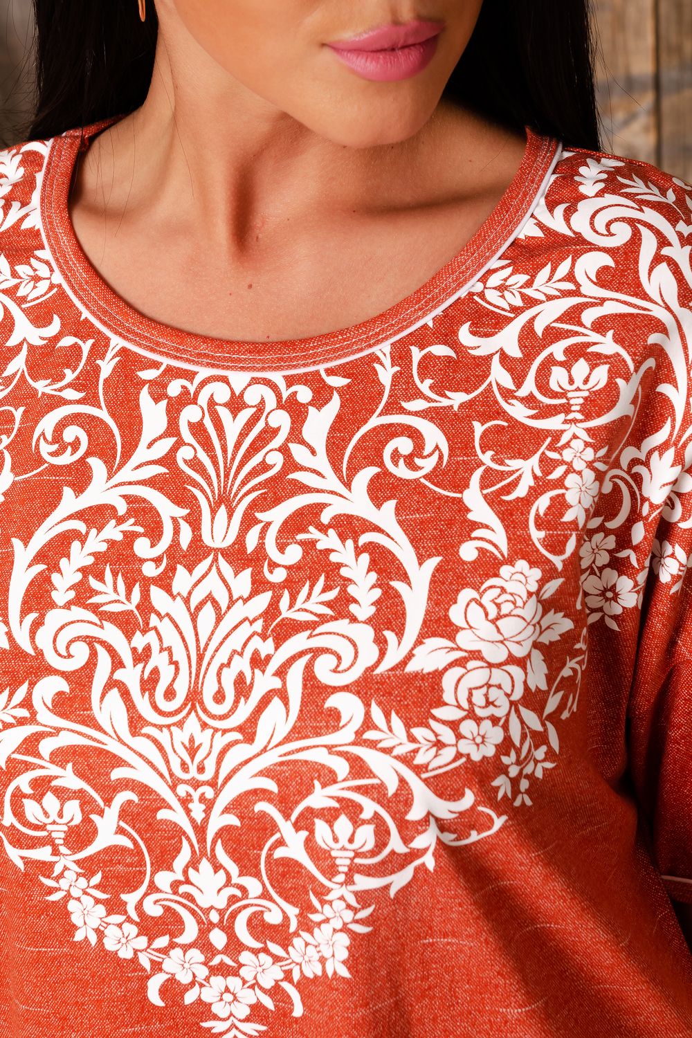Туника прямого силуэта, с округлой горловиной, с разрезами в нижней части боковых швов. Горловина и низ рукавов обработаны бейкой из основного полотна.