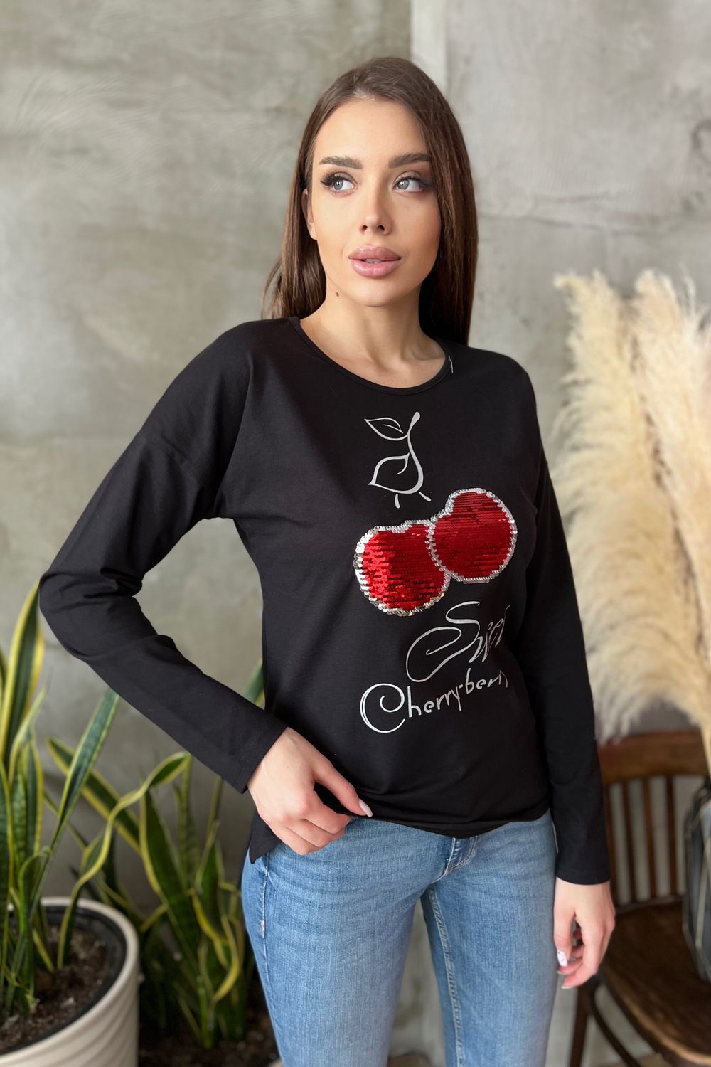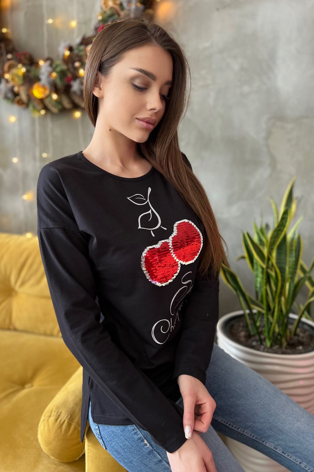 Туника полуприталенного силуэта, с удлиненной спинкой, с округлой горловиной. Рукав длинный. В нижней части боковых швов обработаны разрезы. Горловина обработана бейкой из основного полотна. На полочке эффектная аппликация из пайеток и печать