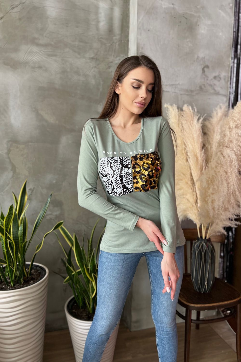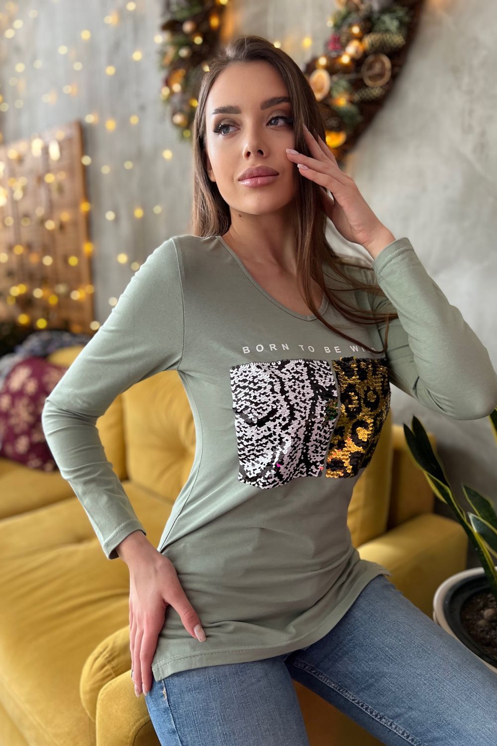 Туника полуприлегающего силуэта, с V-образной горловиной. Рукав втачной, длинный. В нижней части боковых швов обработаны разрезы. Горловина обработана бейкой из основного полотна. На полочке эффектная аппликация из пайеток и печать в виде надписи "born to be wild"
