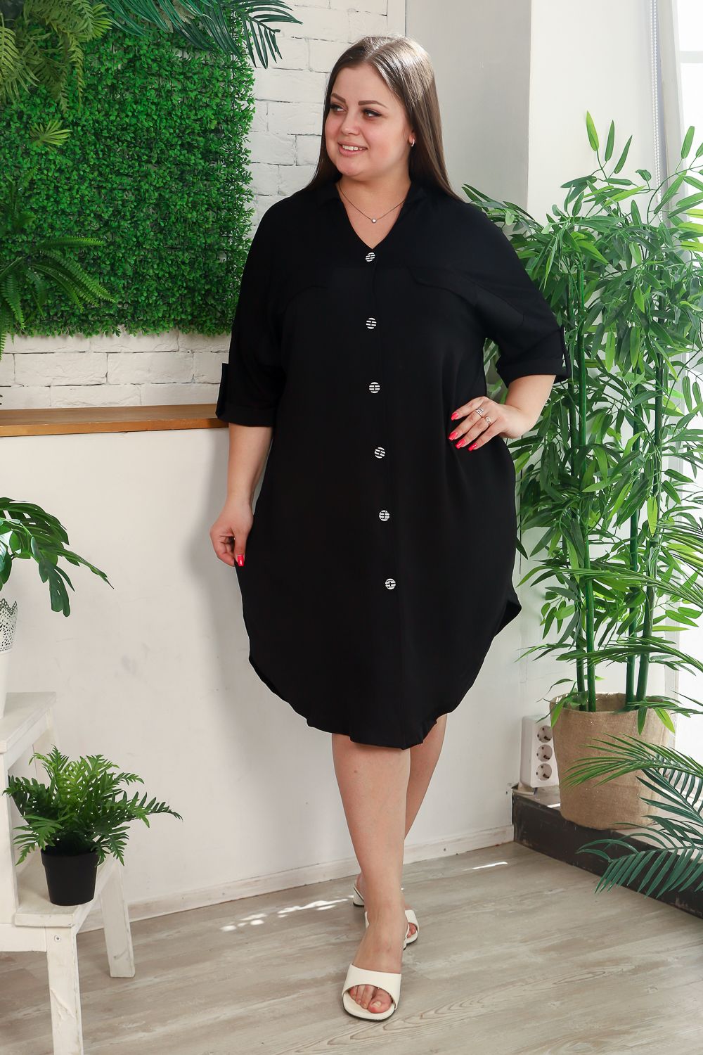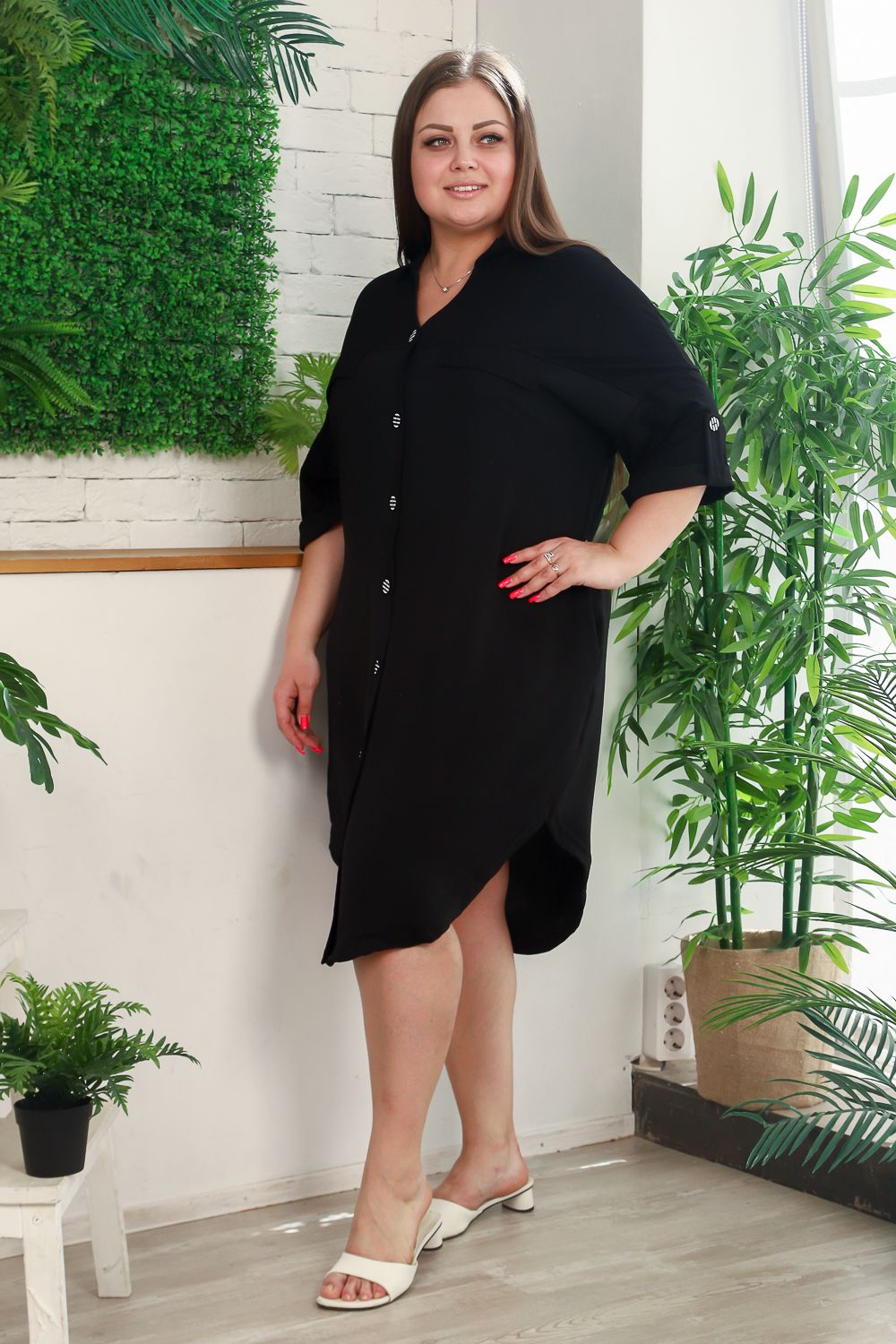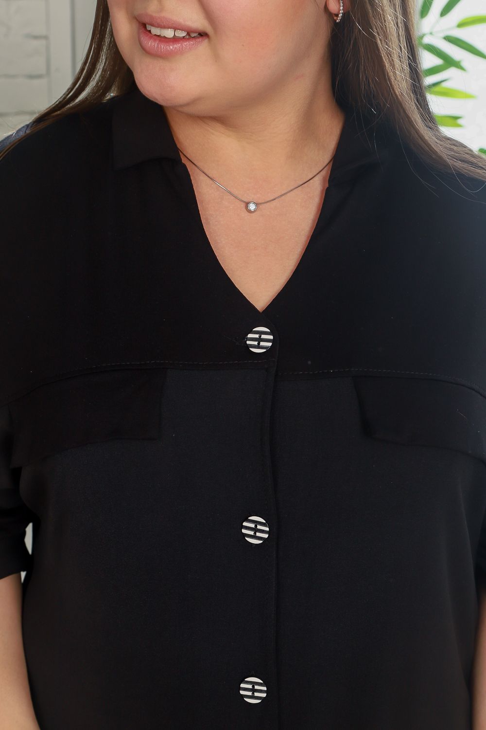 Туника-рубашка на пуговицах, с отложным воротником, свободная, с фигурной линией низа. Рукав короткий, на манжете, с хлястом на пуговице. Полочки с кокетками и клапанами. Спинка с кокеткой и центральной складкой. Верх туники вискоза, низ шифон.