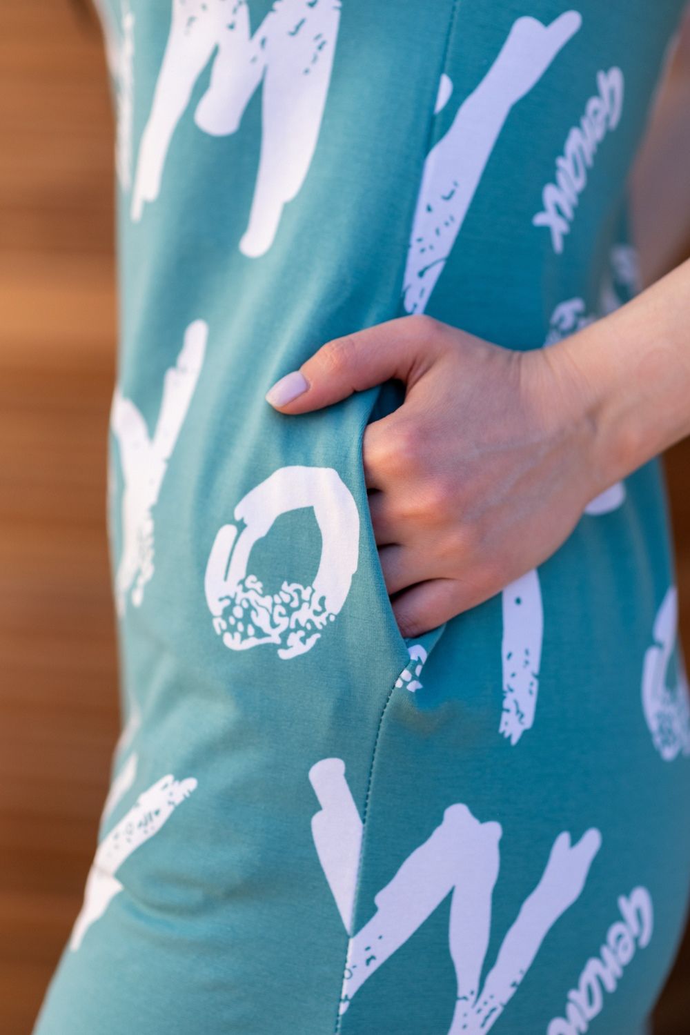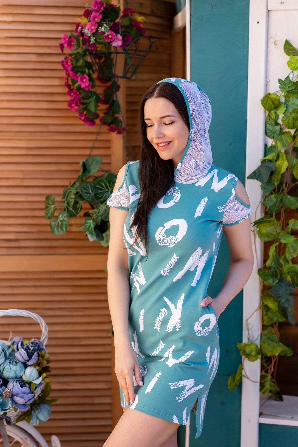Туника полуприлегающего силуэта, длиной выше колена спереди и удлиненной спинкой, с капюшоном из сетки, с карманами в боковом шве. Рукав короткий, из сетки, с фигурным вырезом. В нижней части боковых швов обработаны разрезы. Лицевой край капюшона, фигурные вырезы и низ рукавов обработаны бейкой из основного полотна.